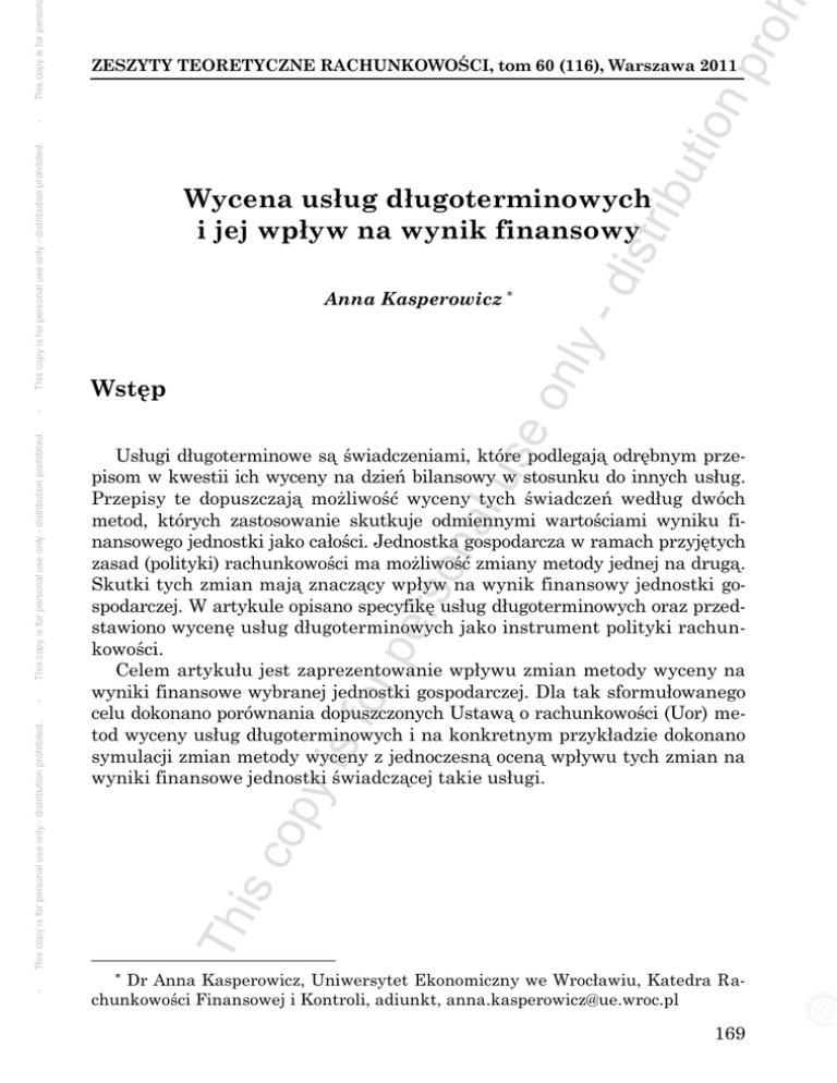 ibu tio np roh This copy is for person on ly - Anna Kasperowicz Wstęp se is c op y is for pe rso na lu Usługi długoterminowe są świadczeniami, które podlegają odrębnym przepisom w kwestii ich wyceny na dzień bilansowy w stosunku do innych usług. Przepisy te dopuszczają możliwość wyceny tych świadczeń według dwóch metod, których zastosowanie skutkuje odmiennymi wartościami wyniku finansowego jednostki jako całości. Jednostka gospodarcza w ramach przyjętych zasad (polityki) rachunkowości ma możliwość zmiany metody jednej na drugą. Skutki tych zmian mają znaczący wpływ na wynik finansowy jednostki gospodarczej. W artykule opisano specyfikę usług długoterminowych oraz przedstawiono wycenę usług długoterminowych jako instrument polityki rachunkowości. Celem artykułu jest zaprezentowanie wpływu zmian metody wyceny na wyniki finansowe wybranej jednostki gospodarczej. Dla tak sformułowanego celu dokonano porównania dopuszczonych Ustawą o rachunkowości (Uor) metod wyceny usług długoterminowych i na konkretnym przykładzie dokonano symulacji zmian metody wyceny z jednoczesną oceną wpływu tych zmian na wyniki finansowe jednostki świadczącej takie usługi. Th This copy is for personal use only - distribution prohibited. This copy is for personal use only - distribution prohibited. - dis tr Wycena usług długoterminowych i jej wpływ na wynik finansowy - This copy is for personal use only - distribution prohibited. - ZESZYTY TEORETYCZNE RACHUNKOWOŚCI, tom 60 (116), Warszawa 2011 Dr Anna Kasperowicz, Uniwersytet Ekonomiczny we Wrocławiu, Katedra Rachunkowości Finansowej i Kontroli, adiunkt, [email protected] 169 ibu tio np roh This copy is for person - is c op y is for pe rso na lu se on ly - dis tr Zasada ciągłości to jedna z nadrzędnych zasad rachunkowości, których przestrzeganie zapewnia wysoką jakość sprawozdań finansowych. Zgodnie z art. 5 pkt 1 Uor przyjęte zasady (politykę) rachunkowości należy stosować w sposób ciągły, dokonując w kolejnych latach obrotowych: jednakowego grupowania operacji gospodarczych (kwalifikowania określonych składników aktywów i pasywów do poszczególnych kategorii, kwalifikowania określonych grup operacji gospodarczych do przychodów z podstawowej działalności operacyjnej lub pozostałej, czy do finansowej), jednakowej wyceny aktywów i pasywów, w tym także dokonywania odpisów amortyzacyjnych lub umorzeniowych, jednakowego ustalania wyniku finansowego i sporządzania sprawozdań finansowych, tak aby za kolejne lata informacje z nich wynikające były porównywalne, a wykazane w księgach rachunkowych na dzień ich zamknięcia stany aktywów i pasywów należy ująć w tej samej wysokości, w otwartych na następny rok obrotowy księgach rachunkowych. Podobne sformułowania zostały zawarte w „Założeniach koncepcyjnych sporządzania i prezentacji sprawozdań finansowych” (Międzynarodowe Standardy Sprawozdawczości Finansowej (MSSF), 2007, tom 1, s. 56) oraz w Międzynarodowym Standardzie nr 1 „Prezentacja sprawozdań finansowych (MSSF, 2007, tom 1, s. 412). Ze wszystkich wymienionych uregulowań wynika, że zasada ciągłości polega na kontynuowaniu w roku bieżącym rozwiązań przyjętych w roku poprzednim, przy czym ciągłość można podzielić na dwa rodzaje, mianowicie na ciągłość formalną i merytoryczną. Przestrzeganie ciągłości formalnej polega na kontynuowaniu z roku na rok tej samej struktury sprawozdania finansowego oraz formy prezentacji zawartych w nim informacji. Ciągłość merytoryczna polega na stosowaniu z roku na rok jednakowych zasad wyceny aktywów i pasywów, ustalania wyniku finansowego oraz sporządzania rachunku przepływów pieniężnych. Przestrzeganie zasady ciągłości w sporządzaniu sprawozdań finansowych umożliwia ich porównywanie w czasie. Porównywalność sprawozdań finansowych to jedna z jakościowych ich cech, wymieniona w „Założeniach koncepcyjnych sporządzania i prezentacji sprawozdań finansowych” (MSSF, 2007, tom 1, s. 52). Aby zachować porównywalność sprawozdań finansowych sporządzanych za kolejne okresy sprawozdawcze, jest konieczne informowanie ich czytelników o dokonanych zmianach o charakterze formalnym i merytorycznym wraz ze skutkami tych zmian. Zachowanie zasady ciągłości nie oznacza jednak dla podmiotu gospodarczego, że nie ma prawa dokonywać żadnych zmian w przyjętych wcześniej zasadach (polityce) rachunkowości (art. 8 pkt 2 Uor). Zmiany zasad mogą być Th This copy is for personal use only - distribution prohibited. - This copy is for personal use only - distribution prohibited. - This copy is for personal use only - distribution prohibited. - 1. Zasada ciągłości a porównywalność sprawozdań finansowych 170 ibu tio np roh dis tr on ly - se lu na rso pe for y is op is c Th This copy is for person This copy is for personal use only - distribution prohibited. This copy is for personal use only - distribution prohibited. This copy is for personal use only - distribution prohibited. - skutkiem zmian przepisów prawa, bądź zmian dokonywanych we własnym zakresie przez daną jednostkę gospodarczą. Pierwsze zmiany wynikają z zewnętrznych uwarunkowań, na które jednostka gospodarcza nie ma wpływu i występują stosunkowo rzadko. Drugie natomiast, podjęte we własnym zakresie przez podmiot, są możliwe, gdy jednocześnie są spełnione trzy warunki, czyli: a) zapewniają lepszy obraz rzeczywistości, bardziej wierne odzwierciedlenie sytuacji majątkowej, finansowej lub wyniku finansowego, b) zmiana następuje od pierwszego dnia roku obrotowego, a nie w jego ciągu, c) w dodatkowej informacji i objaśnieniach zostaną wykazane rodzaj i przyczyny zmian oraz ich wpływ liczbowy na wynik finansowy roku obrotowego, a także doprowadzenie do porównywalności danych sprawozdania finansowego za rok poprzedzający rok sprawozdawczy, w którym nastąpiła zmiana (Fedak, 2009, s. 24). Najcz