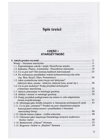 Spis treści CZĘŚĆ I STAROŻYTNOŚĆ 1. Antyk grecko-rzymski Wstęp - literatura starożytna 1.1. Najważniejsze szkoły i prądy filozoficzne antyku 1.2. Sokrates, Platon, Arystoteles - filozofowie starożytni 1.3. Co to jest mit? Mit syntezą ludzkich doświadczeń 1.4. Na wybranym przykładzie wskaż kulturotwórczą rolę mitu (np. Ikar, Syzyf, Odys, Prometeusz) 1.5. Jakie symboliczne treści kryje mit labiryntu? (labirynt słów, miasto - labirynt, labirynt losu, uczuć itp.) 1.6. Co to jest archetyp? Podaj przykład archetypów z literatury starożytnej 1.7. Motyw przemiany w mitologii greckiej 1.8. Miłość i śmierć w mitologii greckiej 1.9. Podaj przykład posługiwania się mitem w celu objaśnienia świata współczesnego 1.10. Mitologia jako źródło tematów w literaturze późniejszych epok 1.11. Co to jest „mimesis"? Posłuż się przy objaśnieniu pojęcia koncepcjami estetycznymi i przykładami z literatury starożytnej Grecji 1.12. Grecki kanon piękna - rzeźba antyczna 1.13. Odyseusz jako inspiracja literackiego motywu wędrowca (homo viator) 1.14. Baśniowość „Odysei" Homera 1.15. Bogowie i ludzie w „Iliadzie" Homera 11 11 15 19 23 26 28 32 36 39 41 43 46 48 50 53 55 5 1.16. 1.17. 1.18. 1.19. Świat na tarczy Achillesa Początki teatru antycznego (tragedia, komedia) Uniwersalny wymiar sporu w „Antygonie" Sofoklesa „Antygona" a „Odprawa posłów greckich" - tematyka, problematyka, budowa 1.20. Przedstawiciele greckiej liryki antycznej 1.21. „Homer żeńskiego rodu" - Safona 1.22. Horacy - mistrz eolskiej lutni 1.23. Wergiliusz - jeden z największych poetów świata 1.24. Owidiusz - najwybitniejszy elegik epoki augustowskiej 1.25. Obraz dwóch światów - pogańskiego i wczesnochrześcijańskiego w „Quo vadis" Henryka Sienkiewicza 1.26. Analizując postaci, wyjaśnij tytuł powieści H. Sienkiewicza „Quo vadis" 2. Biblia 2.1. Budowa, znaczenie, czas powstania, podział 2.2. Porównaj kosmogonię biblijną i mitologiczną 2.3. Wygnanie z Raju i jego konsekwencje 2.4. Rzeczywistość po Raju 2.5. Przymierza biblijne 2.6. Problem cierpienia w Księdze Hioba 2.7. Czy Kohelet jest pesymistą? 2.8. Psalmy jako fenomen modlitwy i wiary 2.9. „Pieśń nad pieśniami" jako poemat miłosny 2.10. Charakterystyka wybranych postaci ze Starego Testamentu 2.11. Charakterystyka wybranych postaci z Nowego Testamentu 2.12. Motyw Narodzenia Pańskiego w literaturze różnych epok 2.13. Uniwersalny wymiar przypowieści biblijnych 2.14. Inspirujący charakter przypowieści o synu marnotrawnym 2.15. Prometeusz i Jezus, czyli oddanie jednostki dla dobra ludzkości 2.16. Jezus - Bóg i człowiek 2.17. Trudna etyka miłości w Nowym Testamencie 2.18. Obraz końca świata w Apokalipsie Św. Jana 2.19. Jak Biblia widzi istotę człowieczeństwa? 2.20. Postać Boga w Starym i Nowym Testamencie 2.21. Obraz Szatana w Biblii 2.22. Kulturotwórcza rola Biblii 6 57 60 62 64 67 70 72 75 77 79 82 85 85 87 88 90 93 95 98 100 103 106 108 111 114 116 119 120 122 124 126 128 130 132 CZĘŚĆ II ŚREDNIOWIECZE Wstęp do epoki 136 1. Teocentryzm i uniwersalizm jako cechy kultury średniowiecza 141 2. Filozofia średniowieczna i jej odzwierciedlenie w literaturze 143 3. Hagiografia średniowieczna. Jakie warunki musieli spełniać bohaterowie żywotów, żeby osiągnąć świętość? 147 4. Dwa rodzaje średniowiecznej ascezy (św. Aleksy i św Franciszek).... 150 5. Średniowieczny rycerz i asceta - próba porównania (na podstawie „Pieśni o Rolandzie" i „Legendy o św. Aleksym") 152 6. Epos rycerski - feudalna hierarchia wartości 154 7. Prawzór śmierci heroicznej w „Pieśni o Rolandzie" 157 8. Portret idealnego władcy w literaturze polskiej i obcej 160 9. Średniowieczna historiografia 164 10. Średniowieczni kochankowie 168 11. „Bogurodzica" - arcydzieło poezji średniowiecznej 171 12. Co można powiedzieć o autorze „Bogurodzicy" na podstawie analizy tekstu? 173 13. Matka Chrystusa po ludzku cierpiąca w „Posłuchajcie, bracia miła..." 174 14. Motywy maryjne w sztuce średniowiecza 176 15. Wizerunek śmierci w sztuce średniowiecza 178 16. Motyw przemijania w twórczości F. Villona 180 17. Memento moń - czyli literatura średniowieczna o umieraniu 182 18. Tematyka społeczno - obyczajowa w literaturze polskiego średniowiecza 185 19. Dydaktyzm literatury średniowiecza 188 20. Czy słuszna jest formuła „mroki średniowiecza"? 191 21. Dantejska wizja zaświatów w „Boskiej Komedii" 194 22. Między średniowieczem a renesansem, czyli „Boska Komedia" Dantego 199 23. Opis obyczajowości średniowiecznej w „Krystynie córce Lavransa" Sigrid Undset 202 24. Pomiędzy wiarą a człowieczeństwem, czyli jak Sigrid Undset opowiada o średniowieczu w „Krystynie córce Lavransa" 205 25. Średniowiecze w ujęciu twórców późniejszych epok 207 7