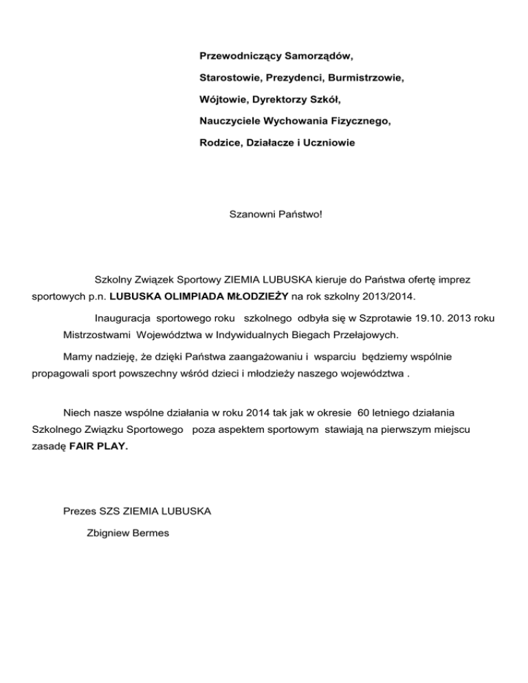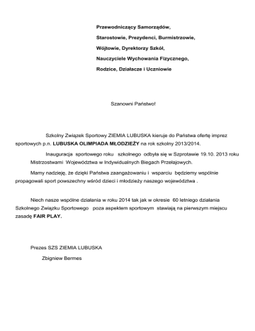 Przewodniczący Samorządów, Starostowie, Prezydenci, Burmistrzowie, Wójtowie, Dyrektorzy Szkół, Nauczyciele Wychowania Fizycznego, Rodzice, Działacze i Uczniowie Szanowni Państwo! Szkolny Związek Sportowy ZIEMIA LUBUSKA kieruje do Państwa ofertę imprez sportowych p.n. LUBUSKA OLIMPIADA MŁODZIEŻY na rok szkolny 2013/2014. Inauguracja sportowego roku szkolnego odbyła się w Szprotawie 19.10. 2013 roku Mistrzostwami Województwa w Indywidualnych Biegach Przełajowych. Mamy nadzieję, że dzięki Państwa zaangażowaniu i wsparciu będziemy wspólnie propagowali sport powszechny wśród dzieci i młodzieży naszego województwa . Niech nasze wspólne działania w roku 2014 tak jak w okresie 60 letniego działania Szkolnego Związku Sportowego poza aspektem sportowym stawiają na pierwszym miejscu zasadę FAIR PLAY. Prezes SZS ZIEMIA LUBUSKA Zbigniew Bermes LUBUSKA OLIMPIADA MŁODZIEŻY TERMINARZ SZKOLNYCH IMPREZ SPORTOWYCH NA ROK SZKOLNY 2013/2014 SZKOŁY PODSTAWOWE (13 lat i młodsi) Dyscyplina Rejon Półfinał Finał wojewódzki Finał Ogólnopolski Mini koszykówka DO dziewcząt i chłopców 10 MARCA 2014 DO 21 MARCA 2014 DO 16 KWIETNIA 2014 GDAŃSK 12-15.06. 2014 Mini siatkówka „4” DO dziewcząt i chłopców 10 MARCA 2014 DO 21 MARCA 2014 DO 16 KWIETNIA 2014 GŁUCHOŁAZY 11-15.06.2014 Mini piłka ręczna DO dziewcząt i chłopców 10 MARCA 2014 DO 21 MARCA 2014 DO 16 KWIETNIA 2014 GŁUCHOŁAZY 23-26.06.2014 Unihokej DO dziewcząt i chłopców 10 MARCA 2014 DO 21 MARCA 2014 DO 16 KWIETNIA 2014 ELBLĄG MAJ 2014 Mini piłka nożna dziewcząt i chłopców DO 09 MAJA 2014 DO 31 MAJA 2014 GŁUCHOŁAZY 16-18.06.2014 Tenis stołowy DO 31 MARCA 2014 DO 30 KWIETNIA 2014 RAWA MAZOWIECKA 2224.05.2014 DO 31 MARCA 2014 DO 30 KWIETNIA 2014 BIAŁYSTOK CZERWIEC 2014 SULECHÓW SZKLARSKA PORĘBA 23-29.05.2014 dziewcząt i chłopców Badminton dziewcząt i chłopców Szachy zespoły mieszane Sztafetowe biegi przełajowe 12.04.2014 dziewcząt i chłopców 4-bój LA CZERWIEC 2014 dziewcząt i chłopców Indywidualne biegi przełajowe I POŁOWA WRZESNIA 2014 dziewcząt i chłopców Lekka Atletyka „Dzieci Starsze” dziewcząt i chłopców CZERWIEC 2014 OLECKO CZERWIEC 2014 GIMNAZJADA (14-16 LAT) Dyscyplina Koszykówka dziewcząt i chłopców Siatkówka dziewcząt i chłopców Piłka ręczna dziewcząt i chłopców Unihokej dziewcząt i chłopców Piłka nożna dziewcząt i chłopców Tenis stołowy dziewcząt i chłopców Badminton dziewcząt i chłopców Półfinał Finał wojewódzki DO DO 21 MARCA 2014 DO 16 KWIETNIA 2014 DO 21 MARCA 2014 DO 16 KWIETNIA 2014 DO 21 MARCA 2014 DO 16 KWIETNIA 2014 DO 21 MARCA 2014 DO 16 KWIETNIA 2014 ELBLĄG MAJ 2014 DO 09 MAJA 2014 DO 31 MAJA 2014 GŁUCHOŁAZY 20-22.06.2014 DO 31 MARCA 2014 DO 30 KWIETNIA 2014 DRZONKÓW MAJ 2014 DO 31 MARCA 2014 DO BIAŁYSTOK 30 KWIETNIA 2014 CZERWIEC 2014 10 MARCA 2014 DO 10 MARCA 2014 DO 10 MARCA 2014 DO 10 MARCA 2014 Szachy zespoły mieszane Sztafetowe biegi przełajowe Finał Ogólnopolski Rejon SULECHÓW KOŁOBRZEG 19-25.06.2014 SZKLARSKA PORĘBA 23-29.05.2014 12.04.2014 dziewcząt i chłopców Indywidualne biegi przełajowe I POŁOWA WRZESNIA 2014 dziewcząt i chłopców Lekka Atletyka „Młodzik” CZERWIEC 2014 dziewcząt i chłopców Szkolna Liga LA CZERWIEC 2014 dziewcząt i chłopców BIAŁYSTOK 20-21.06.2014 LICEALIADA (uczniowie dziennych szkół ponadgimnazjalnych) Dyscyplina Koszykówka dziewcząt i chłopców Siatkówka dziewcząt i chłopców Piłka ręczna dziewcząt i chłopców Unihokej dziewcząt i chłopców Tenis stołowy dziewcząt i chłopców Badminton dziewcząt i chłopców Rejon Półfinał Finał wojewódzki DO DO 21 MARCA 2014 DO 16 KWIETNIA 2014 10 MARCA 2014 DO DO 21 MARCA 2014 10 MARCA 2014 DO DO 16 KWIETNIA 2014 DO 21 MARCA 2014 DO 16 KWIETNIA 2014 DO 21 MARCA 2014 DO 16 KWIETNIA 2014 DO 21 MARCA 2014 DO 16 KWIETNIA 2014 DO 21 MARCA 2014 DO 16 KWIETNIA 2014 10 MARCA 2014 Szachy zespoły mieszane SULECHÓW Finał Ogólnopolski GŁUCHOŁAZY 22-25.06.14 GORLICE 28-30.05.14 MAŁOPOLSKA OSTRÓDA CZERWIEC 2104 ELBLĄG MAJ 2014 SZKLARSKA PORĘBA 23-29.05.2014 Sztafetowe biegi przełajowe dziewcząt i chłopców Indywidualne biegi przełajowe 12.04.2014 I POŁOWA WRZESNIA 2014 dziewcząt i chłopców Lekka Atletyka „Junior i Jun. mł.” dziewcząt i chłopców Liga Korespondencyjna LA dziewcząt i chłopców II POŁOWA MAJA 2014 RZESZÓW WRZESIEN 2014 ZASADY AWANSOWANIA W LUBUSKIEJ OLIMPIADZIE MŁODZIEŻY IGRZYSKA, GIMNAZJADA, LICEALIADA DYSCYPLINA PÓŁFINAŁ FINAŁ 1 i 2 miejsce z rejonu 1 i 2 miejsce z półfinału 1 i 2 miejsce z rejonu 1 i 2 miejsce z półfinału 1 i 2 miejsce z rejonu 1 i 2 miejsce z półfinału 1 i 2 miejsce z rejonu 1 i 2 miejsce z półfinału 1 i 2 miejsce z rejonu 1 i 2 miejsce z półfinału 1 i 2 MIEJSCE Z POWIATU 1,2,3 miejsce z półfinału TENIS STOŁOWY Dziewcząt Chłopców 1 i 2 MIEJSCE Z POWIATU 1,2,3 miejsce z półfinału BADMINTON Dziewcząt Chłopców 1 i 2 MIEJSCE Z POWIATU 1,2,3 miejsce z półfinału KOSZYKÓWKA Dziewcząt Chłopców PIŁKA SIATKOWA Dziewcząt Chłopców PIŁKA RĘCZNA Dziewcząt Chłopców PIŁKA SIATKOWA CZWÓRKI Dziewcząt Chłopców UNIHOKEJ Dziewcząt Chłopców REJON MISTRZOWIE POWIATÓW + 2 MIEJSCE Z POWIATU MISTRZA WOJEWÓDZTWA W UBIEGŁYM ROKU SZKOLNYM MISTRZOWIE POWIATÓW + 2 MIEJSCE Z POWIATU MISTRZA WOJEWÓDZTWA W UBIEGŁYM ROKU SZKOLNYM MISTRZOWIE POWIATÓW + 2 MIEJSCE Z POWIATU MISTRZA WOJEWÓDZTWA W UBIEGŁYM ROKU SZKOLNYM MISTRZOWIE POWIATÓW + 2 MIEJSCE Z POWIATU MISTRZA WOJEWÓDZTWA W UBIEGŁYM ROKU SZKOLNYM MISTRZOWIE POWIATÓW + 2 MIEJSCE Z POWIATU MISTRZA WOJEWÓDZTWA W UBIEGŁYM ROKU SZKOLNYM PIĄTKI PIŁKARSKIE Dziewcząt Chłopców 1 i 2 miejsce z powiatu SZACHY Zespoły mieszane 4-BÓJ LA FINAŁ WOJEWÓDZKI Dziewcząt Chłopców MISTRZOWIE POWIATÓW + 2 MIEJSCE Z POWIATU MISTRZA WOJEWÓDZTWA W UBIEGŁYM ROKU SZKOLNYM FINAŁ WOJEWÓDZKI LA INDYWIDUALNA Dziewcząt Chłopców I-IV MIEJSCE Z POWIATU FINAŁ WO