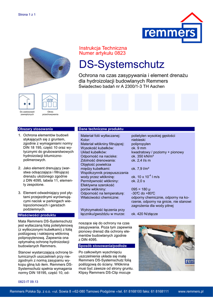 Strona 1 z 1 Instrukcja Techniczna Numer artykułu 0823 DS-Systemschutz Ochrona na czas zasypywania i element drenażu dla hydroizolacji budowlanych Remmers Świadectwo badań nr A 2300/1-3 TH Aachen Do zastosowań zewnętrznych Okres przechowywania Obszary stosowania 1. Ochrona elementów budowli stykających się z gruntem, zgodnie z wymaganiami normy DIN 18 195, część 10 oraz wytycznymi do grubowarstwowych hydroizolacji bitumicznopolimerowych. 2. Jako element drenujący (warstwa odsączająca i filtrująca) drenażu ułożonego zgodnie z DIN 4095, tabela 11, elementy zespolone. 3. Element odwadniający pod płytami przejezdnymi wyrównującymi nacisk w parkingach wielopoziomowych i garażach podziemnych. Właściwości produktu Mata Remmers DS-Systemschutz jest wytłaczaną folią polietylenową (z wytłoczonymi kubełkami) z folią poślizgową i naklejoną włókniną polipropylenową. Zapewnia ona optymalną ochronę hydroizolacji budowlanych Remmers. Stanowi wystarczającą ochronę bitumicznych uszczelnień przy niezgodnym z normą zasypaniu wykopu gliną lub iłem. Remmers DSSystemschutz spełnia wymagania normy DIN 18195, część 10, od- Dane techniczne produktu Materiał folii wytłaczanej: Kolor: Materiał włókniny filtrującej: Wysokość kubełków: Układ kubełków: Odporność na naciske: Zdolność drenowania: Objętość powietrza między kubełkami: Współczynnik przepuszczania wody przez włókninę: Permitywność włókniny: Efektywna szerokość porów włókniny: Odporność na temperaturę: Właściwości chemiczne: Wytrzymałość łączenia przy łączniku/gwoździu w murze: polietylen wysokiej gęstości niebieski polipropylen ok. 9 mm kwadratowy / poziomy + pionowy ok. 350 kN/m² ok. 2,4 l/s m ok. 7,9 l/m² -4 ok. 10 x 10 l m/s ok. 2,0 s 095 = 180 µ -30°C do +80°C odporny chemicznie, odporny na korzenie, odporny na gnicie, nie stanowi zagrożenia dla wody pitnej ok. 420 N/złącze noszące się do ochrony na czas zasypywania. Poza tym zapewnia pionowy drenaż dla ochrony elementów budowlanych zgodnie z DIN 4095. Sposób stosowania/podłoże Po całkowitym wyschnięciu uszczelnienia układa się matę Remmers DS-Systemschutz folią poślizgową do ściany. Włóknina musi być zawsze od strony gruntu. Klipsy Remmers DS-Clip mocuje 0823 IT 09.13 Remmers Polska Sp. z o.o. • ul. Sowia 8 • 62-080 Tarnowo Podgórne • tel. 61 8168100 faks: 61 8168111 www.remmers.pl Strona 2 z 2 się w odstępach ok. 25 cm, za pomocą dostępnych w handlu środków do mocowania, dopasowując do przewidywanego poziomu terenu. W celu zamocowania maty Remmers DS-Systemschutz należy oddzielić włókninę od folii kubełkowej w pasie ok. 10 cm i wciągnąć matę za klips Remmers DS-Clip. Zęby klipsów Remmers DS-Clip chwytają folię kubełkową i włóknina jest ponownie wyprowadzana nad klipsy. Na zakończenie układa się listwę zamykającą Remmers DS Abschlussleiste. W miejscach nakładania się pasm maty, folię danego pasma należy wsunąć pod włókninę przylegającego pasma. Po ściągnięciu taśmy ochronnej pasma są sklejane ze sobą. Końcowe, zamykające pasmo łączy się na co najmniej 30 centymetrowej szerokości zakładkę z pasmem pierwszym. W narożnikach zewnętrznych pasmo maty należy zawsze przed montażem zagiąć wstępnie na całej długości. W dole mata dochodzi bezpośrednio do drenu. Podczas wypełniania grunt należy zagęszczać warstwami. Największe ziarno gruntu używanego do zasypania wykopu nie powinno mieć średnicy większej niż 100 mm. Rura drenażu jest otoczona co najmniej 15 cm warstwą materiału filtracyjnego (np. żwirem o linii przesiewu B 32) i na co najmniej 30 cm wchodzącego na matę drenującą. Grunt do wypełnienia nie może poza tym zawierać żadnych elementów o ostrych krawędziach, mogących przeciąć matę. Szczegóły Szachty naświetli z tworzywa a) jeśli szachty mają być dopiero wbudowane, to DS.-Systemschutz układa się najpierw na cały otwór okienny. Szacht naświetla montuje się następnie na DS-Systemschutz zgodnie z zaleceniami producenta. Następnie wycina się w macie otwór okienny. b) jeżeli naświetla są już zamontowane, to należy wykonać poziome cięcie maty dokładnie przy dolnej krawędzi naświetla, oraz jedno pionowe cięcie w środku naświetla. Powstające w ten sposób dwa skrzydła maty należy wprowadzić z boków na naświetle. Krawędź maty pod naświetlem należy także mocować mechanicznie. Przejścia przewodów lub rur W przejściu kabli lub rur wykonać cięcie w kształcie litery V i wsunąć resztkę maty o wymiarach ok. 30 x 30 cm. Remmers Baustofftechnik GmbH Bernhard-Remmers-Str. 13 D – 49624 Löningen Werk 25170-A 02 Odporność w naturalnych gruntach o odczynie pH pomiędzy 4 a 9 i temperaturze < 25 °C Rodzaj opakowania, zużycie, składowanie MD 6 KN/m Rolki o szerokości 2,00 m i długości 12,50 m = 25 m² 40 mm Zużycie: wg potrzeb 0,15 mm 80 mm/s 20 kPa 50 kPa 100 kPa Bezpieczeństwo, ochrona środowiska, usuwanie Bliższe informacje na temat bezpieczeństwa podczas transportu, składowania i stosowania oraz na temat usuwania i ochrony środowiska znajdują się w aktualnej karcie charakterystyki produktu. Geokompozyt do stosowania w systemach drenażowych Przepuszczalność w płaszczyźnie Mata Remmers DS Systemschutz nie jest szkodliwa dla zdrowia. Forma dostawy: Rolki o szerokości 2,00 m i długości 20,00 m = 40 m² nr GBI F 019 EN 13252:2000 + A1:2005 Wytrzymałość na rozciąganie Odporność na przebicie (próba stożkowa) Charakterystyczne rozwarcie Przepuszczalność wody Wskazówki 3,1 l/s ● m 2,8 l/s ● m 1,7 l/s ● m co najmniej 25 lat . Powyższe wskazówki zostały zestawione w naszym dziale produkcji według najnowszego stanu wiedzy i techniki stosowania. Ponieważ rodzaje zastosowań i sposób użycia są poza naszą kontrolą, z treści tej instrukcji nie wynika żadna odpowiedzialność producenta. Wskazówki wykraczaj