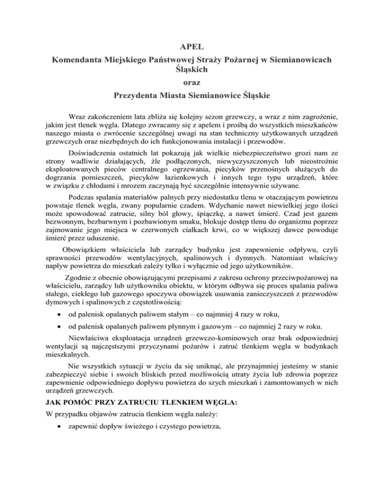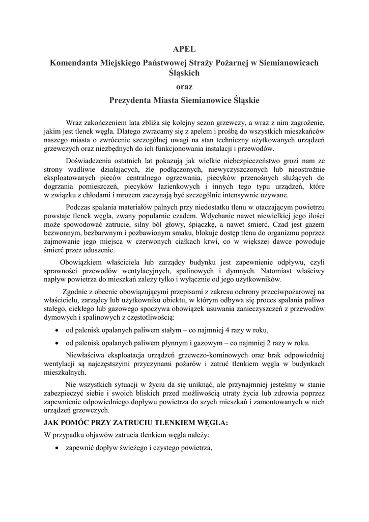 APEL Komendanta Miejskiego Państwowej Straży Pożarnej w Siemianowicach Śląskich oraz Prezydenta Miasta Siemianowice Śląskie Wraz zakończeniem lata zbliża się kolejny sezon grzewczy, a wraz z nim zagrożenie, jakim jest tlenek węgla. Dlatego zwracamy się z apelem i prośbą do wszystkich mieszkańców naszego miasta o zwrócenie szczególnej uwagi na stan techniczny użytkowanych urządzeń grzewczych oraz niezbędnych do ich funkcjonowania instalacji i przewodów. Doświadczenia ostatnich lat pokazują jak wielkie niebezpieczeństwo grozi nam ze strony wadliwie działających, źle podłączonych, niewyczyszczonych lub nieostrożnie eksploatowanych pieców centralnego ogrzewania, piecyków przenośnych służących do dogrzania pomieszczeń, piecyków łazienkowych i innych tego typu urządzeń, które w związku z chłodami i mrozem zaczynają być szczególnie intensywnie używane. Podczas spalania materiałów palnych przy niedostatku tlenu w otaczającym powietrzu powstaje tlenek węgla, zwany popularnie czadem. Wdychanie nawet niewielkiej jego ilości może spowodować zatrucie, silny ból głowy, śpiączkę, a nawet śmierć. Czad jest gazem bezwonnym, bezbarwnym i pozbawionym smaku, blokuje dostęp tlenu do organizmu poprzez zajmowanie jego miejsca w czerwonych ciałkach krwi, co w większej dawce powoduje śmierć przez uduszenie. Obowiązkiem właściciela lub zarządcy budynku jest zapewnienie odpływu, czyli sprawności przewodów wentylacyjnych, spalinowych i dymnych. Natomiast właściwy napływ powietrza do mieszkań zależy tylko i wyłącznie od jego użytkowników. Zgodnie z obecnie obowiązującymi przepisami z zakresu ochrony przeciwpożarowej na właścicielu, zarządcy lub użytkowniku obiektu, w którym odbywa się proces spalania paliwa stałego, ciekłego lub gazowego spoczywa obowiązek usuwania zanieczyszczeń z przewodów dymowych i spalinowych z częstotliwością: od palenisk opalanych paliwem stałym – co najmniej 4 razy w roku, od palenisk opalanych paliwem płynnym i gazowym – co najmniej 2 razy w roku. Niewłaściwa eksploatacja urządzeń grzewczo-kominowych oraz brak odpowiedniej wentylacji są najczęstszymi przyczynami pożarów i zatruć tlenkiem węgla w budynkach mieszkalnych. Nie wszystkich sytuacji w życiu da się uniknąć, ale przynajmniej jesteśmy w stanie zabezpieczyć siebie i swoich bliskich przed możliwością utraty życia lub zdrowia poprzez zapewnienie odpowiedniego dopływu powietrza do szych mieszkań i zamontowanych w nich urządzeń grzewczych. JAK POMÓC PRZY ZATRUCIU TLENKIEM WĘGLA: W przypadku objawów zatrucia tlenkiem węgla należy: zapewnić dopływ świeżego i czystego powietrza, wynieść osobę poszkodowaną w bezpieczne miejsce, jeśli nie stanowi to zagrożenia dla zdrowia osoby ratującej, a w przypadku zaistnienia takiego zagrożenia pozostawić przeprowadzenie akcji ewakuacyjnej służbom ratowniczym, wezwać niezwłocznie pogotowie ratunkowe i straż pożarną, jak najszybciej podać tlen, jeżeli poszkodowany nie oddycha, ma zatrzymaną akcję serca, należy natychmiast zastosować sztuczne oddychanie (np. metodą usta-usta) oraz masaż serca, nie wolno wpadać w panikę, kiedy znajdziemy dziecko lub dorosłego z objawami zaburzenia świadomości w kuchni, łazience, kotłowni lub garażu; należy jak najszybciej przystąpić do udzielania pierwszej pomocy. PAMIĘTAJMY! Od stosowania się do powyższych rad może zależeć nasze zdrowie i życie, jak również bezpieczeństwo naszych bliskich. A wystarczy jedynie odrobina przezorności. Życzylibyśmy Państwu i sobie, aby nadchodzący sezon grzewczy był wolny od informacji o śmiertelnych ofiarach tlenku węgla. Prezydent Miasta Siemianowice Śląskie Rafał Piech Komendant Miejski Państwowej Straży Pożarnej w Siemianowicach Śląskich bryg. mgr inż. Rafał Świerczek