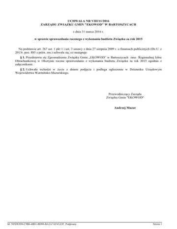 UCHWAŁA NR VIII/11/2016 ZARZĄDU ZWIĄZKU GMIN "EKOWOD" W BARTOSZYCACH z dnia 31 marca 2016 r. w sprawie sprawozdania rocznego z wykonania budżetu Związku za rok 2015 Na podstawie art. 267 ust. 1 pkt 1 i ust. 3 ustawy z dnia 27 sierpnia 2009 r. o finansach publicznych (Dz.U. z 2013r. poz. 885 z późn. zm.) uchwala się, co następuje: § 1. Przedstawia się Zgromadzeniu Związku Gmin „EKOWOD” w Bartoszycach oraz Regionalnej Izbie Obrachunkowej w Olsztynie roczne sprawozdanie z wykonania budżetu Związku za rok 2015 zgodnie z załącznikami. § 2. Uchwała wchodzi w życie z dniem podjęcia i podlega ogłoszeniu w Dzienniku Urzędowym Województwa Warmińsko-Mazurskiego. Przewodniczący Zarządu Związku Gmin "EKOWOD" Andrzej Mazur Id: 585D83D8-C9B6-4B01-BD88-BA2A7AF43A5F. Podpisany Strona 1 Załącznik Nr 1 do Uchwały Nr VIII/11/2016 Zarządu Związku Gmin "EKOWOD" w Bartoszycach z dnia 31 marca 2016 r. Zgromadzenie Związku Gmin "EKOWOD" w Bartoszycach INFORMACJA z wykonania budżetu ZWIĄZKU GMIN "EKOWOD" w BARTOSZYCACH za rok 2015 Budżet Związku Gmin "EKOWOD" za rok 2015 po zmianach wprowadzonych uchwałami Zgromadzenia Związku Gmin przedstawia się następująco: I. Po stronie dochodów: Plan po zmianach wynosi 64.927,00 PLN wykonano 64.891,32 PLN - 99,94 %, w tym: Dział Rozdział 750 750 75095 75095 § Wyszczególnienie 0920 2900 Odsetki bankowe Wpłaty gmin na rzecz związków gmin na dofinansowanie zadań bieżących, w tym: Gmina Lidzbark Warm. Gmina Górowo Iław. Gmina Lubomino Gmina Kolno Razem: Ogółem: Plan w PLN 1.000,00 Wykonanie w PLN 964,32 % wykonania 96,43 20.427,00 21.858,00 11.235,00 10.407,00 63.927,00 64.927,00 20.427,00 21.858,00 11.235,00 10.407,00 63.927,00 64.891,32 100,00 100,00 100,00 100,00 100,00 99,94 II. Po stronie wydatków: Plan po zmianach wynosi 124.631,00 PLN wykonano 112.700,25 PLN - 90,43 % według poniższego wyszczególnienia: Dział Rozdział § Wyszczególnienie 750 75095 3020 750 75095 3030 750 75095 4010 750 750 750 75095 75095 75095 4040 4110 4170 Wydatki osobowe nie zaliczone do wynagrodzeń Diety dla członków związku Wynagrodzenia osobowe pracowników. Dodatkowe wynagrodzenie roczne Składki zus Wynagrodzenia bezosobowe 750 75095 4210 Zakup materiałów i wyposażenia 750 750 750 750 75095 75095 75095 75095 4280 4300 4410 4440 Zakup usług zdrowotnych Zakup usług pozostałych Podróże służbowe krajowe Odpisy na ZFŚS Id: 585D83D8-C9B6-4B01-BD88-BA2A7AF43A5F. Podpisany Plan w PLN Wykonanie w PLN % wykonania 400,00 400,00 100,00 2.250,00 27.166,00 2.250,00 100,00 27.166,00 100,00 2.102,00 5.325,00 19.120,00 3.700,00 2.101,20 5.296,85 19.120,00 99,96 99,47 100,00 3.312,98 89,54 40,00 11.000,00 500,00 547,00 40,00 10.170,58 225,67 546,97 100,00 92,46 45,13 99,99 Strona 1 750 75095 4700 750 75095 6060 758 75818 4810 Szkolenia pracowników Wydatki na zakupy inwestycyjne jednostek budżetowych Rezerwa budżetowa Razem: 1.500,00 250,00 16,67 41.820,00 41.820,00 100,00 9.161,00 0,00 124.631,00 112.700,25 0,00 90,43 Rezerwa budżetowa w roku 2015 nie została rozwiązana. W roku 2015 Związek Gmin "EKOWOD" zakupił program komputerowy pn. "System Zarządzania Usługami Wodno-Ściekowymi QNet Standard" na kwotę 41.820,00 PLN i przekazał do użytku i stosowania dla Zakładu Budżetowego "EKOWOD" w Bartoszycach. Budżet Związku Gmin "EKOWOD" w roku 2015 był realizowany zgodnie z planem finansowym przy założeniu oszczędnego gospodarowania środkami pieniężnymi. Budżet Związku Gmin "EKOWOD" za rok 2015 zamknął się deficytem w wysokości 47.808,93 PLN., który został pokryty nadwyżką z lat ubiegłych. Łączna kwota nadwyżki budżetowej z lat ubiegłych po pokryciu w.w. deficytu na dzień 31.12.2015 r. wynosi 154.871,96 PLN. Związek Gmin "EKOWOD" na dzień 31.12.2015 r. nie posiada zobowiązań długoterminowych, tytułów dłużnych jak również kredytów. Id: 585D83D8-C9B6-4B01-BD88-BA2A7AF43A5F. Podpisany Strona 2 Załącznik Nr 2 do Uchwały Nr VIII/11/2016 Zarządu Związku Gmin "EKOWOD" w Bartoszycach z dnia 31 marca 2016 r. ZGROMADZENIE ZWIĄZKU GMIN„EKOWOD” w Bartoszycach INFORMACJA O KSZTAŁTOWANIU SIĘ WIELOLETNIEJ PROGNOZY FINANSOWEJ ZWIĄZKU GMIN „EKOWOD” za 2015 r. Związek Gmin w roku 2015 r. wykonał: Po stronie dochodów: - dochody ogółem: na plan 64.927,00 PLN, wykonanie 64.891,32 PLN – tj. 99,94%. Po stronie wydatków: Wydatki ogółem: plan 124.631,00 PLN, wykonanie 112.700,25 PLN tj. 90,43% w tym : - wynagrodzenia osobowe i wynagrodzenia bezosobowe oraz składki od nich naliczane na plan 53.713,00 PLN, wykonano 53.684,05 tj. 99,95 %. pozostałe wydatki związane z funkcjonowaniem Związku na plan 29.098,00 PLN wykonano 17.196,20 PLN tj. 59,10 %. Wydatki inwestycyjne: - zakupiono program komputerowy na obsługę odbiorców wody i odprowadzenia kanalizacji i przekazano dla Zakładu Budżetowego "EKOWOD" w wysokości 41.820,00 PLN. Rezerwa budżetowa nie została rozwiązana w roku 2015 r. Budżet Związku za rok 2015 zamknął się deficytem w wysokości 47.808,93 PLN, który został pokryty nadwyżką budżetową z lat ubiegłych. Łączna nadwyżka z lat ubiegłych na dzień 31.12.2015 r. wynosi 154.871,96 PLN. Związek Gmin w roku 2015 kredytów. nie zaciągał zobowiązań długoterminowych, nie posiada tytułów dłużnych ani Związek Gmin w 2015 roku nie realizował przedsięwzięć dłuższych niż okres sprawozdawczy, nie prowadzi projektów ani programów. Id: 585D83D8-C9B6-4B01-BD88-BA2A7AF43A5F. Podpisany Strona 1 Załącznik Nr 3 do Uchwały Nr VIII/11/2016 Zarządu Związku Gmin "EKOWOD" w Bartoszycach z dnia 31 marca 2016 r. INFORMACJA o stanie mienia komunalnego Związku Gmin „EKOWOD” w Bartoszycach na dzień 31 grudnia 2015 roku I. Decyzją Urzędu Wojewódzkiego w Olsztynie nr GKG-GN-7228-2/9/98 z dnia 09.01.1998 r. przekazano dla Związku Gmin „EKOWOD” w Bartoszycach na własność: - nieruchomość zabudowaną, położoną w Bartoszycach obręb Nr 1 oznaczo