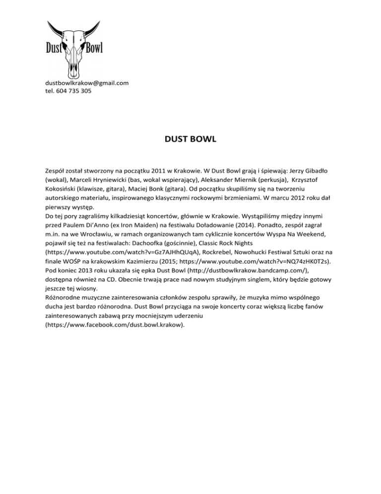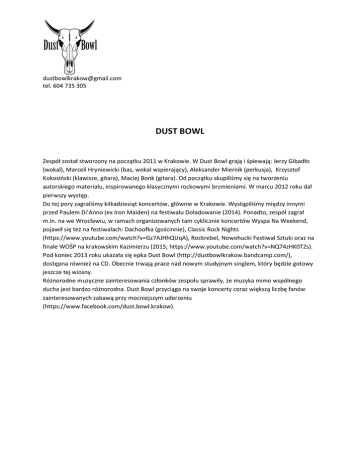 [email protected] tel. 604 735 305 DUST BOWL Zespół został stworzony na początku 2011 w Krakowie. W Dust Bowl grają i śpiewają: Jerzy Gibadło (wokal), Marceli Hryniewicki (bas, wokal wspierający), Aleksander Miernik (perkusja), Krzysztof Kokosiński (klawisze, gitara), Maciej Bonk (gitara). Od początku skupiliśmy się na tworzeniu autorskiego materiału, inspirowanego klasycznymi rockowymi brzmieniami. W marcu 2012 roku dał pierwszy występ. Do tej pory zagraliśmy kilkadziesiąt koncertów, głównie w Krakowie. Wystąpiliśmy między innymi przed Paulem Di’Anno (ex Iron Maiden) na festiwalu Doładowanie (2014). Ponadto, zespół zagrał m.in. na we Wrocławiu, w ramach organizowanych tam cyklicznie koncertów Wyspa Na Weekend, pojawił się też na festiwalach: Dachoofka (gościnnie), Classic Rock Nights (https://www.youtube.com/watch?v=Gz7AJHhQUqA), Rockrebel, Nowohucki Festiwal Sztuki oraz na finale WOŚP na krakowskim Kazimierzu (2015; https://www.youtube.com/watch?v=NQ74zHK0T2s). Pod koniec 2013 roku ukazała się epka Dust Bowl (http://dustbowlkrakow.bandcamp.com/), dostępna również na CD. Obecnie trwają prace nad nowym studyjnym singlem, który będzie gotowy jeszcze tej wiosny. Różnorodne muzyczne zainteresowania członków zespołu sprawiły, że muzyka mimo wspólnego ducha jest bardzo różnorodna. Dust Bowl przyciąga na swoje koncerty coraz większą liczbę fanów zainteresowanych zabawą przy mocniejszym uderzeniu (https://www.facebook.com/dust.bowl.krakow).