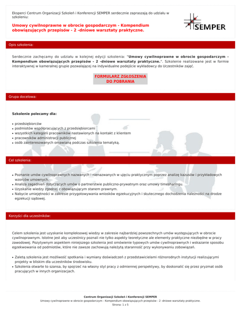 Eksperci Centrum Organizacji Szkoleń i Konferencji SEMPER serdecznie zapraszają do udziału w szkoleniu: Umowy cywilnoprawne w obrocie gospodarczym - Kompendium obowiązujących przepisów - 2 -dniowe warsztaty praktyczne. Opis szkolenia: Serdecznie zachęcamy do udziału w kolejnej edycji szkolenia: "Umowy cywilnoprawne w obrocie gospodarczym Kompendium obowiązujących przepisów - 2 -dniowe warsztaty praktyczne.". Szkolenie realizowane jest w formie interaktywnej w kameralnej grupie pozwalającej na indywidualne podejście wykładowcy do Uczestników zajęć. FORMULARZ ZGŁOSZENIA DO POBRANIA Grupa docelowa: Szkolenie polecamy dla: ● ● ● ● ● przedsiębiorców podmiotów współpracujących z przedsiębiorcami wszystkich kategorii pracowników nastawionych na kontakt z klientem pracowników administracji publicznej osób zainteresowanych omawianą podczas szkolenia tematyką. Cel szkolenia: ● ● ● ● Poznanie umów cywilnoprawnych nazwanych i nienazwanych w ujęciu praktycznym poprzez analizę kazusów i przykładowych wzorców umownych. Analiza zagadnień dotyczących umów o partnerstwie publiczno-prywatnym oraz umowy timesharingu. Uzyskanie wiedzy zgodnej z obowiązującym stanem prawnym. Nabycie umiejętności w zakresie przygotowywania wniosków egzekucyjnych i skutecznego dochodzenia należności na drodze egzekucji sądowej. Korzyści dla uczestników: Celem szkolenia jest uzyskanie kompleksowej wiedzy w zakresie najbardziej powszechnych umów występujących w obrocie cywilnoprawnym. Istotne jest aby uczestnicy poznali nie tylko aspekty teoretyczne ale elementy praktyczne niezbędne w pracy zawodowej. Pozytywnym aspektem niniejszego szkolenia jest omówienie typowych umów cywilnoprawnych i wskazanie sposobu egzekwowania od podmiotów, które nie zawsze zachowują należytą staranność przy wykonywaniu zobowiązań. ● ● Zaletą szkolenia jest możliwość spotkania i wymiany doświadczeń z przedstawicielami różnorodnych instytucji realizującymi projekty w bliskim dla uczestników środowisku. Szkolenia otwarte to szansa, by spojrzeć na własny styl pracy z odmiennej perspektywy, by doskonalić się przez pryzmat osób pracujących w innych organizacjach. Centrum Organizacji Szkoleń i Konferencji SEMPER Umowy cywilnoprawne w obrocie gospodarczym - Kompendium obowiązujących przepisów - 2 -dniowe warsztaty praktyczne. Strona: 1 z 5 Metodologia: Jako pierwsza instytucja szkoleniowa w Polsce dbamy o to aby również szkolenia otwarte były dopasowane do oczekiwań oraz stylu pracy uczestników! Indywidualizacja szkolenia - dzięki udziałowi w takim szkoleniu uczestnicy osiągają oczekiwany przez pracodawcę poziom kompetencji i umiejętności. Zajęcia są prowadzone metodą warsztatową opartą na aktywizacji uczestników szkolenia poprzez pracę w małych grupach, dyskusje na forum grupy oraz ćwiczenia, studia przypadków, scenki rodzajowe, pracę indywidualną, symulacje i mini- wykłady z omówieniem przykładów z życia i prezentacją multimedialną. Przedmiotem zajęć są realne trudności uwzględniające specyfikę danej branży oraz potrzeby i możliwości osób biorących udział w warsztatach. Uczestnicy uczą się poprzez doświadczenie – ćwiczą różne sytuacje, mają możliwość konsultacji indywidualnych. Nauka poprzez kreatywność, elastyczność i osobiste doświadczenia jest najskuteczniejszą formą zdobywania nowych umiejętności. Trener: Marcin Owsianka Specjalizacja trenerska: Prawnik, asystent naukowy na Katolickim Uniwersytecie Lubelskim Jana Pawła II, zajmujący się zawodowo problematyką egzekucji sądowej, autor licznych publikacji z zakresu prawa cywilnego i postępowania egzekucyjnego, współautor publikacji pt. „Egzekucja sądowa świadczeń pieniężnych”. Jako trener przeprowadził wiele szkoleń z zakresu windykacji, egzekucji należności oraz postępowania cywilnego m.in. dla ING Bank Śląski, Santander Consumer Bank, Przewozy Regionalne, Mota - Engil, Linde Gaz, B+M Baustoff+Metall Sp. z o.o., LOTOS PALIWA Sp. z o.o., Zarząd Budynków Komunalnych w Krakowie, Raiffeisen Bank Polska SA, PMR Ltd, AM FCE Services Poland Sp. z o.o. (Arcelormittal). czytaj więcej... Program szkolenia: 1. Podmioty zdolne do zawierania umów a) osoby fizyczne b) osoby prawne c) jednostki organizacyjne nie wyposażone w osobowość prawną d) szczególne uregulowania dotyczące Skarbu Państwa 2. Reprezentacja podmiotów przy zawieraniu umów a) osobiste czynności osób fizycznych b) sposób reprezentacji poszczególnych typów osób prawnych (znaczenie wpisów w Krajowym Rejestrze Sądowym dotyczących sposobu reprezentacji) c) pełnomocnictwo d) prokura e) prowadzenie cudzych spraw bez zlecenia (falsus prokurator) 3. Rodzaje umów w obrocie cywilnoprawnym a) umowa jako zgodne oświadczenia woli stron b) sposoby składania oświadczeń woli c) wykładnia niejasnych oświadczeń woli d) oferta i jej przyjęcie e) wady oświadczeń woli i skutki tych wad f) rodzaje umów: dwustronne i wielostronne, zobowiązujące i rozporządzające, wzajemne, nazwane i nienazwane g) elementy przedmiotowo istotne umów (essentialia negotii) h) elementy podmiotowo istotne (accidentalia negotii) 4. Znaczenie zasady swobody umów 5. Forma umowy a) forma ustna b) forma pisemna Centrum Organizacji Szkoleń i Konferencji SEMPER Umowy cywilnoprawne w obrocie gospodarczym - Kompendium obowiązujących przepisów - 2 -dniowe warsztaty praktyczne. Strona: 2 z 5 c) forma aktu notarialnego d) umowy zawierane na odległość 6. Umowy nazwane w Kodeksie cywilnym a) umowa najmu b) umowa zlecenia c) umowa sprzedaży d) umowa leasingu 7. Timeshare a) umowa timeshare; b) umowy o długoterminowy produkt wakacyjny; c) umowa pośrednictwa w odsprzedaży timeshare lub długoterminowego produktu wakacyjnego; d) umowa o uczestnictwo w systemie wymiany. 8. Wadliwość umów (źródła wadliwości umów i ich skutki) 9. Odstąpienie od umowy 10. Sposoby rozwi