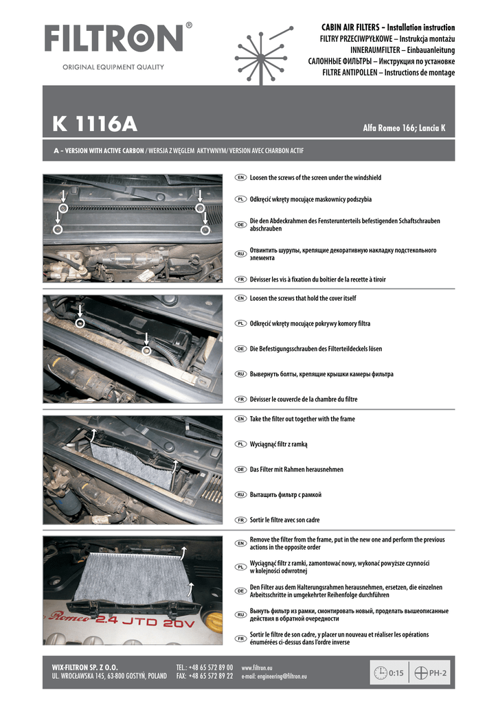 CABIN AIR FILTERS – Installation instruction FILTRY PRZECIWPYŁKOWE – Instrukcja montażu INNERAUMFILTER – Einbauanleitung САЛОННЫЕ ФИЛЬТРЫ – Инструкция по установке FILTRE ANTIPOLLEN – Instructions de montage K 1116A Alfa Romeo 166; Lancia K A – VERSION WITH ACTIVE CARBON / WERSJA Z WĘGLEM AKTYWNYM/ VERSION AVEC CHARBON ACTIF Loosen the screws of the screen under the windshield Odkręcić wkręty mocujące maskownicy podszybia Die den Abdeckrahmen des Fensterunterteils befestigenden Schaftschrauben abschrauben Отвинтить шурупы, крепящие декоративную накладку подстекольного элемента Dévisser les vis à fixation du boîtier de la recette à tiroir Loosen the screws that hold the cover itself Odkręcić wkręty mocujące pokrywy komory filtra Die Befestigungsschrauben des Filterteildeckels lösen Вывернуть болты, крепящие крышки камеры фильтра Dévisser le couvercle de la chambre du filtre Take the filter out together with the frame Wyciągnąć filtr z ramką Das Filter mit Rahmen herausnehmen Вытащить фильтр с рамкой Sortir le filtre avec son cadre Remove the filter from the frame, put in the new one and perform the previous actions in the opposite order Wyciągnąć filtr z ramki, zamontować nowy, wykonać powyższe czynności w kolejności odwrotnej Den Filter aus dem Halterungsrahmen herausnehmen, ersetzen, die einzelnen Arbeitsschritte in umgekehrter Reihenfolge durchführen Вынуть фильтр из рамки, смонтировать новый, проделать вышеописанные действия в обратной очередности Sortir le filtre de son cadre, y placer un nouveau et réaliser les opérations énumérées ci-dessus dans l’ordre inverse WIX-FILTRON SP. Z O.O. TEL.:+48 65 572 89 00 www.filtron.eu UL. WROCŁAWSKA 145, 63-800 GOSTYŃ, POLAND FAX: +48 65 572 89 22 e-mail: [email protected] 0:15 PH-2