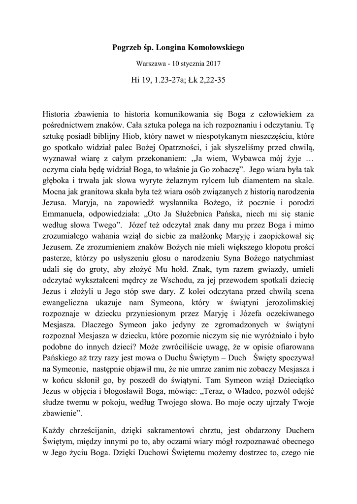 Pogrzeb śp. Longina Komołowskiego Warszawa - 10 stycznia 2017 Hi 19, 1.23-27a; Łk 2,22-35 Historia zbawienia to historia komunikowania się Boga z człowiekiem za pośrednictwem znaków. Cała sztuka polega na ich rozpoznaniu i odczytaniu. Tę sztukę posiadł biblijny Hiob, który nawet w niespotykanym nieszczęściu, które go spotkało widział palec Bożej Opatrzności, i jak słyszeliśmy przed chwilą, wyznawał wiarę z całym przekonaniem: „Ja wiem, Wybawca mój żyje … oczyma ciała będę widział Boga, to właśnie ja Go zobaczę”. Jego wiara była tak głęboka i trwała jak słowa wyryte żelaznym rylcem lub diamentem na skale. Mocna jak granitowa skała była też wiara osób związanych z historią narodzenia Jezusa. Maryja, na zapowiedź wysłannika Bożego, iż pocznie i porodzi Emmanuela, odpowiedziała: „Oto Ja Służebnica Pańska, niech mi się stanie według słowa Twego”. Józef też odczytał znak dany mu przez Boga i mimo zrozumiałego wahania wziął do siebie za małżonkę Maryję i zaopiekował się Jezusem. Ze zrozumieniem znaków Bożych nie mieli większego kłopotu prości pasterze, którzy po usłyszeniu głosu o narodzeniu Syna Bożego natychmiast udali się do groty, aby złożyć Mu hołd. Znak, tym razem gwiazdy, umieli odczytać wykształceni mędrcy ze Wschodu, za jej przewodem spotkali dziecię Jezus i złożyli u Jego stóp swe dary. Z kolei odczytana przed chwilą scena ewangeliczna ukazuje nam Symeona, który w świątyni jerozolimskiej rozpoznaje w dziecku przyniesionym przez Maryję i Józefa oczekiwanego Mesjasza. Dlaczego Symeon jako jedyny ze zgromadzonych w świątyni rozpoznał Mesjasza w dziecku, które pozornie niczym się nie wyróżniało i było podobne do innych dzieci? Może zwróciliście uwagę, że w opisie ofiarowana Pańskiego aż trzy razy jest mowa o Duchu Świętym – Duch Święty spoczywał na Symeonie, następnie objawił mu, że nie umrze zanim nie zobaczy Mesjasza i w końcu skłonił go, by poszedł do świątyni. Tam Symeon wziął Dzieciątko Jezus w objęcia i błogosławił Boga, mówiąc: „Teraz, o Władco, pozwól odejść słudze twemu w pokoju, według Twojego słowa. Bo moje oczy ujrzały Twoje zbawienie”. Każdy chrześcijanin, dzięki sakramentowi chrztu, jest obdarzony Duchem Świętym, między innymi po to, aby oczami wiary mógł rozpoznawać obecnego w Jego życiu Boga. Dzięki Duchowi Świętemu możemy dostrzec to, czego nie dostrzega wzrok fizyczny – to znaczy Jezusa obecnego w znaku Bożego słowa, w znakach sakramentalnych, we wspólnocie Kościoła – wszak Jezus mówił, że gdzie dwóch albo trzech zgromadzonych jest w Jego imię, tam On jest pośród nich. Co więcej, Jezusa możemy i powinniśmy także odkrywać w osobach innych ludzi, sam Jezus bowiem podkreślał, że wszystko co czynimy dla drugich, czynimy także dla Niego. W dar Ducha Świętego został zaopatrzony również nasz brat śp. Longin Komołowski. W sposób najbardziej zauważalny korzystał z niego w relacji do drugiego człowieka. Jak wiemy z nauczania Jezusa, to miłość będzie najważniejszym kryterium sądu i oceny na progu domu naszego Ojca w niebie. Z nadzieją więc powierzamy miłosiernemu Bogu osobę i życie śp. Longina, dostrzegając w nim pewne podobieństwa do osoby Symeona, który w bezradnym i bezbronnym dziecku dostrzegał osobę wszechmogącego Boga. Nasz brat odznaczał się tym, co Jan Paweł II nazwał „wyobraźnią miłosierdzia”. Począwszy od 1980 roku cała jego publiczna działalność była ukierunkowana na pomoc ludziom , którzy w większym czy mniejszym stopniu byli bezradni czy bezbronni. Nie zdziwiłem się więc, kiedy zobaczyłem jego nazwisko wśród posłów, którzy onegdaj głosowali przeciw ustawie, która mogła doprowadzić do handlu ludzkimi zarodkami. Był człowiekiem solidarności, nie tylko przez duże „S”, tej instytucjonalnej, ale i ludzkiej, zwyczajnej, prostej. Doświadczali jej i robotnicy, i osoby niepełnosprawne, i Polacy żyjący poza granicami kraju, zwłaszcza na Wschodzie, borykający się z wieloma problemami dnia codziennego, i tęskniący za ojczystą ziemią. Ostatnie lata pełnił funkcję prezesa Stowarzyszenia „Wspólnota Polska”, kontynuując piękną pracę poprzedników Andrzeja Stelmachowskiego i Macieja Płażyńskiego. Droga mu była nasza Ojczyzna – Polska i droga też mu była idea budowania więzi między Polakami, tak by nie tylko z nazwy, ale realnie można było mówić „wspólnota”. Zależało mu na tym, by Polacy żyjący poza granicami kraju identyfikowali się z Polską, zachowując swoją polską i religijną tożsamość. We Wstępie do albumu zawierającego wypowiedzi Jana Pawła II do Polaków i Polonii przywoływał słowa świętego papieża, że nie można zrozumieć emigracji polskiej bez Kościoła, i dziejów naszego narodu bez Chrystusa. Pod tymi słowami podpisał się z imienia i nazwiska, co jest oczywistym znakiem akceptacji i identyfikacji. Historia zbawienia to historia znaków dawanych nam przez Boga. Znacząca jest data śmierci śp. Longina. To był dzień, kiedy w Kościele przeżywaliśmy święto świętej Rodziny – dla katolików to najpiękniejszy przykład ludzkiej wspólnoty. Naszą modlitwę za zmarłego przenika zatem wiara, iż ten, któremu tak bardzo zależało na wspólnocie na ziemi, doświadczy tej najwspanialszej wspólnoty - z Boskimi Osobami i z tymi, którzy Jezusa uznawali za swojego Pana i Zbawiciela. Dzień pogrzebu inspiruje do rozmyślania nad życiem zmarłej osoby. Powinien też być okazją do refleksji nad naszym życiem. W tym miejscu można by zakończyć to pogrzebowe kazanie, aby dać chwilę czasu do namysłu każdemu z nas. Pozwólcie jednak, że podzielę się jeszcze dwoma refleksjami na kanwie dzisiejszego wydarzenia. Pogrzeb naszego brata przypada w drugim dniu tzw. okresu zwykłego w Kościele. Przedwczoraj zakończył się liturgiczny czas Boż