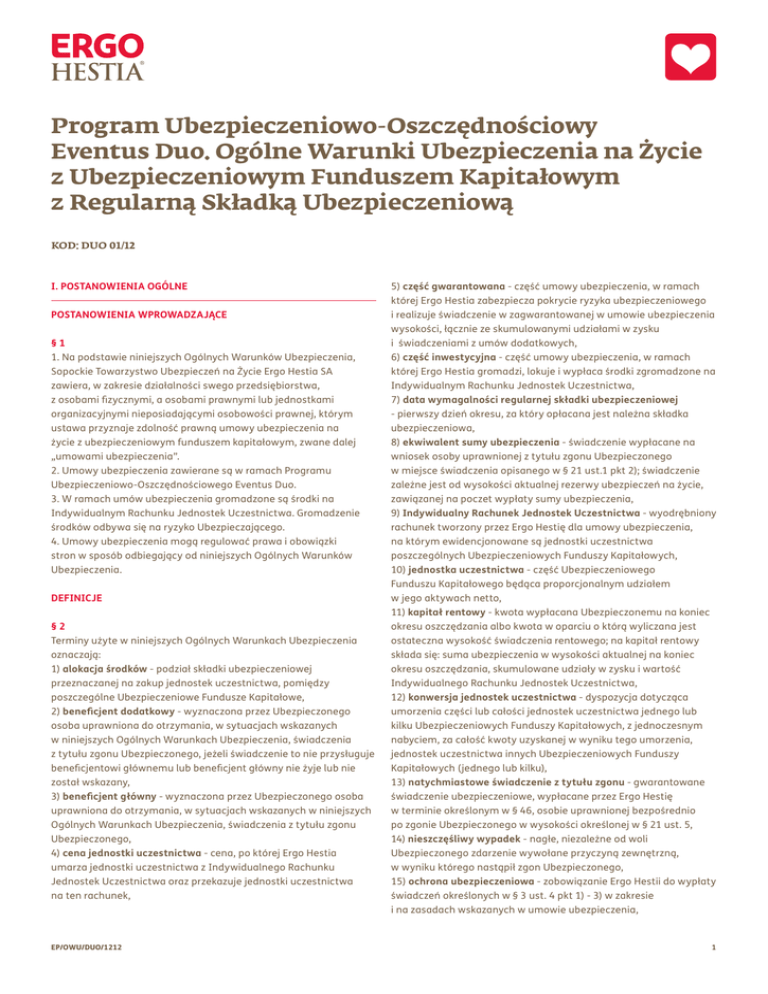 Program Ubezpieczeniowo-Oszczędnościowy Eventus Duo. Ogólne Warunki Ubezpieczenia na Życie z Ubezpieczeniowym Funduszem Kapitałowym z Regularną Składką Ubezpieczeniową KOD: DUO 01/12 I. POSTANOWIENIA OGÓLNE POSTANOWIENIA WPROWADZAJĄCE §1 1. Na podstawie niniejszych Ogólnych Warunków Ubezpieczenia, Sopockie Towarzystwo Ubezpieczeń na Życie Ergo Hestia SA zawiera, w zakresie działalności swego przedsiębiorstwa, z osobami fizycznymi, a osobami prawnymi lub jednostkami organizacyjnymi nieposiadającymi osobowości prawnej, którym ustawa przyznaje zdolność prawną umowy ubezpieczenia na życie z ubezpieczeniowym funduszem kapitałowym, zwane dalej „umowami ubezpieczenia”. 2. Umowy ubezpieczenia zawierane są w ramach Programu Ubezpieczeniowo-Oszczędnościowego Eventus Duo. 3. W ramach umów ubezpieczenia gromadzone są środki na Indywidualnym Rachunku Jednostek Uczestnictwa. Gromadzenie środków odbywa się na ryzyko Ubezpieczającego. 4. Umowy ubezpieczenia mogą regulować prawa i obowiązki stron w sposób odbiegający od niniejszych Ogólnych Warunków Ubezpieczenia. DEFINICJE §2 Terminy użyte w niniejszych Ogólnych Warunkach Ubezpieczenia oznaczają: 1) alokacja środków - podział składki ubezpieczeniowej przeznaczanej na zakup jednostek uczestnictwa, pomiędzy poszczególne Ubezpieczeniowe Fundusze Kapitałowe, 2) beneficjent dodatkowy - wyznaczona przez Ubezpieczonego osoba uprawniona do otrzymania, w sytuacjach wskazanych w niniejszych Ogólnych Warunkach Ubezpieczenia, świadczenia z tytułu zgonu Ubezpieczonego, jeżeli świadczenie to nie przysługuje beneficjentowi głównemu lub beneficjent główny nie żyje lub nie został wskazany, 3) beneficjent główny - wyznaczona przez Ubezpieczonego osoba uprawniona do otrzymania, w sytuacjach wskazanych w niniejszych Ogólnych Warunkach Ubezpieczenia, świadczenia z tytułu zgonu Ubezpieczonego, 4) cena jednostki uczestnictwa - cena, po której Ergo Hestia umarza jednostki uczestnictwa z Indywidualnego Rachunku Jednostek Uczestnictwa oraz przekazuje jednostki uczestnictwa na ten rachunek, EP/OWU/DUO/1212 5) część gwarantowana - część umowy ubezpieczenia, w ramach której Ergo Hestia zabezpiecza pokrycie ryzyka ubezpieczeniowego i realizuje świadczenie w zagwarantowanej w umowie ubezpieczenia wysokości, łącznie ze skumulowanymi udziałami w zysku i świadczeniami z umów dodatkowych, 6) część inwestycyjna - część umowy ubezpieczenia, w ramach której Ergo Hestia gromadzi, lokuje i wypłaca środki zgromadzone na Indywidualnym Rachunku Jednostek Uczestnictwa, 7) data wymagalności regularnej składki ubezpieczeniowej - pierwszy dzień okresu, za który opłacana jest należna składka ubezpieczeniowa, 8) ekwiwalent sumy ubezpieczenia - świadczenie wypłacane na wniosek osoby uprawnionej z tytułu zgonu Ubezpieczonego w miejsce świadczenia opisanego w § 21 ust.1 pkt 2); świadczenie zależne jest od wysokości aktualnej rezerwy ubezpieczeń na życie, zawiązanej na poczet wypłaty sumy ubezpieczenia, 9) Indywidualny Rachunek Jednostek Uczestnictwa - wyodrębniony rachunek tworzony przez Ergo Hestię dla umowy ubezpieczenia, na którym ewidencjonowane są jednostki uczestnictwa poszczególnych Ubezpieczeniowych Funduszy Kapitałowych, 10) jednostka uczestnictwa - część Ubezpieczeniowego Funduszu Kapitałowego będąca proporcjonalnym udziałem w jego aktywach netto, 11) kapitał rentowy - kwota wypłacana Ubezpieczonemu na koniec okresu oszczędzania albo kwota w oparciu o którą wyliczana jest ostateczna wysokość świadczenia rentowego; na kapitał rentowy składa się: suma ubezpieczenia w wysokości aktualnej na koniec okresu oszczędzania, skumulowane udziały w zysku i wartość Indywidualnego Rachunku Jednostek Uczestnictwa, 12) konwersja jednostek uczestnictwa - dyspozycja dotycząca umorzenia części lub całości jednostek uczestnictwa jednego lub kilku Ubezpieczeniowych Funduszy Kapitałowych, z jednoczesnym nabyciem, za całość kwoty uzyskanej w wyniku tego umorzenia, jednostek uczestnictwa innych Ubezpieczeniowych Funduszy Kapitałowych (jednego lub kilku), 13) natychmiastowe świadczenie z tytułu zgonu - gwarantowane świadczenie ubezpieczeniowe, wypłacane przez Ergo Hestię w terminie określonym w § 46, osobie uprawnionej bezpośrednio po zgonie Ubezpieczonego w wysokości określonej w § 21 ust. 5, 14) nieszczęśliwy wypadek - nagłe, niezależne od woli Ubezpieczonego zdarzenie wywołane przyczyną zewnętrzną, w wyniku którego nastąpił zgon Ubezpieczonego, 15) ochrona ubezpieczeniowa - zobowiązanie Ergo Hestii do wypłaty świadczeń określonych w § 3 ust. 4 pkt 1) - 3) w zakresie i na zasadach wskazanych w umowie ubezpieczenia, 1 16) Ogólne Warunki Tymczasowej Ochrony Ubezpieczeniowej - dokument określający zasady udzielania przez Ergo Hestię tymczasowej ochrony ubezpieczeniowej, 17) okres oszczędzania - okres od rozpoczęcia ochrony ubezpieczeniowej do rocznicy polisy w roku, w którym Ubezpieczony kończy 65 rok życia, 18) opłata na pokrycie świadczeń gwarantowanych - opłata pobierana z jednostek uczestnictwa zaewidencjonowanych na Indywidualnym Rachunku Jednostek Uczestnictwa, w sposób określony w niniejszych Ogólnych Warunkach Ubezpieczenia, w terminach i wysokości wskazanych w umowie ubezpieczenia, przeznaczona na pokrycie ryzyka związanego z objęciem Ubezpieczonego ochroną ubezpieczeniową (w częściach określonych w umowie ubezpieczenia odpowiada poszczególnym świadczeniom podstawowym lub dodatkowym), w pozostałym zakresie przeznaczana na pokrycie kosztów administrowania Indywidualnym Rachunkiem Jednostek Uczestnictwa, w zamian za którą Ergo Hestia zobowiązuje się do wypłaty świadczeń z części gwarantowanej, łącznie ze skumulowanymi udziałami w zysku i świadczeniami z umów dodatkowych, 19) osoba uprawniona - Ubezpieczony, beneficjent główny, beneficjent dodatkowy bądź osoby wymienione w § 44 ust. 7,