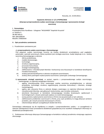 Rzeszów, dn. 23.09.2016.r. Zapytanie ofertowe nr 1/1.4.POPW/2016 dotyczące przeprowadzenia audytu wzorniczego u Zamawiającego i opracowania strategii wzorniczej I. Zamawiający Przedsiębiorstwo Handlowo - Usługowe "WULKANEX" Stapiński Krzysztof ul. Szkolna 5, 38-483 Milcza NIP: 6841008339 REGON: 370003434 II. Opis przedmiotu zamówienia 1. Przedmiotem zamówienia jest a) przeprowadzenie audytu wzorniczego u Zamawiającego Pod pojęciem audytu wzorniczego rozumie się analizę działalności przedsiębiorcy pod względem potencjału i potrzeb wzorniczych, której wynikiem jest strategia wzornicza. Audyt obejmuje m.in.: analizę wzorniczą Zamawiającego w zakresie i. oferty produktowej, ii. modelu biznesowego, iii. technologii, iv. struktury organizacyjnej, v. procesów komunikacji, vi. strategii marketingowej, vii. zdefiniowania i charakterystyki klientów i konkurencji oraz kluczowych w kontekście beneficjenta trendów branżowych, viii. analizę potrzeb beneficjenta w zakresie zarządzania wzornictwem, ix. analizę oferty pod kątem wykorzystania wzornictwa i potencjału rynkowego Zamawiającego. b) opracowanie strategii wzorniczej, w postaci raportu z przeprowadzonego audytu wzorniczego, zawierającego co najmniej następujące elementy: i. ogólną charakterystykę firmy zawierającą analizę wzorniczą przedsiębiorstwa w zakresie produktów, technologii, struktury organizacyjnej, procesów komunikacji z klientem, strategii marketingowej; ii. ogólny opis otoczenia firmy w zakresie designu zawierający co najmniej informacje odnośnie charakterystyki klientów, opis głównych konkurentów, opis trendów rynkowych; iii. określenie kluczowych w kontekście Zamawiającego trendów branżowych, społecznych i technologicznych o dużym potencjale wpływu na rynek Zamawiającego; iv. ocenę poziomu wykorzystania wzornictwa w firmie oraz jej potencjału w tym zakresie; v. zdefiniowanie problemów wzorniczych w firmie, przy czym problemy te mogą dotyczyć zarówno produktu, jak i innych procesów biznesowych w firmie; vi. rekomendacje dalszych szczegółowych działań dla firmy Zamawiający zobowiązuje się do współpracy w związku z przeprowadzeniem audytu – w szczególności w zakresie udostępnienia miejsc prowadzenia działalności gospodarczej oraz wszelkich niezbędnych informacji nt. działalności przedsiębiorstwa. 2. Podstawowe informacje dotyczące Zamawiającego w kontekście realizacji przedmiotu niniejszego zapytania ofertowego: 1 Branża zamawiającego: motoryzacyjna Przedmiot działalności Zamawiającego: usługi motoryzacyjne: 45.20.Z - Konserwacja i naprawa pojazdów samochodowych, z wyłączeniem motocykli 45.32.Z - Sprzedaż detaliczna części i akcesoriów do pojazdów samochodowych, z wyłączeniem motocykli Ogólny opis działalności: Przedsiębiorstwo Handlowo - Usługowe "WULKANEX" Stapiński Krzysztof to jedna z najbardziej dynamicznie rozwijających się firm usług wulkanizacyjnych w regionie z bogatymi tradycjami i długoletnim doświadczeniem. Siedziba Spółki znajduje się w Milczy. Firma posiada oddziały w Milczy, Niebocku, Haczowie i Rymanowie. Zakład produkcyjny zlokalizowany jest w: Przedsiębiorstwo Handlowo - Usługowe "WULKANEX" Stapiński Krzysztof ul. Szkolna 5, 38-483 Milcza 3. Planowany okres realizacji przedmiotu zamówienia: maksymalnie 6 miesięcy 4. Zakładany termin rozpoczęcia realizacji projektu: luty 2017 roku Termin ten może ulec zmianie – adekwatnie do okresu realizacji projektu i umowy o dofinansowanie, w ramach której świadczona będzie przedmiotowa usługa. Uwaga: Zamawiający planuje uzyskać dofinansowanie projektu w ramach Działania 1.4 „Wzór na konkurencję. Etap I”, w ramach Programu Operacyjnego Polska Wschodnia 2014-2020. Niniejsze zapytanie ofertowe dotyczy realizacji przedmiotu zamówienia, które będzie realizowane pod warunkiem otrzymania przez Zamawiającego dofinansowania w ramach Programu Operacyjnego Polska Wschodnia 2014-2020 Działanie 1.4. „Wzór na konkurencję. Etap I” 5. Kod wspólnego słownika zamówień (CPV): 79411100-9 - Usługi doradcze w zakresie rozwoju działalności gospodarczej 79212000-3 - Usługi audytu 6. Zamawiający nie dopuszcza możliwości składania ofert częściowych. III. Termin i miejsce realizacji zamówienia: 1. Termin realizacji zamówienia to maksymalnie 6 miesięcy od daty rozpoczęcia realizacji projektu. 2. Miejsce realizacji działań związanych z przedmiotem zamówienia: województwo podkarpackie Przedsiębiorstwo Handlowo - Usługowe "WULKANEX" Stapiński Krzysztof ul. Szkolna 5, 38-483 Milcza IV. Warunki udziału w postępowaniu oraz opis sposobu dokonywania oceny ich spełniania 1. Warunki dopuszczające Oferenta do udziału w postępowaniu: a) Oferent posiada udokumentowane doświadczenie w projektowaniu strategii rozwoju produktów (wyrobów lub usług) tj. przeprowadził co najmniej trzy projekty w tym zakresie wraz z wdrożeniem na rynek w ostatnich pięciu latach. Wskazane jest, aby Oferent posiadał doświadczenie w projektowaniu oraz wdrażaniu produktów w trzech różnych branżach gospodarki. W przypadku, gdy Oferent posiada 2 doświadczenie w projektowaniu i wdrażaniu produktów tylko w jednej branży, może być wykonawcą w projektach dotyczących branży gospodarki, w której posiada doświadczenie. b) Do realizacji audytu Oferent wskazał co najmniej dwóch ekspertów, z których każdy posiada doświadczenie w realizacji co najmniej trzech projektów w zakresie projektowania strategii rozwoju produktów (wyrobów lub usług) tj. przeprowadził co najmniej trzy projekty w tym zakresie wraz z wdrożeniem na rynek w ostatnich pięciu latach. Wskazane jest, aby ekspert posiadał doświadczenie w projektowaniu oraz wdrażaniu produktów w różnych branżach gospodarki. W przypadku, gdy ekspert posiada doświadczenie w projektowaniu i wdrażaniu produktów lub usług tylko w jednej branży, może być ekspertem w projektach doty