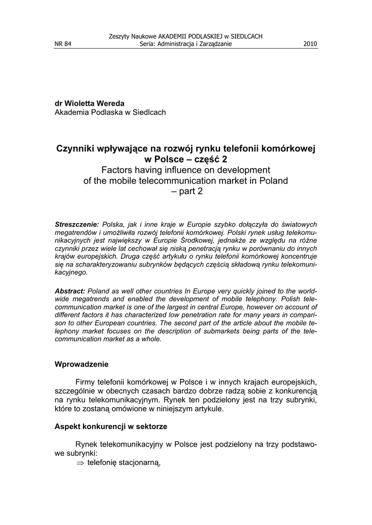 NR 84 Zeszyty Naukowe AKADEMII PODLASKIEJ w SIEDLCACH Seria: Administracja i Zarządzanie 2010 dr Wioletta Wereda Akademia Podlaska w Siedlcach Czynniki wpływające na rozwój rynku telefonii komórkowej w Polsce – część 2 Factors having influence on development of the mobile telecommunication market in Poland – part 2 Streszczenie: Polska, jak i inne kraje w Europie szybko dołączyła do światowych megatrendów i umożliwiła rozwój telefonii komórkowej. Polski rynek usług telekomunikacyjnych jest największy w Europie Środkowej, jednakże ze względu na różne czynniki przez wiele lat cechował się niską penetracją rynku w porównaniu do innych krajów europejskich. Druga część artykułu o rynku telefonii komórkowej koncentruje się na scharakteryzowaniu subrynków będących częścią składową rynku telekomunikacyjnego. Abstract: Poland as well other countries In Europe very quickly joined to the worldwide megatrends and enabled the development of mobile telephony. Polish telecommunication market is one of the largest in central Europe, however on account of different factors it has characterized low penetration rate for many years in comparison to other European countries. The second part of the article about the mobile telephony market focuses on the description of submarkets being parts of the telecommunication market as a whole. Wprowadzenie Firmy telefonii komórkowej w Polsce i w innych krajach europejskich, szczególnie w obecnych czasach bardzo dobrze radzą sobie z konkurencją na rynku telekomunikacyjnym. Rynek ten podzielony jest na trzy subrynki, które to zostaną omówione w niniejszym artykule. Aspekt konkurencji w sektorze Rynek telekomunikacyjny w Polsce jest podzielony na trzy podstawowe subrynki: ⇒ telefonię stacjonarną, 92 W. Wereda ⇒ telefonię mobilną (komórkową), ⇒ dostawców usług internetowych. Telefonia stacjonarna W ramach detalicznego rynku telefonii stacjonarnej przedsiębiorcy telekomunikacyjni zapewniają użytkownikom końcowym usługi dostępu do stacjonarnej sieci oraz usługi połączeń telefonicznych.1 Wielkość rynku telefonii stacjonarnej, mierzona sumą przychodów z usług telefonii stacjonarnej generowanych przez przedsiębiorców telekomunikacyjnych, wykazuje od kilku lat tendencję spadkową. Jest to spowodowane rozwojem rynku telefonii ruchomej i znacznym upowszechnieniem się tych usług wśród społeczeństwa. W roku 2002 spadek ten był jeszcze niewielki, przychody były mniejsze o 0,67% w stosunku do roku 2001. W roku 2003 w stosunku do roku 2002 spadek przychodów był większy – wynosił już 7,72%. Rozwijająca się działalność przedsiębiorstw telekomunikacyjnych (zwłaszcza tych, które posiadają własny numer dostępowy) spowodowała, że przychody z rynku telefonii stacjonarnej w roku 2004 były wyższe niż w roku 2003. Oferta cenowa operatorów alternatywnych okazała się konkurencyjna w stosunku do oferty operatora zasiedziałego. W roku 2004 przychody z rynku wzrosły o 10,18% w stosunku do roku 2003. W roku 2005 przychody z usług świadczonych w sieciach stacjonarnych spadły jednak ponownie o 11,72%. Wśród głównych przyczyn spadku należy wymienić wzrastającą popularność połączeń świadczonych w sieciach ruchomych oraz w technologii IP, w szczególności usług świadczonych bezpłatnie użytkownikom dostępu do Internetu za pomocą tzw. komunikatorów głosowych. Poniżej przedstawione dane są oparte głównie na publikowanym Raporcie o stanie rynku telekomunikacyjnego w 2005 roku, zwanego dalej „Raportem” i jest już trzecim takim raportem przygotowanym przez Regulatora.2 W tej części pracy zostaną w skrócie scharakteryzowani przedsiębiorcy telekomunikacyjni posiadający ponad 1% udziałów pod względem przychodów ze swojej podstawowej działalności telekomunikacyjnej w danej grupie usług, funkcjonujący na rynku w 2006 roku. Do grupy firm telefonii stacjonarnej i oferującej połączenia międzyoperatorskie można zaliczyć: 1. Telekomunikację Polską S.A. – jest to spółka notowana na Giełdzie Papierów Wartościowych w Warszawie oraz w formie GDR-ów (global1 Ze względu na ochronę tajemnicy przedsiębiorstwa w zakresie informacji przesyłanych przez przedsiębiorców telekomunikacyjnych, niektóre dane przedstawione w niniejszym opracowaniu pochodzą z dokumentacji oficjalnie dostępnej (strony internetowej operatorów). 2 Obowiązek jego corocznej publikacji nałożony został na Prezesa Urzędu Komunikacji Elektronicznej w ustawie z dnia 16 lipca 2004 r. Prawo telekomunikacyjne (Dz.U. Nr 171, poz. 1800 z późn. zm.), zwanej dalej Ustawą lub PT. W myśl tego przepisu jest on publikowany na stronach internetowych Urzędu oraz w Biuletynie UKE. Raport ten zgodnie z art. 192 ust. 3 uwzględnia również działania na rzecz ochrony interesów użytkowników telekomunikacyjnych oraz przedstawia cele działalności regulacyjnej w danym roku. UKE dokłada wszelkich starań, aby coroczne raporty stanowiły - zarówno dla przedsiębiorców telekomunikacyjnych, jak i dla użytkowników końcowych usług telekomunikacyjnych - rzetelne źródło wiedzy o stanie polskiego rynku telekomunikacyjnego. Seria: Administracja i Zarządzanie (11)2010 ZN nr 84 Czynniki wpływające na rozwój rynku w telefonii komórkowej w Polsce – część 2 93 nych kwitów depozytowych) na Giełdzie Papierów Wartościowych w Londynie. Największym akcjonariuszem Telekomunikacji Polskiej S.A. jest France Telekom posiadający 47,50% akcji. Udział Skarbu Państwa wynosi 3,87%. Posiadacze GDR reprezentowani przez Bank of New York dysponują 9,98% akcji, a pozostali akcjonariusze 38,65%. Spółka prowadzi działalność na terenie całego kraju. Jest dostawcą, a jednocześnie świadczy usługi detaliczne w zakresie połączeń krajowych i międzynarodowych w sieci stacjonarnej. Jest również operatorem działającym na rynkach hurtowych telefonii stacjonarnej. Telekomunik