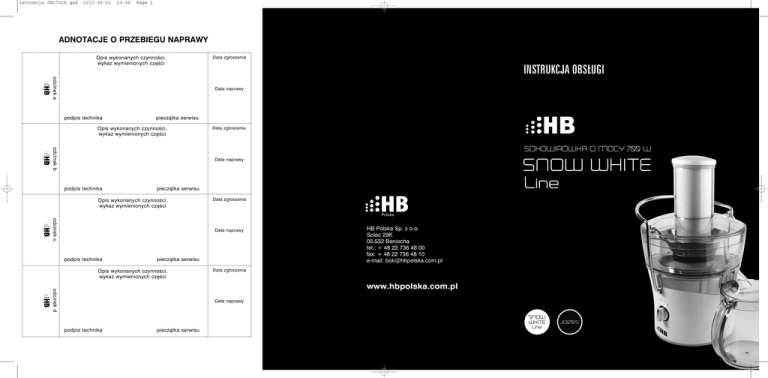 istrukcja JE0701S.qxd 2011-09-01 23:45 Page 1 ADNOTACJE O PRZEBIEGU NAPRAWY Opis wykonanych czynności, wykaz wymienionych części Data zgłoszenia odcinek a INSTRUKCJA OBSŁUGI Data naprawy podpis technika pieczątka serwisu Opis wykonanych czynności, wykaz wymienionych części Data zgłoszenia odcinek b Data naprawy podpis technika pieczątka serwisu Opis wykonanych czynności, wykaz wymienionych części Data zgłoszenia odcinek c Data naprawy podpis technika pieczątka serwisu Opis wykonanych czynności, wykaz wymienionych części HB Polska Sp. z o.o. Solec 29K 05-532 Baniocha tel.: + 48 22 736 48 00 fax: + 48 22 736 48 10 e-mail: [email protected] Data zgłoszenia odcinek d www.hbpolska.com.pl Data naprawy podpis technika pieczątka serwisu Page 4 MODEL PRODUKTU . . . . . . . . . . . . . . . . . . . . . . . . . . . . . . . . . . . . . . . NR SERYJNY . . . . . . . . . . . . . . . . . . . . . . . . . . . . . . . . . . . . . . . . . . . . . . . DATA SPRZEDAŻY . . . . . . . . . . . . . . . . . . . . . . . . . . . . . . . . . . . . . . . . Na produkt udziela się gwarancji na okres 24 miesięcy, która obejmuje wady powstałe z przyczyn tkwiących w sprzedanym urządzeniu. Gwarant zobowiązuje się do bezpłatnego usunięcia ewentualnej niesprawności urządzenia, pod warunkiem wykorzystywania go zgodnie z przeznaczeniem i zaleceniami Instrukcji Obsługi oraz przedstawienia prawidłowo wypełnionej karty gwarancyjnej wraz oryginalnym dowodem zakupu. Naprawa gwarancyjna urządzenia zostanie wykonana w możliwie najkrótszym terminie, nie przekraczającym 14 dni roboczych od daty zgłoszenia usterki. Termin ten może w wyjątkowych przypadkach ulec wydłużeniu do 21 dni roboczych, jeżeli naprawa będzie wymagać sprowadzenia części zamiennych z zagranicy. Zakres niniejszej Gwarancji nie obejmuje żadnych uszkodzeń mechanicznych. Gwarancja niniejsza nie znajduje zastosowania w sytuacji, jeżeli: urządzenie lub dowód jego zakupu będą niezgodne ze sobą lub niemożliwe będzie odczytanie znajdujących się na nich danych, numer seryjny urządzenia będzie zniszczony lub nieczytelny, stwierdzona zostanie ingerencja nieupoważnionych osób lub nieautoryzowanych zakładów serwisowych, uszkodzenie powstanie z przyczyn natury zewnętrznej tj.: zjawiska atmosferyczne, wyładowania elektryczne itp. Gwarant może uchylić się od dotrzymania terminu wykonania naprawy gwarancyjnej, jeżeli zaistnieją zakłócenia w działalności jego przedsiębiorstwa, spowodowane nieprzewidywalnymi okolicznościami, w szczególności takimi jak: niepokoje społeczne, klęski żywiołowe, ograniczenia importowe itp. Podstawę do rozstrzygania ewentualnych sporów powstałych w trakcie realizacji uprawnień wynikających z niniejszej Gwarancji, stanowić będą przepisy prawa obowiązujące na terytorium Rzeczypospolitej Polskiej. pieczątka sklepu KARTA GWARANCYJNA pieczątka sklepu 23:45 pieczątka sklepu 2011-09-01 Gwarancja niniejsza nie wyłącza, nie ogranicza ani nie zawiesza uprawnień Kupującego wynikających z niezgodności towaru z umową. W przypadku produktu zakupionego przez przedsiębiorcę na fakturę VAT, okres gwarancji zostaje skrócony do 12 miesięcy Lista punktów serwisowych znajduje się na stronie www.hbpolska.com.pl HB Polska Sp. z o.o. Solec 29K 05-532 Baniocha tel.: + 48 22 736 48 00 fax.: + 48 22 736 48 10 e-mail: [email protected] pieczątka sklepu istrukcja JE0701S.qxd istrukcja JE0701S.qxd 2011-09-01 23:45 Page 7 GRATULUJEMY! Kupując sokowirówkę marki HB, wybrali Państwo jedno z najlepszych tego typu urządzeń dostępnych obecnie na rynku. Prawidłowo używana i konserwowana sokowirówka, zapewni Państwu wiele lat satysfakcjonującego działania. Przepisy bezpieczeństwa: Przed rozpoczęciem użytkowania sokowirówki należy dokładnie zapoznać się z niniejszą instrukcją obsługi i bezwzględnie jej przestrzegać. Instrukcję obsługi wraz z kartą gwarancyjną oraz dowodem zakupu należy przechowywać w łatwo dostępnym miejscu. Należy upewnić się, że napięcie w sieci jest takie samo jak wskazane na urządzeniu. W celu uniknięcia pożaru, względnie wstrząsu elektrycznego należy podłączyć urządzenie bezpośrednio do gniazdka elektrycznego całkowicie wsuwając do niego wtyczkę. Nie należy używać kabla przedłużającego. Zawsze należy wyłączać urządzenie ze źródła prądu, jeżeli następuje opróżnianie pojemnika z miazgą, zamiana akcesoriów lub czyszczenie urządzenia. W żadnym wypadku NIE WOLNO dotykać wtyczki sokowirówki wilgotnymi rękami. Niniejszy sprzet nie jest przeznaczony do uzytkowania przez osoby (w tym dzieci) o ograniczonej zdolnosci fizycznej, czuciowej lub psychicznej, osoby nie majace doswiadczenia lub znajomosci sprzetu, chyba, ze odbywa sie to pod nadzorem lub zgodnie z instrukcja uzytkowania sprzetu, przekazana przez osoby odpowiadajace za ich bezpieczenstwo. Nalezy zwrócic uwage, aby dzieci nie bawily sie sprzetem. Urządzenie przeznaczone jest wyłącznie do użytku przez osoby dorosłe i powinno znajdować się poza zasięgiem dzieci. Przed użyciem należy sprawdzić, czy urządzenie nie jest uszkodzone, należy zwrócić szczególną uwagę na przewód zasilający. Jeżeli jakakolwiek część jest uszkodzona, NIE WOLNO korzystać z urządzenia. NIE WOLNO włączać urządzenia, gdy w pobliżu znajdują się wybuchowe i/lub łatwopalne opary. Nie należy wystawiać urządzenia na działanie promieni słonecznych, gorących powierzchni, wilgoci, ostrych krawędzi i tym podobnych. Nie stawiać sokowirówki w pobliżu nieosłoniętego płomienia, ani w pobliżu urządzeń kuchennych lub grzewczych. W celu zapewnienia właściwego działania urządzenia należy upewnić się, czy zostało ono umieszczone na twardej, równej oraz wodoszczelnej powierzchni. Przewód zasilający nie powinien zwisać ze stołu, blatu lub tp., ani dotykać żadnych rozgrzanych powierzchni. NIE WOLNO zanurzać urządzenia w wodzi