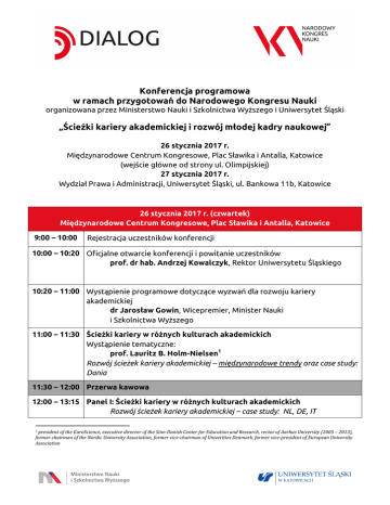 Konferencja programowa w ramach przygotowań do Narodowego Kongresu Nauki organizowana przez Ministerstwo Nauki i Szkolnictwa Wyższego i Uniwersytet Śląski „Ścieżki kariery akademickiej i rozwój młodej kadry naukowej” 26 stycznia 2017 r. Międzynarodowe Centrum Kongresowe, Plac Sławika i Antalla, Katowice (wejście główne od strony ul. Olimpijskiej) 27 stycznia 2017 r. Wydział Prawa i Administracji, Uniwersytet Śląski, ul. Bankowa 11b, Katowice 26 stycznia 2017 r. (czwartek) Międzynarodowe Centrum Kongresowe, Plac Sławika i Antalla, Katowice 9:00 – 10:00 Rejestracja uczestników konferencji 10:00 – 10:20 Oficjalne otwarcie konferencji i powitanie uczestników prof. dr hab. Andrzej Kowalczyk, Rektor Uniwersytetu Śląskiego 10:20 – 11:00 Wystąpienie programowe dotyczące wyzwań dla rozwoju kariery akademickiej dr Jarosław Gowin, Wicepremier, Minister Nauki i Szkolnictwa Wyższego 11:00 – 11:30 Ścieżki kariery w różnych kulturach akademickich Wystąpienie tematyczne: prof. Lauritz B. Holm-Nielsen1 Rozwój ścieżek kariery akademickiej – międzynarodowe trendy oraz case study: Dania 11:30 – 12:00 Przerwa kawowa 12:00 – 13:15 Panel I: Ścieżki kariery w różnych kulturach akademickich Rozwój ścieżek kariery akademickiej – case study: NL, DE, IT president of the EuroScience, executive director of the Sino-Danish Center for Education and Research, rector of Aarhus University (2005 – 2013), former chairman of the Nordic University Association, former vice-chairman of Univerities Denmark, former vice-president of European University Association 1 13:15 – 14:15 Lunch 14:15 – 15:45 Panel II: Ścieżki kariery i rozwój młodej kadry naukowej w kontekście ustawy 2.0 Moderator: prof. Aleksander Bobko, Sekretarz Stanu MNiSW 15:45 – 16:00 Przerwa kawowa 16.00 – 17.15 Panel III: System uprawnień do nadawania stopni naukowych i tytułu naukowego Moderator: prof. Jakub Fichna, Akademia Młodych Uczonych, Uniwersytet Łódzki Tematy: uprawnienia uczelni czy uprawnienia wydziału do nadawania stopni i tytułów; uprawnienia a doskonałość naukowa; rola Centralnej Komisji, ewentualna reforma CK 17:15 – 17:30 Przerwa kawowa 17.30 – 18.45 Seminaria cz. I – sesje równoległe: Sesja I „Dydaktyczna ścieżka kariery akademickiej” Temat: model awansu zawodowego w ramach ścieżki dydaktycznej Moderator: dr Dobromir Dziewulak, Uniwersytet Warszawski Sesja II „Interdyscyplinarność ścieżek kariery ” Tematy: czy utrzymać obowiązującą trójstopniową strukturę obszarów, dziedzin i dyscyplin; jeśli zmieniać to jak?; granty interdyscyplinarne Moderator: prof. Bartosz Brożek, Uniwersytet Jagielloński Sesja III „Model kariery akademickiej a zróżnicowanie dyscyplin nauki i sztuki” Tematy: m.in. perspektywa uczelni artystycznych Moderator: prof. Antoni Cygan, rektor ASP Katowice, Przewodniczący Konferencji Rektorów Uczelni Artystycznych Sesja IV: „Wyzwania etyczne w związku z karierą naukową” Tematy: etos akademicki; deregulacja przy samoregulacji środowiska, etc., kwestia postępowań dyscyplinarnych dla nauczycieli akademickich Moderator: prof. Ewa Małecka-Tendera, Konwent Rzeczników, rektor SUM 2008-2012, przewodnicząca Konferencji Rektorów Akademickich Uczelni Medycznych 2008-2012 Sesja V: „Konkursy oraz kryteria awansu kadry akademickiej" dobre praktyki - mobilność młodych naukowców, konkursy, karty oceny osiągnięcia, ocena parametryczna, ocena kompetencji dydaktycznych Moderator: prof. Leszek Kaczmarek, Instytut Biologii Doświadczalnej im. M. Nenckiego PAN, członek Rady NCN Sesja VI: „Mobilność pracowników dydaktycznych w programie Erasmus+ jako narzędzie rozwoju młodej kadry naukowej. Korzyści i wyzwania dla uczestników i instytucji” Moderator: Beata Skibińska, Fundacja Rozwoju Systemu Edukacji; Dorota Rytwińska, Fundacja Rozwoju Systemu Edukacji Wydarzenie towarzyszące Centrum Informacji Naukowej i Biblioteka Akademicka, ul. Bankowa 11a, Katowice 14:30-16:00 Debata oksfordzka nad tezą: W Polsce warto iść na studia doktoranckie Organizator: Fundacja Rozwoju Systemu Edukacji 27 stycznia 2017 r. (piątek) Wydział Prawa i Administracji Uniwersytet Śląski, ul. Bankowa 11b, Katowice 09:00 – 09:30 Wystąpienie wprowadzające do drugiego dnia konferencji Prof. Wiesław Banyś – honorowy przewodniczący KRASP, współprzewodniczący Zespołu Rady NKN ds. kariery akademickiej 09:30 – 10:00 Wystąpienie tematyczne/programowe Prof. Łukasz Szumowski - Podsekretarz stanu, MNiSW Koncepcja tzw. dużego doktoratu 10:00 – 11:30 Panel IV: Rozwój młodych naukowców: studia doktoranckie i kariera po doktoracie Tematy: studia doktoranckie, graduate schools, doktoraty wdrożeniowe vs ścieżki; obowiązkowa mobilność, cyrkulacja kadr, zagraniczni doktoranci; zagraniczni mentorzy i recenzenci; staże podoktorskie; mobilność Moderator: prof. Łukasz Szumowski, Podsekretarz stanu, MNiSW 11:30 – 12.00 Przerwa kawowa 12:00 – 13:15 Seminaria: cz. II – sesje równoległe: Sesja VII: „Bezpieczeństwo socjalne w rozwoju kariery naukowej: wynagrodzenia, stosunek pracy, sprawy socjalne, doskonalenie zawodowe, mentoring” Moderator: dr hab. Krzysztof Walczak, Uniwersytet Warszawski Sesja VIII: „Profesura oraz stan spoczynku jako model zakończenia kariery naukowej” tytuł profesora i profesorzy uczelniani, stan spoczynku profesorów, modele stanu spoczynku w państwach OECD i UE Moderator: prof. Maciej Żylicz, Fundacja na Rzecz Nauki Polskiej Sesja IX: „Równość szans i płci w karierze akademickiej” Moderator: dr Anna Budzanowska, Dyrektor generalny MNiSW Sesja X „Habilitacja: przeszkoda czy pomoc w rozwoju naukowym” Optymalne rozwiązania dotyczące kariery naukowej po doktoracie, uprawnienia do habilitacji Moderator: dr hab. Aneta Pieniądz, Obywatele Nauki 13:15 – 14:30 Podsumowanie wszystkich seminariów oraz konferencji przez prowadzących Podsumowanie: prof. Jaros