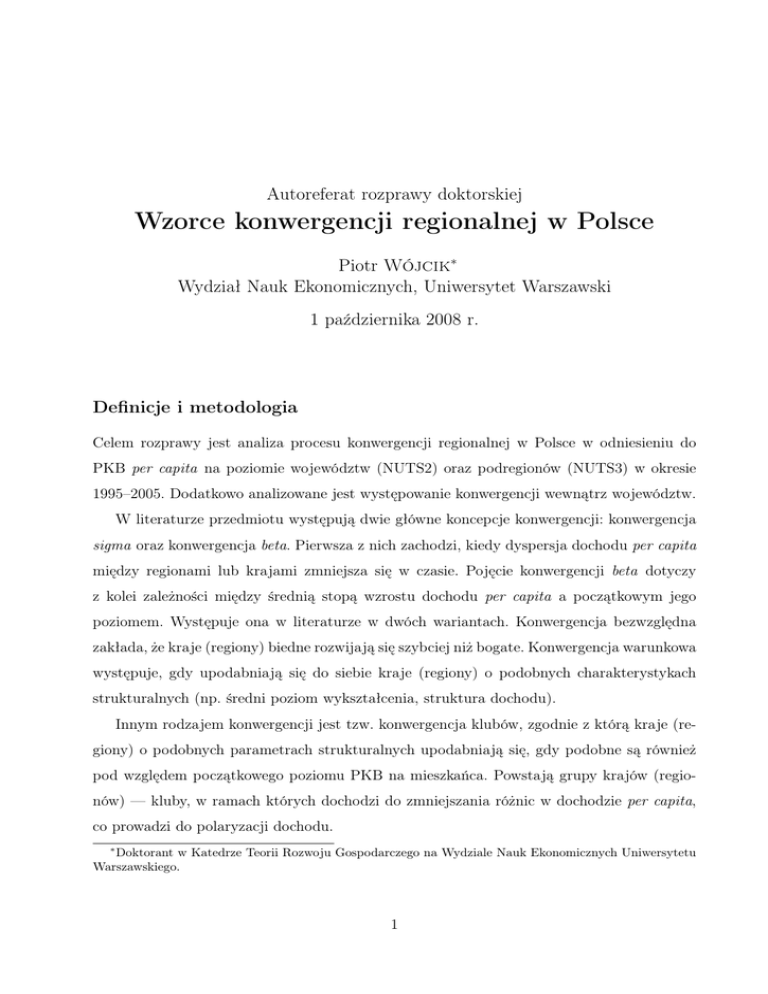 Autoreferat rozprawy doktorskiej Wzorce konwergencji regionalnej w Polsce Piotr Wójcik∗ Wydział Nauk Ekonomicznych, Uniwersytet Warszawski 1 października 2008 r. Definicje i metodologia Celem rozprawy jest analiza procesu konwergencji regionalnej w Polsce w odniesieniu do PKB per capita na poziomie województw (NUTS2) oraz podregionów (NUTS3) w okresie 1995–2005. Dodatkowo analizowane jest występowanie konwergencji wewnątrz województw. W literaturze przedmiotu występują dwie główne koncepcje konwergencji: konwergencja sigma oraz konwergencja beta. Pierwsza z nich zachodzi, kiedy dyspersja dochodu per capita między regionami lub krajami zmniejsza się w czasie. Pojęcie konwergencji beta dotyczy z kolei zależności między średnią stopą wzrostu dochodu per capita a początkowym jego poziomem. Występuje ona w literaturze w dwóch wariantach. Konwergencja bezwzględna zakłada, że kraje (regiony) biedne rozwijają się szybciej niż bogate. Konwergencja warunkowa występuje, gdy upodabniają się do siebie kraje (regiony) o podobnych charakterystykach strukturalnych (np. średni poziom wykształcenia, struktura dochodu). Innym rodzajem konwergencji jest tzw. konwergencja klubów, zgodnie z którą kraje (regiony) o podobnych parametrach strukturalnych upodabniają się, gdy podobne są również pod względem początkowego poziomu PKB na mieszkańca. Powstają grupy krajów (regionów) — kluby, w ramach których dochodzi do zmniejszania różnic w dochodzie per capita, co prowadzi do polaryzacji dochodu. ∗ Doktorant w Katedrze Teorii Rozwoju Gospodarczego na Wydziale Nauk Ekonomicznych Uniwersytetu Warszawskiego. 1 Piotr Wójcik Wzorce konwergencji regionalnej w Polsce Podejście klasyczne Analiza konwergencji typu beta polega na estymacji równania regresji, w którym na przeciętną stopę realnego wzrostu PKB per capita wpływa początkowy poziom dochodu oraz, przy testowaniu konwergencji warunkowej, inne zmienne strukturalne. Negatywna zależność między stopą wzrostu a początkowym dochodem oznacza występowanie konwergencji. Metoda ta była kwestionowana przez Friedmana (1992), a szczególnie przez Quaha (1993, 1996a, 1996b). Po pierwsze fakt, że biedne regiony rozwijają się szybciej niż bogatsze nie musi wcale oznaczać zmniejszania dystansu między nimi — może wystąpić tzw. paradoks Galtona. Negatywna zależność między stopą wzrostu i początkowym poziomem dochodu nie implikuje zmniejszania się dyspersji rozkładu. Możliwe jest występowanie takiej zależności nawet w przypadku dywergencji. Wynika to z faktu, że zawsze będą pojawiały się kraje (regiony) rozwijające się bardzo szybko i bardzo wolno, ale wpływ na to mają również czynniki losowe. Paradoks regresji w stronę średniej polega na błędnej interpretacji przejściowej natury obserwacji skrajnych jako dowodu na zmniejszanie się dyspersji rozkładu. Po drugie, standardowa przekrojowa analiza regresji bada zachowanie reprezentatywnego kraju (regionu) w analizowanej próbie, podczas gdy interesująca jest obserwacja pełnego rozkładu i jego ewolucji w czasie. Po trzecie, klasyczna analiza konwergencji nie umożliwia weryfikacji hiptezy o występowaniu konwergencji klubów. Występuje więc potrzeba zastosowania innych metod pozwalających uniknąć opisanych powyżej problemów. Metodologia analizy pełnego rozkładu Mobilność wewnątrz rozkładu może być modelowana na dwa sposoby: przy pomocy macierzy przejścia zapożyczonych z procesów Markowa, czyli warunkowego rozkładu prawdopodobieństwa w wersji dyskretnej lub też poprzez oszacowanie pełnej warunkowej funkcji gęstości z wykorzystaniem estymacji jądrowej (ang. kernel density estimation). Obie metody pozwalają oszacować prawdopodobieństwo, z jakim dany kraj (region) będzie w badanym okresie stawał się relatywnie bogatszy, biedniejszy, bądź też, że jego dochód nie ulegnie zmianie względem przeciętnego dochodu w próbie. Analiza pełnego rozkładu umożliwia również weryfikację hipotezy o polaryzacji dochodu (konwergencji klubów). 2 Piotr Wójcik Wzorce konwergencji regionalnej w Polsce Macierze przejścia Szacowane elementy macierzy przejścia odzwierciedlają prawdopodobieństwo przejścia poszczególnych krajów (regionów) między określonymi klasami dochodu, czyli np. z grupy regionów o dochodzie poniżej przeciętnego do grupy o dochodzie ponadprzeciętnym. Ograniczeniem wariantu dyskretnego jest arbitralność doboru przedziałów rozdzielających poszczególne klasy dochodu — różny podział może doprowadzić do różnych wyników. Problem ten nie występuje w przypadku estymacji warunkowej funkcji gęstości. Estymacja jądrowa W przypadku ciągłym zamiast macierzy przejścia ze skończoną liczbą stanów dokonywana jest estymacja pełnej warunkowej funkcji gęstości, pokazującej dynamikę PKB per capita w czasie. Warunkowa funkcja gęstości rozkładu jest trójwymiarową powierzchnią, ale zwykle analizuje się łatwiejszy w interpretacji jej wykres konturowy, będący pionowym rzutem warunkowej funkcji gęstości na płaszczyznę podstawy. Obrazuje on rozkład masy prawdopodobieństwa przejścia kraju (regionu) między poszczególnymi wartościami PKB per capita w analizowanym okresie. Hipotezy badawcze W pracy zostały poddane weryfikacji następujące hipotezy badawcze: 1. W Polsce nie występuje konwergencja absolutna na poziomie regionalnym — zarówno na poziomie województw, jak i podregionów. 2. Konwergencja absolutna nie występuje również wewnątrz województw. 3. Na poziomie województw oraz podregionów zachodzi proces polaryzacji dochodów oraz występuje konwergencja klubów. 4. Konwergencja klubów i polaryzacja występuje również wewnątrz województw. Zostały również zbadane główne czynniki wpływające na konwergencję warunkową regionalnego dochodu. 3 Piotr Wójcik Wzorce konwergencji regionalnej w Polsce Analiza konwergencji regionalnej 