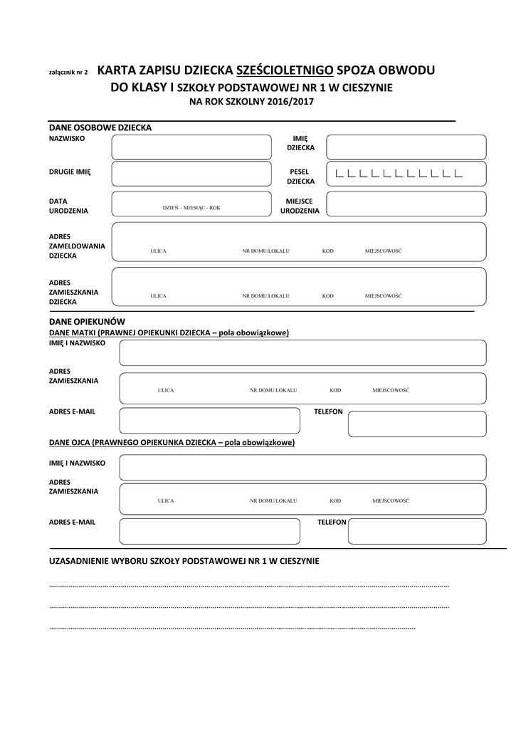 załącznik nr 2 KARTA ZAPISU DZIECKA SZEŚCIOLETNIGO SPOZA OBWODU DO KLASY I SZKOŁY PODSTAWOWEJ NR 1 W CIESZYNIE NA ROK SZKOLNY 2016/2017 DANE OSOBOWE DZIECKA NAZWISKO IMIĘ DZIECKA DRUGIE IMIĘ PESEL DZIECKA DATA URODZENIA ADRES ZAMELDOWANIA DZIECKA ADRES ZAMIESZKANIA DZIECKA DZIEŃ – MIESIĄC - ROK ∟∟∟∟∟∟∟∟∟∟∟ MIEJSCE URODZENIA ULICA NR DOMU/LOKALU KOD MIEJSCOWOŚĆ ULICA NR DOMU/LOKALU KOD MIEJSCOWOŚĆ DANE OPIEKUNÓW DANE MATKI (PRAWNEJ OPIEKUNKI DZIECKA – pola obowiązkowe) IMIĘ I NAZWISKO ADRES ZAMIESZKANIA ULICA NR DOMU/LOKALU ADRES E-MAIL KOD MIEJSCOWOŚĆ TELEFON DANE OJCA (PRAWNEGO OPIEKUNKA DZIECKA – pola obowiązkowe) IMIĘ I NAZWISKO ADRES ZAMIESZKANIA ULICA ADRES E-MAIL NR DOMU/LOKALU KOD MIEJSCOWOŚĆ TELEFON UZASADNIENIE WYBORU SZKOŁY PODSTAWOWEJ NR 1 W CIESZYNIE ………………………………………………………………………………………………………………………………………………………………………………… ………………………………………………………………………………………………………………………………………………………………………………… …………………………………………………………………………………………………………………………………………………………………. ZAZNACZYĆ WŁAŚCIWE KRYTERIA: Lp. Kryteria brane pod uwagę przy rekrutacji dzieci spoza obwodu 1 2 3 4 5 6 Zaznaczyć „ X” tak nie Miejsce zamieszkania kandydata na terenie Gminy Cieszyn poza obwodem danej szkoły Rodzeństwo kandydata spełnia obowiązek szkolny w danej szkole W obwodzie danej szkoły zamieszkują krewni kandydata (babcia, dziadek) wspierający rodziców (opiekunów prawnych) w zapewnieniu mu należytej opieki Miejsce pracy jednego z rodziców znajduje się w obwodzie danej szkoły Kandydat spełnia obowiązek rocznego przygotowania przedszkolnego w przedszkolu mającym siedzibę w obwodzie danej szkoły Rodzeństwo kandydata spełnia obowiązek szkolny w gimnazjum mającym siedzibę w obwodzie danej szkoły INFORMACJE O SZKOLE REJONOWEJ DZIECKA …………………………………………………………………………………………………………………………………………………………………………. NAZWA ADRES PLACÓWKI DRUGIEJ I TRZECIEJ PREFERENCJI KOLEJNE PREFEROWANE SZKOŁY DLA ZGŁASZANEGO DZIECKA (wpisać nazwę szkoły) 2. Preferencja 3. Preferencja DEKLARUJĘ, ŻE MOJE DZIECKO BĘDZIE UCZĘSZCZAĆ NA ZAJĘCIA Z : 1. RELIGII KATOLICKIEJ 2. RELIGII EWANGELICKIEJ 3. ETYKA 4. INNEGO WYZNANIA ................................................................................... (proszę podać jakiego) PROSZĘ WSTAWIĆ „X” WE WŁAŚCIWYM MIEJSCU CZY DZIECKO POSIADA ORZECZENIE/ OPINIĘ/ DIAGNOZĘ PORADNI- PSYCHOLOGICZNOPEDAGOGICZNEJ PROSZĘ WSTAWIĆ „X” WE WŁAŚCIWYM MIEJSCU TAK NIE DZIECKO UCZĘSZCZAŁO DO PRZEDSZKOLA TAK NIE PROSZĘ WSTAWIĆ „X” WE WŁAŚCIWYM MIEJSCU Nazwa i dane teleadresowe przedszkola ………………………………………………………………………………………………………….. Okres nieobecności w przedszkolu…………………………………………………………………………………………………………………… W PRZYPADKU NIE UCZĘSZCZANIA DZIECKA DO PRZEDSZKOLA DO WNIOSKU NALEŻY DOŁĄCZYĆ OPINIĘ Z PORADNI PSYCHOLOGICZNO-PEDAGOGICZNEJ POUCZENIE O ODPOWIEDZIALNOŚCI KARNEJ Pouczony o odpowiedzialności karnej z art. 233 § 1 Kodeksu karnego oświadczam, że podane przeze mnie dane są zgodne z prawdą. …………………………………………… PODPIS RODZICA /OPIEKUNA OŚWIADCZENIE ZGODY NA PRZETWARZANIE DANYCH OSOBOWYCH Wyrażam zgodę na zbieranie, przetwarzanie i wykorzystywanie przez Szkołę Podstawową nr 1 w Cieszynie, ul. Matejki 3, 43-400 CIESZYN: danych osobowych mojego dziecka oraz moich, jako rodzica (opiekuna prawnego), a także wizerunku mojego dziecka w gazetkach i tablicach szkolnych oraz na stronie internetowej naszej szkoły w zakresie działalności dydaktyczno – wychowawczo – opiekuńczej zgodnie z Ustawą o Ochronie Danych Osobowych (Dz. U. z 1997 r. nr 133, poz. 883 z późn. zm.) oraz z Rozporządzenie Ministra Edukacji Narodowej z dnia 20 sierpnia 2010 r. zmieniające rozporządzenie w sprawie warunków i sposobu oceniania, klasyfikowania i promowania uczniów i słuchaczy oraz przeprowadzania sprawdzianów i egzaminów w szkołach publicznych ( Dz. U. Dz.U. 2010 nr 156 poz. 1046). Przyjmuję do wiadomości, że przysługuje mi prawo wglądu do przetwarzanych danych osobowych i ich poprawiania w siedzibie szkoły. ................................................... ................................................... DATA PRZYJĘCIA ZGŁOSZENIA (WYPEŁNIA PLACÓWKA) DATA I PODPIS RODZICA / OPIEKUNA W celu weryfikacji danych DO WGLĄDU przedłożyć należy skrócony akt urodzenia, dowód osobisty, paszport lub inny dokument dziecka