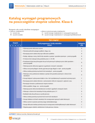 Matematyka | Matematyka wokół nas | Klasa 6 Szkoła podstawowa 4–6 Katalog wymagań programowych na poszczególne stopnie szkolne. Klasa 6 Kategorie celu zostały określone następująco: • dotyczy wiadomości • dotyczy przetwarzania wiadomości A – uczeń zna C – uczeń stosuje wiadomości w sytuacjach typowych B – uczeń rozumie D – uczeń stosuje wiadomości w sytuacjach problemowych Opis osiągnięć Stopień 6 5 4 3 2 Dział programowy: Liczby naturalne Uczeń: Kategoria celu • Wykonuje proste obliczenia czasowe. B • Wymienia jednostki opisujące prędkość, drogę, czas. A • Rozwiązuje proste zadania dotyczące obliczania wydatków. B • Dodaje, odejmuje, mnoży, dzieli liczby naturalne w pamięci i sposobem pisemnym – proste przypadki. B • W zbiorze liczb wskazuje liczby podzielne przez 2, 5, 10, 100. B • Przedstawia liczbę dwucyfrową jako iloczyn liczb pierwszych wybranym przez siebie sposobem – proste przypadki. B • Wykonuje proste obliczenia zegarowe na godzinach, minutach i sekundach. B • Oblicza rzeczywistą długość odcinka, gdy dana jest jego długość w skali – proste przypadki. B • Oblicza średnią arytmetyczną dwóch liczb naturalnych – proste przypadki. B • Wykonuje cztery podstawowe działania w pamięci lub sposobem pisemnym w zbiorze liczb naturalnych. B • S tosuje kolejność wykonywania działań w dwu- lub trzydziałaniowych wyrażeniach arytmetycznych. C • Rozwiązuje proste zadania tekstowe z zastosowaniem obliczeń związanych z upływem czasu. C • Rozwiązuje równania o podstawowym stopniu trudności. C • Oblicza prędkość, drogę, czas – proste przypadki. C • Wykonuje proste obliczenia kalendarzowe na dniach, tygodniach, miesiącach, latach. C • Wskazuje w zbiorze liczb naturalnych liczby podzielne przez 3, 9. B • Rozkłada liczbę dwucyfrową na czynniki pierwsze. C • Oblicza średnią arytmetyczną dwóch lub trzech liczb naturalnych. B • Stosuje działania na liczbach naturalnych do rozwiązywania typowych zadań tekstowych. C • Oblicza wartość wyrażenia arytmetycznego wielodziałaniowego. D • Stosuje obliczanie średniej arytmetycznej do rozwiązywania nieskomplikowanych zadań tekstowych. C • Wyjaśnia pojęcia: dzielnik, wielokrotność, liczba pierwsza i złożona. C AUTORZY: Helena Lewicka, Marianna Kowalczyk 1 © Copyright by Wydawnictwa Szkolne i Pedagogiczne sp. z o.o., Warszawa 2014 Matematyka | Matematyka wokół nas | Klasa 6 6 5 4 3 2 Szkoła podstawowa 4–6 Opis osiągnięć • Podaje cechy podzielności liczb przez 2, 5, 10, 100, 3, 9. B • Na podstawie rozkładu liczby na czynniki pierwsze podaje wszystkie dzielniki liczby złożonej. C • Objaśnia sposób obliczania niewiadomej w dodawaniu, odejmowaniu, mnożeniu, dzieleniu. C • Rozwiązuje zadania o podwyższonym stopniu trudności z zastosowaniem obliczeń zegarowych. C • Oblicza wartość wyrażenia arytmetycznego z zastosowaniem nawiasów kwadratowych i wyjaśnia kolejność wykonywania działań. D • Rozwiązuje zadania tekstowe o podwyższonym stopniu trudności z zastosowaniem działań na liczbach naturalnych i równań. D • Weryfikuje wynik zadania tekstowego, oceniając sensowność rozwiązania. D • Wyjaśnia cechy podzielności liczb naturalnych i stosuje je w zadaniach tekstowych. D • Stosuje obliczanie średniej arytmetycznej liczb naturalnych w rozwiązywaniu zadań o podwyższonym stopniu trudności. D • Uzasadnia wykonalność działań w zbiorze liczb naturalnych. D • Rozwiązuje zadania problemowe z zastosowaniem działań na liczbach naturalnych. D Stopień Dział programu: Własności figur płaskich Uczeń: 6 5 4 3 2 Kategoria celu • Rozróżnia i nazywa podstawowe figury płaskie. A • Mierzy długość odcinka i podaje ją w odpowiednich jednostkach. A • Rozpoznaje odcinki i proste prostopadłe i równoległe. A • Wyróżnia wierzchołki, boki i kąty wielokątów. A • Rozróżnia rodzaje kątów. A • Mierzy kąty mniejsze od kąta półpełnego. B • Oblicza obwód wielokąta, gdy długości boków są liczbami naturalnymi, wyrażonymi w takich samych jednostkach. B • Wskazuje trójkąt na podstawie jego nazwy. B • Wskazuje wysokości w trójkącie. A • Podaje nazwy czworokątów. A • Wskazuje wysokości trapezów. A • Rozpoznaje wielokąty. A • Określa, czy dane kąty należą do tego samego trójkąta. C • Rysuje proste i odcinki prostopadłe i równoległe. B • Zamienia jednostki długości. C • Rozróżnia kąty wierzchołkowe i przyległe. C •W skazuje wielokąty wklęsłe i wypukłe. B • Mierzy i rysuje kąty wypukłe. B • Mierzy kąty wewnętrzne trójkąta i czworokąta. B AUTORZY: Helena Lewicka, Marianna Kowalczyk 2 © Copyright by Wydawnictwa Szkolne i Pedagogiczne sp. z o.o., Warszawa 2014 Matematyka | Matematyka wokół nas | Klasa 6 6 5 4 3 2 Stopień 6 5 4 3 2 Szkoła podstawowa 4–6 Opis osiągnięć • Podaje sumę miar kątów wewnętrznych trójkąta i czworokąta. A • Rysuje wskazane trójkąty i czworokąty. B • Rysuje wysokości w trójkątach i trapezach. B • Rozróżnia trójkąty i czworokąty na podstawie ich własności – proste przypadki. C • Rozwiązuje proste zadania z zastosowaniem własności figur płaskich. C • Stosuje twierdzenie o sumie kątów w trójkącie. C • Konstruuje trójkąt z trzech odcinków. B • Zapisuje wyrażenie algebraiczne opisujące obwód wielokąta i oblicza jego wartość liczbową – proste przypadki. C • Czyta wyrażenie algebraiczne opisujące obwód figury – proste przypadki. B • Zapisuje symbolicznie równoległość i prostopadłość odcinków i prostych. B • Wyznacza odległość punktu od prostej i odległość dwóch prostych. B • Mierzy i rysuje kąty wklęsłe. C • Oblicza miary kątów wierzchołkowych i przyległych. C • Wyjaśnia nierówność trójkąta. C • Podaje własności trójkątów i czworokątów. B • Rysuje 