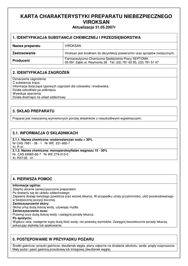 karta charakterystyki preparatu niebezpiecznego viroksan - Medi-Sept