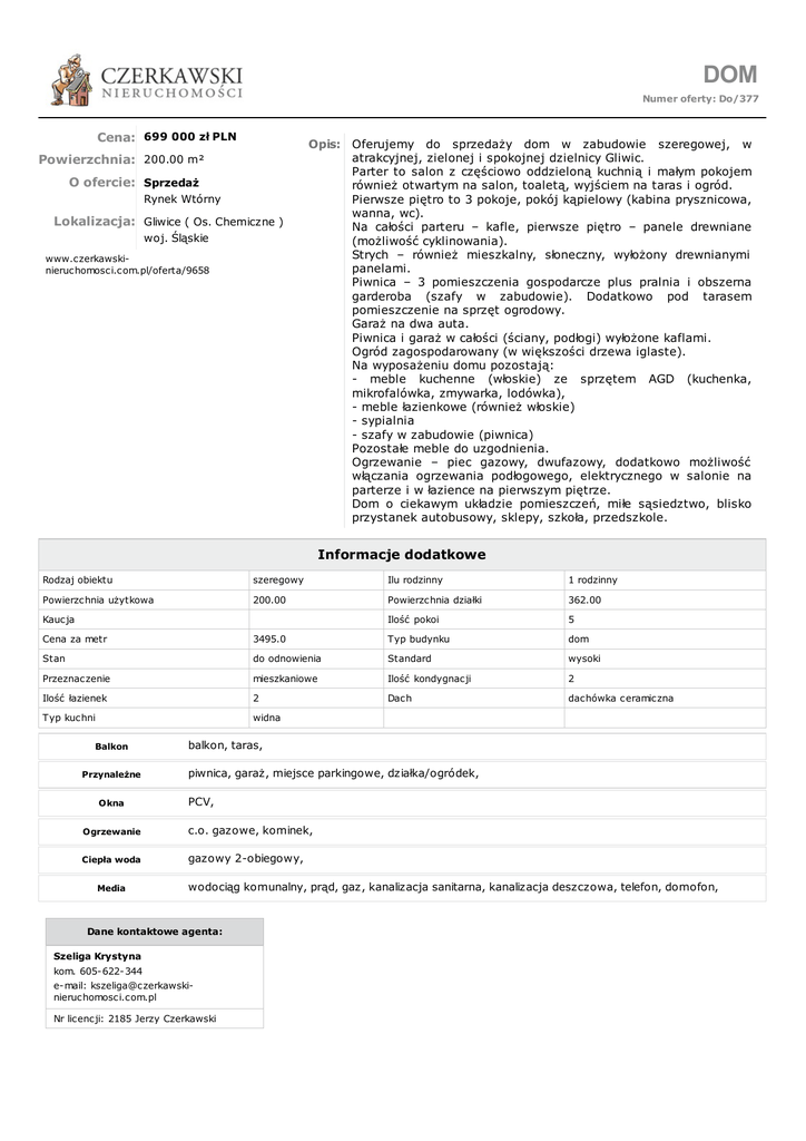 DOM Numer oferty: Do/377 Cena: 699 000 zł PLN Powierzchnia: 200.00 m² O ofercie: Sprzedaż Rynek Wtórny Lokalizacja: Gliwice ( Os. Chemiczne ) woj. Śląskie www.czerkawskinieruchomosci.com.pl/oferta/9658 Opis: Oferujemy do sprzedaży dom w zabudowie szeregowej, w atrakcyjnej, zielonej i spokojnej dzielnicy Gliwic. Parter to salon z częściowo oddzieloną kuchnią i małym pokojem również otwartym na salon, toaletą, wyjściem na taras i ogród. Pierwsze piętro to 3 pokoje, pokój kąpielowy (kabina prysznicowa, wanna, wc). Na całości parteru – kafle, pierwsze piętro – panele drewniane (możliwość cyklinowania). Strych – również mieszkalny, słoneczny, wyłożony drewnianymi panelami. Piwnica – 3 pomieszczenia gospodarcze plus pralnia i obszerna garderoba (szafy w zabudowie). Dodatkowo pod tarasem pomieszczenie na sprzęt ogrodowy. Garaż na dwa auta. Piwnica i garaż w całości (ściany, podłogi) wyłożone kaflami. Ogród zagospodarowany (w większości drzewa iglaste). Na wyposażeniu domu pozostają: - meble kuchenne (włoskie) ze sprzętem AGD (kuchenka, mikrofalówka, zmywarka, lodówka), - meble łazienkowe (również włoskie) - sypialnia - szafy w zabudowie (piwnica) Pozostałe meble do uzgodnienia. Ogrzewanie – piec gazowy, dwufazowy, dodatkowo możliwość włączania ogrzewania podłogowego, elektrycznego w salonie na parterze i w łazience na pierwszym piętrze. Dom o ciekawym układzie pomieszczeń, miłe sąsiedztwo, blisko przystanek autobusowy, sklepy, szkoła, przedszkole. Informacje dodatkowe Rodzaj obiektu szeregowy Ilu rodzinny 1 rodzinny Powierzchnia użytkowa 200.00 Powierzchnia działki 362.00 Kaucja Ilość pokoi 5 Cena za metr 3495.0 Typ budynku dom Stan do odnowienia Standard wysoki Przeznaczenie mieszkaniowe Ilość kondygnacji 2 Ilość łazienek 2 Dach dachówka ceramiczna Typ kuchni widna Balkon Przynależne Okna balkon, taras, piwnica, garaż, miejsce parkingowe, działka/ogródek, PCV, Ogrzewanie c.o. gazowe, kominek, Ciepła woda gazowy 2-obiegowy, Media wodociąg komunalny, prąd, gaz, kanalizacja sanitarna, kanalizacja deszczowa, telefon, domofon, Dane kontaktowe agenta: Szeliga Krystyna kom. 605-622-344 e-mail: [email protected] Nr licencji: 2185 Jerzy Czerkawski www.czerkawski-nieruchomosci.com.pl