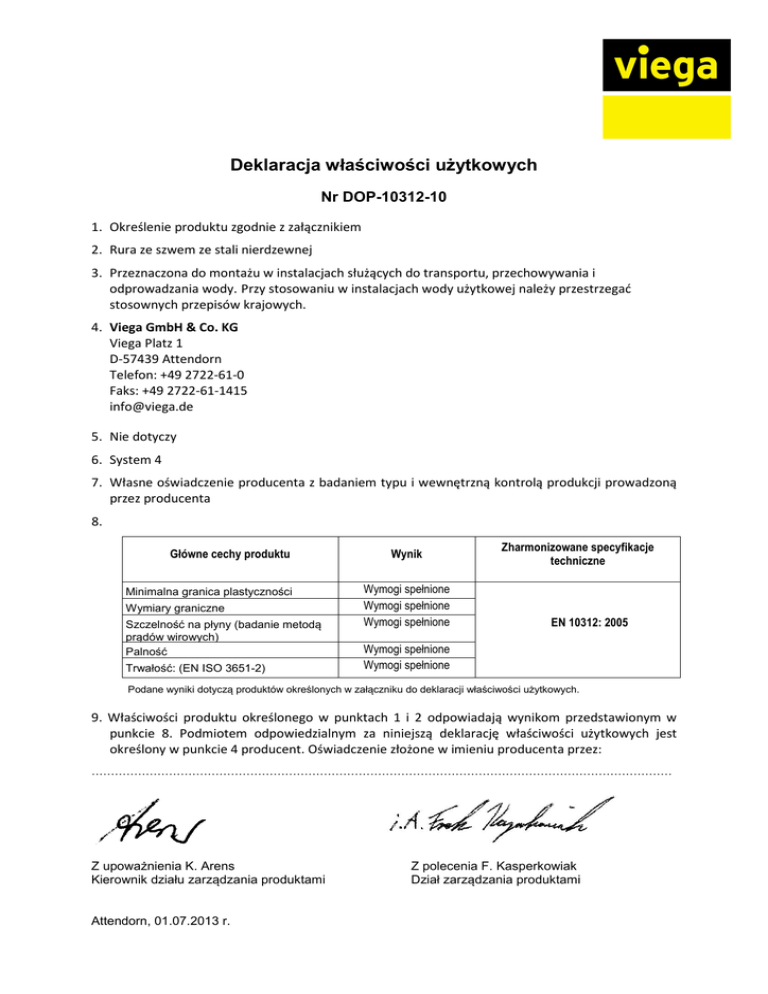 Deklaracja właściwości użytkowych Nr DOP-10312-10 1. Określenie produktu zgodnie z załącznikiem 2. Rura ze szwem ze stali nierdzewnej 3. Przeznaczona do montażu w instalacjach służących do transportu, przechowywania i odprowadzania wody. Przy stosowaniu w instalacjach wody użytkowej należy przestrzegać stosownych przepisów krajowych. 4. Viega GmbH & Co. KG Viega Platz 1 D-57439 Attendorn Telefon: +49 2722-61-0 Faks: +49 2722-61-1415 [email protected] 5. Nie dotyczy 6. System 4 7. Własne oświadczenie producenta z badaniem typu i wewnętrzną kontrolą produkcji prowadzoną przez producenta 8. Główne cechy produktu Minimalna granica plastyczności Wymiary graniczne Szczelność na płyny (badanie metodą prądów wirowych) Palność Trwałość: (EN ISO 3651-2) Wynik Wymogi spełnione Wymogi spełnione Wymogi spełnione Zharmonizowane specyfikacje techniczne EN 10312: 2005 Wymogi spełnione Wymogi spełnione Podane wyniki dotyczą produktów określonych w załączniku do deklaracji właściwości użytkowych. 9. Właściwości produktu określonego w punktach 1 i 2 odpowiadają wynikom przedstawionym w punkcie 8. Podmiotem odpowiedzialnym za niniejszą deklarację właściwości użytkowych jest określony w punkcie 4 producent. Oświadczenie złożone w imieniu producenta przez: 11111111111111111111111111111111111111111111111111 Z upoważnienia K. Arens Kierownik działu zarządzania produktami Attendorn, 01.07.2013 r. Z polecenia F. Kasperkowiak Dział zarządzania produktami Załącznik do deklaracji właściwości użytkowych Nr DOP-10312-10 Artykuł 615994 616007 616014 616021 616038 616045 616557 616564 616571 616588 616595 102036 289034 102708 104924 108588 113001 193676 578626 354862 354855 354848 Wzór - Opis 2205 Rura SANPRESS 1.4521 15x1,0 2205 Rura SANPRESS 1.4521 18x1,0 2205 Rura SANPRESS 1.4521 22x1,2 2205 Rura SANPRESS 1.4521 28x1,2 2205 Rura SANPRESS 1.4521 35x1,5 2205 Rura SANPRESS 1.4521 42x1,5 2205 Rura SANPRESS 1.4521 54x1,5 2205XL Rura SANPRESS 1.4521 64x2,0 2205XL Rura SANPRESS 1.4521 76,1x2,0 2205XL Rura SANPRESS 1.4521 88,9x2,0 2205XL Rura SANPRESS 1.4521 108x2,0 2203 Rura SANPRESS 1.4401 15x1,0 2203 Rura SANPRESS 1.4401 18x1,0 2203 Rura SANPRESS 1.4401 22x1,2 2203 Rura SANPRESS 1.4401 28x1,2 2203 Rura SANPRESS 1.4401 35x1,5 2203 Rura SANPRESS 1.4401 42x1,5 2203 Rura SANPRESS 1.4401 54x1,5 2203XL Rura SANPRESS 1.4401 64,0x2,0 2203XL Rura SANPRESS 1.4401 76,1x2,0 2203XL Rura SANPRESS 1.4401 88,9x2,0 2203XL Rura SANPRESS 1.4401 108,0x2,0 Kod oznaczenia CE/EN 10312 15x1, 1.4521, 230 MPa, A1, 1,5 mm/a CE/EN 10312 18x1, 1.4521, 230 MPa, A1, 1,5 mm/a CE/EN 10312 22x1,2, 1.4521, 230 MPa, A1, 1,5 mm/a CE/EN 10312 28x1,2, 1.4521, 230 MPa, A1, 1,5 mm/a CE/EN 10312 35x1,5, 1.4521, 230 MPa, A1, 1,5 mm/a CE/EN 10312 42x1,5, 1.4521, 230 MPa, A1, 1,5 mm/a CE/EN 10312 54x1,5, 1.4521, 230 MPa, A1, 1,5 mm/a CE/EN 10312 64,0x2,0, 1.4521, 230 MPa, A1, 1,5 mm/a CE/EN 10312 76,1x2,0, 1.4521, 230 MPa, A1, 1,5 mm/a CE/EN 10312 88,9x2,0, 1.4521, 230 MPa, A1, 1,5 mm/a CE/EN 10312 108,0x2,0, 1.4521, 230 MPa, A1, 1,5 mm/a CE/EN 10312 15x1, 1.4401, 230 MPa, A1, 1,5 mm/a CE/EN 10312 18x1, 1.4401, 230 MPa, A1, 1,5 mm/a CE/EN 10312 22x1,2, 1.4401, 230 MPa, A1, 1,5 mm/a CE/EN 10312 28x1,2, 1.4401, 230 MPa, A1, 1,5 mm/a CE/EN 10312 35x1,5, 1.4401, 230 MPa, A1, 1,5 mm/a CE/EN 10312 42x1,5, 1.4401, 230 MPa, A1, 1,5 mm/a CE/EN 10312 54x1,5, 1.4401, 230 MPa, A1, 1,5 mm/a CE/EN 10312 64,0x2,0, 1.4401, 230 MPa, A1, 1,5 mm/a CE/EN 10312 76,1x2,0, 1.4401, 230 MPa, A1, 1,5 mm/a CE/EN 10312 88,9x2,0, 1.4401, 230 MPa, A1, 1,5 mm/a CE/EN 10312 108,0x2,0, 1.4401, 230 MPa, A1, 1,5 mm/a 11111111111111111111111111111111111111111111111111 Z upoważnienia K. Arens Kierownik działu zarządzania produktami Attendorn, 01.07.2013 r. Z polecenia F. Kasperkowiak Dział zarządzania produktami