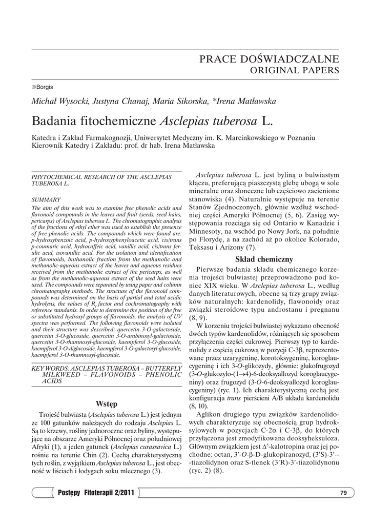 Prace doświadczalne original papers Borgis Michał Wysocki, Justyna Chanaj, Maria Sikorska, *Irena Matławska Badania fitochemiczne Asclepias tuberosa L. Katedra i Zakład Farmakognozji, Uniwersytet Medyczny im. K. Marcinkowskiego w Poznaniu Kierownik Katedry i Zakładu: prof. dr hab. Irena Matławska PHYTOCHEMICAL RESEARCH OF THE ASCLEPIAS TUBEROSA L. SUMMARY The aim of this work was to examine free phenolic acids and flavonoid compounds in the leaves and fruit (seeds, seed hairs, pericarps) of Asclepias tuberosa L. The chromatographic analysis of the fractions of ethyl ether was used to establish the presence of free phenolic acids. The compounds which were found are: p-hydroxybenzoic acid, p-hydroxyphenyloacetic acid, cis/trans p-coumaric acid, hydrocaffeic acid, vanillic acid, cis/trans ferulic acid, isovanillic acid. For the isolation and identification of flavonoids, buthanolic fraction from the methanolic and methanolic-aqueous extract of the leaves and aqueous residues received from the methanolic extract of the pericarps, as well as from the methanolic-aqueous extract of the seed hairs were used. The compounds were separated by using paper and column chromatography methods. The structure of the flavonoid compounds was determined on the basis of partial and total acidic hydrolysis, the values of Rf factor and cochromatography with reference standards. In order to determine the position of the free or substituted hydroxyl groups of flavonoids, the analysis of UV spectra was performed. The following flavonoids were isolated and their structure was described: quercetin 3-O-galactoside, quercetin 3-O-glucoside, quercetin 3-O-arabinosyl-galactoside, quercetin 3-O-rhamnosyl-glucoside, kaempferol 3-O-glucoside, kaempferol 3-O-diglucoside, kaempferol 3-O-galactosyl-glucoside, kaempferol 3-O-rhamnosyl-glucoside. KEY WORDS: ASCLEPIAS TUBEROSA – BUTTERFLY MILKWEED – FLAVONOIDS – PHENOLIC ACIDS Wstęp Trojeść bulwiasta (Asclepias tuberosa L.) jest jednym ze 100 gatunków należących do rodzaju Asclepias L. Są to krzewy, rośliny jednoroczne oraz byliny, występujące na obszarze Ameryki Północnej oraz południowej Afryki (1), a jeden gatunek (Asclepias curassavica L.) rośnie na terenie Chin (2). Cechą charakterystyczną tych roślin, z wyjątkiem Asclepias tuberosa L., jest obecność w liściach i łodygach soku mlecznego (3). Postępy Fitoterapii 2/2011 Asclepias tuberosa L. jest byliną o bulwiastym kłączu, preferującą piaszczystą glebę ubogą w sole mineralne oraz słoneczne lub częściowo zacienione stanowiska (4). Naturalnie występuje na terenie Stanów Zjednoczonych, głównie wzdłuż wschodniej części Ameryki Północnej (5, 6). Zasięg występowania rozciąga się od Ontario w Kanadzie i Minnesoty, na wschód po Nowy Jork, na południe po Florydę, a na zachód aż po okolice Kolorado, Teksasu i Arizony (7). Skład chemiczny Pierwsze badania składu chemicznego korzenia trojeści bulwiastej przeprowadzono pod koniec XIX wieku. W Asclepias tuberosa L., według danych literaturowych, obecne są trzy grupy związków naturalnych: kardenolidy, flawonoidy oraz związki steroidowe typu androstanu i pregnanu (8, 9). W korzeniu trojeści bulwiastej wykazano obecność dwóch typów kardenolidów, różniących się sposobem przyłączenia części cukrowej. Pierwszy typ to kardenolidy z częścią cukrową w pozycji C-3β, reprezentowane przez uzarygeninę, korotoksygeninę, koroglaucygeninę i ich 3-O-glikozydy, głównie: glukofrugozyd (3-O-glukozylo-(1→4)-6-deoksyallozyd koroglaucygeniny) oraz frugozyd (3-O-6-deoksyallozyd koroglaucygeniny) (ryc. 1). Ich charakterystyczną cechą jest konfiguracja trans pierścieni A/B układu kardenolidu (8, 10). Aglikon drugiego typu związków kardenolidowych charakteryzuje się obecnością grup hydroksylowych w pozycjach C-2α i C-3β, do których przyłączona jest zmodyfikowana deoksyheksuloza. Głównym związkiem jest Δ5-kalotropina oraz jej pochodne: octan, 3’-O-β-D-glukopiranozyd, (3’S)-3’--tiazolidynon oraz S-tlenek (3’R)-3’-tiazolidynonu (ryc. 2) (8). 79 Michał Wysocki i wsp. Ryc. 1. Struktura chemiczna wybranych kardenolidów występujących w trojeści bulwiastej. Ryc. 2. Struktura chemiczna wybranych kardenolidów w trojeści bulwiastej. W liściach trojeści bulwiastej występują związki flawonoidowe: 3-O-β-D-ksylopiranozylo-(1→2)-β-D-galaktopiranozyd kwercetyny, odpowiedzialny prawdopodobnie za przywabianie motyli monarszych (Danaus plexippus) (11), stąd angielska nazwa rośliny butterfly milkweed. Związki steroidowe typu androstanu reprezentowane są przez askandrozyd (17-O-α-L-arabinopiranozylo80 -(1→6)-β-D-glukopiranozyd 17α-hydroksyandrosta4,6,15-trien-3-onu). Steroidy typu pregnanu, pochodne lineolonu, ikemageniny oraz pleurogeniny, występują w formie 3-O-glikozydów, w których od 3 do 7 cząsteczek cukrów (cymarozy, oleandrozy, digitoksozy, kanarozy, tewetozy i glukozy) połączonych jest wiązaniami β-(1→4) (9). Struktura chemiczna wybranych związków steroidowych wystę- Postępy Fitoterapii 2/2011 Badania fitochemiczne Asclepias tuberosa L. pujących w trojeści bulwiastej przedstawiona została na rycinie 3. Działanie i zastosowanie Wykazano również właściwości kurczące macicę i działanie estrogenne trojeści bulwiastej, stąd stosowanie wyciągów przeciwwskazane jest w ciąży oraz w okresie laktacji (14, 15). Aktywność biologiczna Zastosowanie Badania aktywności przeciwbakteryjnej i przeciwgrzybiczej wyciągów wodno-etanolowych z liści, kwiatów, łodyg i owoców Asclepias tuberosa L. przeprowadzono metodą krążkowo-dyfuzyjną wobec drobnoustrojów: Staphylococcus aureus, Escherichia coli, Pseudomonas aeruginosa oraz Candida albicans. Strefa zahamowania wzrostu Staphylococcus aureus przez wyciąg z kwiatów wynosiła 7 mm, podczas gdy próby kontrolnej (chloramfenikol) 27 mm (12). Właściwości antyoksydacyjne metanolowych ekstraktów z owoców A