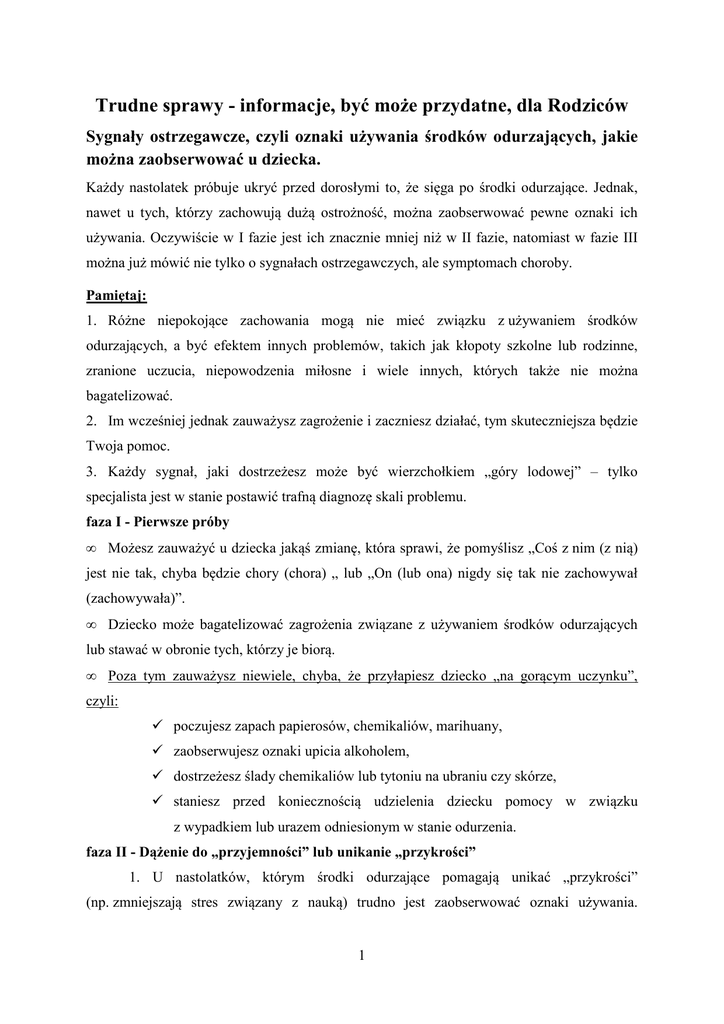 Trudne sprawy - informacje, być może przydatne, dla Rodziców Sygnały ostrzegawcze, czyli oznaki używania środków odurzających, jakie można zaobserwować u dziecka. Każdy nastolatek próbuje ukryć przed dorosłymi to, że sięga po środki odurzające. Jednak, nawet u tych, którzy zachowują dużą ostrożność, można zaobserwować pewne oznaki ich używania. Oczywiście w I fazie jest ich znacznie mniej niż w II fazie, natomiast w fazie III można już mówić nie tylko o sygnałach ostrzegawczych, ale symptomach choroby. Pamiętaj: 1. Różne niepokojące zachowania mogą nie mieć związku z używaniem środków odurzających, a być efektem innych problemów, takich jak kłopoty szkolne lub rodzinne, zranione uczucia, niepowodzenia miłosne i wiele innych, których także nie można bagatelizować. 2. Im wcześniej jednak zauważysz zagrożenie i zaczniesz działać, tym skuteczniejsza będzie Twoja pomoc. 3. Każdy sygnał, jaki dostrzeżesz może być wierzchołkiem „góry lodowej” – tylko specjalista jest w stanie postawić trafną diagnozę skali problemu. faza I - Pierwsze próby • Możesz zauważyć u dziecka jakąś zmianę, która sprawi, że pomyślisz „Coś z nim (z nią) jest nie tak, chyba będzie chory (chora) „ lub „On (lub ona) nigdy się tak nie zachowywał (zachowywała)”. • Dziecko może bagatelizować zagrożenia związane z używaniem środków odurzających lub stawać w obronie tych, którzy je biorą. • Poza tym zauważysz niewiele, chyba, że przyłapiesz dziecko „na gorącym uczynku”, czyli: poczujesz zapach papierosów, chemikaliów, marihuany, zaobserwujesz oznaki upicia alkoholem, dostrzeżesz ślady chemikaliów lub tytoniu na ubraniu czy skórze, staniesz przed koniecznością udzielenia dziecku pomocy w związku z wypadkiem lub urazem odniesionym w stanie odurzenia. faza II - Dążenie do „przyjemności” lub unikanie „przykrości” 1. U nastolatków, którym środki odurzające pomagają unikać „przykrości” (np. zmniejszają stres związany z nauką) trudno jest zaobserwować oznaki używania. 1 Ci młodzi ludzie przeważnie dość dobrze się uczą, nie buntują się, nie sprawiają kłopotów wychowawczych. 2. Natomiast u nastolatków, którzy biorą środki psychoaktywne ze względu na związane z tym „przyjemności” (powodzenie w towarzystwie, pożądany stan umysłu) sygnały ostrzegawcze mogą być bardziej nasilone. Do wyżej opisanych sygnałów charakterystycznych dla I fazy, mogą dołączyć kolejne, które łatwiej jest uchwycić i określić. Mogą to być: • utrata zainteresowań, aspiracji, inicjatywy. W szkole może się to przejawiać pogorszeniem ocen, nie odrabianiem lekcji, spóźnieniami, wagarowaniem, konfliktami z nauczycielami, a poza szkołą – rezygnacją z dotychczasowego hobby, niechęcią do zajęć pozalekcyjnych czy praktyk religijnych. • izolowanie się od reszty domowników (np. zamykanie się w pokoju), coraz częstsze nieobecności w domu, spóźnianie się, wychodzenie bez podania, po co, dokąd i z kim, unikanie rozmów z rodzicami, pokrętne tłumaczenia i kłamstwa, • zmiana przyjaciół – dotychczasowych kolegów zastępują nowi, często starsi, których dziecko nie przedstawia rodzicom, • bunt, który może przejawiać się nieposłuszeństwem, nieprzestrzeganiem ustalonych zasad, używaniem wulgaryzmów, napadami złości, gwałtownością, coraz częstszymi konfliktami z rodziną, zainteresowaniem sektami lub subkulturą młodzieżową. Ważnym sygnałem może też być obiecywanie poprawy i niedotrzymywanie przyrzeczeń. U wszystkich nastolatków w II fazie używania wyraźnymi wskazówkami istnienia problemu mogą być: • zmiany w zachowaniu takie jak rozregulowanie rytmu dnia i nocy, okresy wzmożonego ożywienia przeplatane zmęczeniem i ospałością (możliwe przysypianie na lekcjach), nadmierny apetyt lub brak apetytu, nowy styl ubierania się i fryzury, posługiwanie się slangiem, częste wietrzenie pokoju, używanie kadzidełek i odświeżaczy powietrza, • oznaki fizyczne np. zaczerwienione, łzawiące oczy, nienaturalnie rozszerzone lub zwężone źrenice, pogorszenie stanu skóry (krosty, zaczerwienienie), • narkotyki lub przybory do ich używania, które mogą się znajdować wśród rzeczy lub w pokoju dziecka. Mogą to być np. kawałki opalonej folii aluminiowej; pudełeczko zawierające kawałki rurki, szkiełka lub lusterka, małe foliowe torebeczki z jakimś proszkiem, tabletkami lub suszem. 2 faza III - Uzależnienie Oznaki używania narkotyków są widoczne i trudne do ukrycia. Poza wymienionymi wyżej występują: • nastrój przygnębienia wynikający ze świadomości uwikłania w branie narkotyków i bycia w pułapce: poczucie winy, bezradności, pokrzywdzenia, lęki, brak zaufania do ludzi (może mieć obsesyjny, paranoiczny charakter), możliwe myśli samobójcze. • łamanie prawa: wynoszenie rzeczy z domu, kradzieże, bójki, wandalizm itp. Możliwy jest też handel narkotykami w celu zdobycia pieniędzy na własną „działkę”, w związku, z czym dziecko może sprawiać wrażenie bardzo popularnego – zwykle być otoczonym przez nabywców lub przynosić do domu rzeczy, które inni chcą wymienić na narkotyki. • pogorszenie stanu zdrowia: częste przeziębienia, katar, kaszel, bóle (głowy, gardła, mięśni), krwawienie z nosa, spadek masy ciała, zawroty głowy, przypadki utraty przytomności, samookaleczenia, zaburzenia pamięci oraz toku myślenia. • zmiany wyglądu: brak zainteresowania własnym wyglądem i higieną, skóra zimna, potliwa, opuchnięta, swędząca, zażółcona lub zaczerwieniona, widoczne ślady po ukłuciach, oczy rozbiegane, zaczerwienione, podpuchnięte, „szklane”. W dalszym etapie rozwoju uzależnienia dominuje specyficzny „głód” narkotyku. Organizm jest wyniszczony, a depresja trudna do zwalczenia nawet po zażyciu środka odurzającego. Częste są przedawkowan