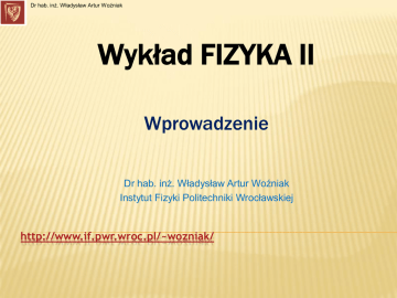 Dr hab. inż. Władysław Artur Woźniak Wykład FIZYKA II Wprowadzenie Dr hab. inż. Władysław Artur Woźniak Instytut Fizyki Politechniki Wrocławskiej http://www.if.pwr.wroc.pl/~wozniak/ Dr hab. inż. Władysław Artur Woźniak LITERATURA Literatura podstawowa: (Jednolity Kurs Fizyki) 1) Dawid HALLIDAY, Robert RESNICK, Jearl WALKER Podstawy fizyki T. 1-5, Wydawnictwo Naukowe PWN, Warszawa 2003 Literatura pomocnicza: 2. J. Walker, Podstawy fizyki. Zbiór zadań, PWN, Warszawa 2005. 3. J. Massalski, M. Massalska, Fizyka dla inżynierów, cz. I i cz. II, WNT, Warszawa 2008. 4. J. Orear, Fizyka, t. I i II, WNT, Warszawa 2008. 5. R. P. Feynman, R. B. Leighton, M. Sands, Feynmana wykłady z fizyki, T. 1, cz.1; T.1. cz.2; T. 2, cz. 1; T. 2, cz. 2, T. 3 — dotyczy mechaniki kwantowej; PWN, Warszawa 2005-7. 6. R. Eisberg, R. Resnick, Fizyka kwantowa atomów, cząsteczek, ciał stałych, jader i cząstek elementarnych, Wyd. PWN, Warszawa 1983. Dr hab. inż. Władysław Artur Woźniak PROGRAM WYKŁADU 1. Sprawy organizacyjne. Elektrostatyka ‒ kwantyzacja ład. elektrycznego, zasada zachowania ład. elektrycznego, pojęcie pola elektrostatycznego, linie pola, prawa: Gaussa (postać całkowa) i Coulomba, natężenie i potencjał pola elektrostatycznego ładunku punktowego, zasada superpozycji, zachowawczy charakter pola, potencjalna energia elektrostatyczna, potencjał elektrostatyczny, wyznaczanie natężenia pola wybranych rozkładów ciągłych wysoce symetrycznych z wykorzystaniem całkowego prawa Gaussa: pole jednorodnie naładowanej sfery/kuli i nieskończonej płaszczyzny; dipol elektryczny, dipol w polu elektrostatycznym (energia potencjalna, moment siły), przewodnik w zewnętrznym polu elektrycznym (ekranowanie); wybrane zastosowania elektrostatyki: zasada działania kserokopiarki, filtru elektro-statycznego); pojemność elektryczna: kondensator płaski, łączenie kondensatorów, energia i gęstość energii pola elektrostatycznego na przykładzie kondensatora płaskiego, dielektryk w polu elektrycznym, kondensator z dielektrykiem – 4h. Dr hab. inż. Władysław Artur Woźniak PROGRAM WYKŁADU 2. Prąd stały ‒ natężenie i wektor gęstość prądu elektrycznego, opór elektryczny i opór właściwy, przewodnictwo elektryczne metali, prawa Ohma i Kirchhoffa, praca i moc, obwody elektryczne – 2h. 3. Magnetostatyka ‒ pojęcie pola magnetostatycznego, pole magnetyczne: Ziemi, magnesów sztabkowych, elektromagnesów; wektory natężenie i indukcji, siła Lorentza, ruch ładunków elektrycznych w polu elektromagnetycznym (cyklotron, spektrometr mas, wyznaczanie e/m, selektory prędkości), klasyczny efekt Halla, przewodnik i ramka z prądem w polu magnetycznym, dipolowy moment magnetyczny, dipol magnetyczny w zewnętrznym polu magnetycznym (energia potencjalna, moment siły), źródła pola, prawa Biota-Savarta i Ampere’a, wyznaczanie pól magnetostatycznych wybranych źródeł (prostoliniowy i kołowy przewodnik z prądem, cewka), oddziaływanie dwóch równoległych przewodników z prądem, definicja jednostki natężenia prądu elektrycznego – 4h. Dr hab. inż. Władysław Artur Woźniak PROGRAM WYKŁADU 4. Indukcja elektromagnetyczna ‒ pojęcie strumienia pola magnetycznego, prawo Faradaya, reguła Lenza, prądy wirowe, indukcyjność cewki, samoindukcja, energia i gęstość energii pola magnetycznego, obwód RLC – 2h. 5. Równania Maxwella ‒ prąd przesunięcia, układ równań Maxwella (postać całkowa i różniczkowa) i równania materiałowe, materiały magnetyczne (paramagnetyki, diamagnetyki, ferromagnetyki) – 2h. 6. Fale elektromagnetyczne ‒ widmo i prędkość fal elektromagnetyczne, fale płaskie sinusoidalne, równanie fali, energia, pęd i ciśnienie fali elektromagnetycznej, wektor Poyntinga, polaryzacja światła, prawo Malusa, współczynnik załamania (związek z względnymi przenikalnościami ośrodków); prawa optyki geometrycznej (prawo załamania, odbicia, całkowite wewnętrzne odbicie, polaryzacja przy odbiciu, kąt Brewstera), dyspersja, metamateriały elektromagnetyczne (osłony niewidki), obrazowanie za pomocą zwierciadeł i cienkich soczewek – 2h. Dr hab. inż. Władysław Artur Woźniak PROGRAM WYKŁADU 7. Elementy optyki falowej ‒ interferencja i dyfrakcja światła, doświadczenie Younga, interferencja w cienkich warstwach, pierścienie Newtona, dyfrakcja na otworach kołowych, zdolność rozdzielcza układów optycznych, kryterium Rayleigha, aberracje, dyfrakcja promieni X na kryształach (tomografia komputerowa, fizjologiczne efekty działania promieniowania elektromagnetycznego) – 2h. 8. Szczególna teoria względności ‒ postulaty Einsteina, transformacje Lorentza; skrócenie długości, dylatacja czasu, paradoks bliźniąt, transformacja prędkości, elementy dynamiki relatywistycznej, równoważność masy i energii – 2h. Dr hab. inż. Władysław Artur Woźniak PROGRAM WYKŁADU 9. Elementy mechaniki kwantowej - prawa promieniowania ciała doskonale czarnego, foton - kwant światła i zjawisko fotoelektryczne, pęd fotonu i zjawisko Comptona, fale materii i dualizm korpuskularno-falowy, zasada nieoznaczoności Heisenberga, trój- i jednowymiarowe równania Schrödingera (czasowe i bezczasowe), funkcja falowa i jej interpretacja, tunelowanie kwantowe (skaningowy mikroskop tunelowy), elektron w nieskończenie głębokiej studni potencjalnej, kwantowanie energii, model Bohra atomu wodoru, doświadczenie Francka–Hertza, spin i spinowy moment magnetyczny elektronów, doświadczenie Sterna-Gerlacha, zakaz Pauliego, liczby kwantowe i budowa układ okresowego pierwiastków, oddziaływania światła z materią: emisja i absorpcja światła, fizyka działania lasera – 4h. 10. Elementy fizyki ciała stałego ‒ budowa i model pasmowy ciał stałych, półprzewodniki samoistne i domieszkowane, fizyka wybranych urządzeń półprzewodnikowych (złącze p-n, dioda, LED, MOSFET) – 2h. Dr hab. inż. Władysław Artur Woź