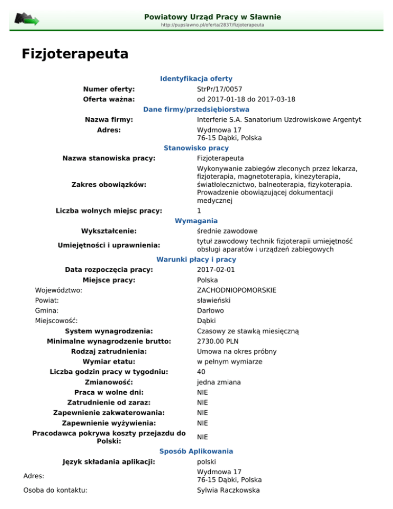 Fizjoterapeuta - Powiatowy Urząd Pracy w Sławnie