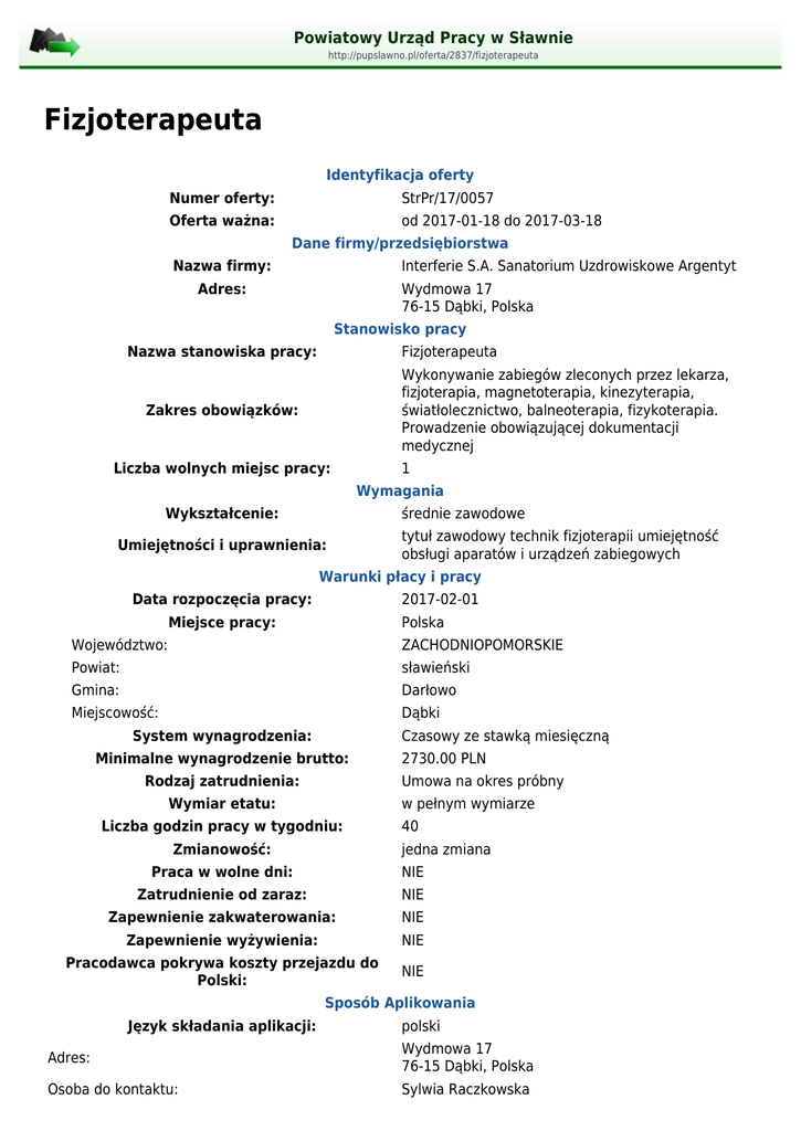Powiatowy Urząd Pracy w Sławnie http://pupslawno.pl/oferta/2837/fizjoterapeuta Fizjoterapeuta Identyfikacja oferty Numer oferty: StrPr/17/0057 Oferta ważna: od 2017-01-18 do 2017-03-18 Dane firmy/przedsiębiorstwa Nazwa firmy: Interferie S.A. Sanatorium Uzdrowiskowe Argentyt Adres: Wydmowa 17 76-15 Dąbki, Polska Stanowisko pracy Nazwa stanowiska pracy: Fizjoterapeuta Wykonywanie zabiegów zleconych przez lekarza, fizjoterapia, magnetoterapia, kinezyterapia, światłolecznictwo, balneoterapia, fizykoterapia. Prowadzenie obowiązującej dokumentacji medycznej Zakres obowiązków: Liczba wolnych miejsc pracy: 1 Wymagania Wykształcenie: średnie zawodowe Umiejętności i uprawnienia: tytuł zawodowy technik fizjoterapii umiejętność obsługi aparatów i urządzeń zabiegowych Warunki płacy i pracy Data rozpoczęcia pracy: 2017-02-01 Miejsce pracy: Polska Województwo: ZACHODNIOPOMORSKIE Powiat: sławieński Gmina: Darłowo Miejscowość: Dąbki System wynagrodzenia: Czasowy ze stawką miesięczną Minimalne wynagrodzenie brutto: Rodzaj zatrudnienia: 2730.00 PLN Umowa na okres próbny Wymiar etatu: w pełnym wymiarze Liczba godzin pracy w tygodniu: Zmianowość: 40 jedna zmiana Praca w wolne dni: NIE Zatrudnienie od zaraz: NIE Zapewnienie zakwaterowania: NIE Zapewnienie wyżywienia: NIE Pracodawca pokrywa koszty przejazdu do Polski: NIE Sposób Aplikowania Język składania aplikacji: polski Adres: Wydmowa 17 76-15 Dąbki, Polska Osoba do kontaktu: Sylwia Raczkowska Telefon: 94 314 81 31 Adres e-mail: pokaż adres Czy oferta jest subsydiowana: NIE Czy oferta jest finansowana z PFRON: NIE Upowszechnienie krajowej oferty pracy na terenie państw EOG: NIE
