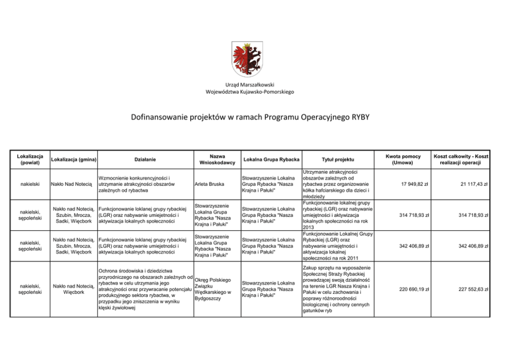 Urząd Marszałkowski Województwa Kujawsko-Pomorskiego Dofinansowanie projektów w ramach Programu Operacyjnego RYBY Lokalizacja (powiat) nakielski Lokalizacja (gmina) Nakło Nad Notecią Działanie Wzmocnienie konkurencyjności i utrzymanie atrakcyjności obszarów zależnych od rybactwa Nazwa Wnioskodawcy Lokalna Grupa Rybacka Arleta Bruska Stowarzyszenie Lokalna Grupa Rybacka "Nasza Krajna i Pałuki" nakielski, sępoleński Nakło nad Notecią, Funkcjonowanie loklanej grupy rybackiej Szubin, Mrocza, (LGR) oraz nabywanie umiejetności i Sadki, Więcbork aktywizacja lokalnych społeczności Stowarzyszenie Lokalna Grupa Rybacka "Nasza Krajna i Pałuki" Stowarzyszenie Lokalna Grupa Rybacka "Nasza Krajna i Pałuki" nakielski, sępoleński Nakło nad Notecią, Funkcjonowanie loklanej grupy rybackiej Szubin, Mrocza, (LGR) oraz nabywanie umiejetności i Sadki, Więcbork aktywizacja lokalnych społeczności Stowarzyszenie Lokalna Grupa Rybacka "Nasza Krajna i Pałuki" Stowarzyszenie Lokalna Grupa Rybacka "Nasza Krajna i Pałuki" nakielski, sępoleński Ochrona środowiska i dziedzictwa przyrodniczego na obszarach zależnych od rybactwa w celu utrzymania jego Nakło nad Notecią, atrakcyjności oraz przywracanie potencjału Więcbork produkcyjnego sektora rybactwa, w przypadku jego zniszczenia w wyniku klęski żywiołowej Okręg Polskiego Związku Wędkarskiego w Bydgoszczy Stowarzyszenie Lokalna Grupa Rybacka "Nasza Krajna i Pałuki" Tytuł projektu Kwota pomocy (Umowa) Koszt całkowity - Koszt realizacji operacji Utrzymanie atrakcyjności obszarów zależnych od rybactwa przez organizowanie kółka hafciarskiego dla dzieci i młodzieży Funkcjonowanie lokalnej grupy rybackiej (LGR) oraz nabywanie umiejętności i aktywizacja lokalnych społeczności na rok 2013 Funkcjonowanie Lokalnej Grupy Rybackiej (LGR) oraz nabywanie umiejętności i aktywizacja lokalnej społeczności na rok 2011 17 949,82 zł 21 117,43 zł 314 718,93 zł 314 718,93 zł 342 406,89 zł 342 406,89 zł Zakup sprzętu na wyposażenie Społecznej Straży Rybackiej prowadzącej swoją działalność na terenie LGR Nasza Krajna i Pałuki w celu zachowania i poprawy różnoroodności biologicznej i ochrony cennych gatunków ryb 220 690,19 zł 227 552,63 zł nakielski, sępoleński Nakło nad Notecią, Funkcjonowanie loklanej grupy rybackiej Szubin, Mrocza, (LGR) oraz nabywanie umiejetności i Sadki, Więcbork aktywizacja lokalnych społeczności sępoleński Więcbork tucholski Śliwce tucholski tucholski tucholski tucholski tucholski Stowarzyszenie Lokalna Grupa Rybacka "Nasza Krajna i Pałuki" Stowarzyszenie Lokalna Grupa Rybacka "Nasza Krajna i Pałuki" Podnoszenie wartości produktów rybactwa, P.U.H. GAMA Stowarzyszenie Lokalna rozwoju usług na rzecz społeczności KRZYSZTOF Grupa Rybacka "Nasza zamieszkującej obszary zależne od ANDRUSZKIEWICZ Krajna i Pałuki" rybactwa Wzmocnienie konkurencyjności i utrzymanie atrakcyjności obszarów zależnych od rybactwa Teresa Helena Kotarska Wzmocnienie konkurencyjności i utrzymanie atrakcyjności obszarów zależnych od rybactwa Parafia rzymskokatolicka pod wezwaniem Narodzenia Najświętszej Maryi Panny Pruszcz Bagienica Gostycyn Lokalna Grupa Rybacka "Borowiacka Rybka" Funkcjonowanie lokalnej grupy rybackiej (LGR) oraz nabywanie umiejętności i aktywizacja lokalnych społeczności na rok 2012 Nowoczesna smażalnia i wędzarnia ryb szansą na stowarzyszenie nowych miejsc pracy w Ośrodku Wypoczynkowym Panorama w Więcborku Budowa małej infrastruktury turystycznej nad jeziorem Okonińskim 313 481,52 zł 313 481,52 zł 287 642,84 zł 680 936,23 zł 40 141,14 zł 58 086,60 zł 183 821,16 zł 216 260,19 zł Lokalna Grupa Rybacka "Borowiacka Rybka" Prace budowlanokonserwatorskie w kościele pod wezwaniem Narodzenia Najświętszej Maryi Panny Pruszcz Bagienica wpisanym do ewidencji zabytków Wzmocnienie konkurencyjności i utrzymanie atrakcyjności obszarów zależnych od rybactwa Parafia rzymskokatolicka pw. św. Stanisława Biskupa i Męczennika z siedzibą w Wielkim Mędromierzu Lokalna Grupa Rybacka "Borowiacka Rybka" Prace konserwatorskie i restauratorskie przy ołtarzu głównym z kościoła pod wezwaniem św. Stanisława Biskupa i Męczennika w Wielkim Mędromierzu 98 560,00 zł 115 956,93 zł Lubiewo Wzmocnienie konkurencyjności i utrzymanie atrakcyjności obszarów zależnych od rybactwa Parafia rzymskokatolicka pw. Przemienienia Pańskiego w Bysławiu Lokalna Grupa Rybacka "Borowiacka Rybka" Remont i konserwacja oragnów oraz witraży w kościele w Bysławiu 77 000,00 zł 90 613,24 zł Gostycyn Wzmocnienie konkurencyjności i utrzymanie atrakcyjności obszarów zależnych od rybactwa Parafia RzymskoKatolicka pod Lokalna Grupa Rybacka Wezwaniem "Borowiacka Rybka" Świętego Marcina w Gostycynie Remont elewacji kościoła parafialnego pod wezwaniem św. Marcina w Gostycynie wpisanego do rejestru zabytków 111 366,33 zł 131 019,22 zł Śliwice Wzmocnienie konkurencyjności i utrzymanie atrakcyjności obszarów zależnych od rybactwa Teresa Helena Kotarska Remont boiska rekreacyjnosportowego nad Jeziorem Okonińskim wraz drogą dojazdową i parkingiem 271 930,88 zł 393 500,00 zł Gostycyn Lokalna Grupa Rybacka "Borowiacka Rybka" tucholski tucholski tucholski tucholski tucholski tucholski Gostycyn Podnoszenie wartości produktów rybactwa, rozwoju usług na rzecz społeczności Paweł Patoleta zamieszkującej obszary zależne od rybactwa Lubiewo Podnoszenie wartości produktów rybactwa, rozwoju usług na rzecz społeczności Ewa Bernadeta zamieszkującej obszary zależne od Kufel Bar "EWA" rybactwa Lokalna Grupa Rybacka "Borowiacka Rybka" Cekcyn Podnoszenie wartości produktów rybactwa, rozwoju usług na rzecz społeczności Jolanta Metkowska zamieszkującej obszary zależne od rybactwa Lokalna Grupa Rybacka "Borowiacka Rybka" Lubiewo Gostycyn Lubiewo Restrukturyzacja i reorientacja działalności gospodarczej oraz dywersyfikacja zatrudnienia osób mających pracę zwi