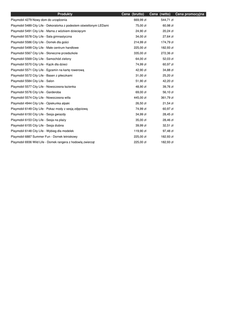 Produkty Playmobil 4279 Nowy dom do urządzenia Cena (brutto) Cena (netto) 669,99 zł 544,71 zł Playmobil 5489 City Life - Dekoratorka z podestem oświetlonym LEDami 75,00 zł 60,98 zł Playmobil 5491 City Life - Mama z wózkiem dziecięcym 24,90 zł 20,24 zł Playmobil 5578 City Life - Sala gimnastyczna 34,00 zł 27,64 zł Playmobil 5586 City Life - Domek dla gości 214,99 zł 174,79 zł Playmobil 5499 City Life - Małe centrum handlowe 225,00 zł 182,93 zł Playmobil 5567 City Life - Słoneczne przedszkole 335,00 zł 272,36 zł Playmobil 5569 City Life - Samochód zielony 64,00 zł 52,03 zł Playmobil 5570 City Life - Kącik dla dzieci 74,99 zł 60,97 zł Playmobil 5571 City Life - Egzamin na kartę rowerową 42,90 zł 34,88 zł Playmobil 5572 City Life - Basen z piłeczkami 31,00 zł 25,20 zł Playmobil 5584 City Life - Salon 51,90 zł 42,20 zł Playmobil 5577 City Life - Nowoczesna łazienka 48,90 zł 39,76 zł Playmobil 5576 City Life - Garderoba 69,00 zł 56,10 zł Playmobil 5574 City Life - Nowoczesna willa 445,00 zł 361,79 zł Playmobil 4944 City Life - Opiekunka alpaki 26,50 zł 21,54 zł Playmobil 6149 City Life - Pokaz mody z sesją zdjęciową 74,99 zł 60,97 zł Playmobil 6150 City Life - Sesja gwiazdy 34,99 zł 28,45 zł Playmobil 6153 City Life - Sesja na plaży 35,00 zł 28,46 zł Playmobil 6155 City Life - Sesja ślubna 39,99 zł 32,51 zł Playmobil 6148 City Life - Wybieg dla modelek 119,90 zł 97,48 zł Playmobil 6887 Summer Fun - Domek letniskowy 225,00 zł 182,93 zł Playmobil 6936 Wild Life - Domek rangera z hodowlą zwierząt 225,00 zł 182,93 zł Cena promocyjna