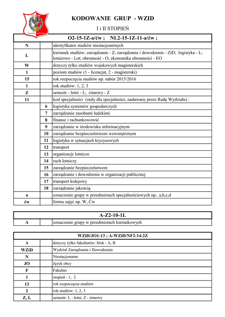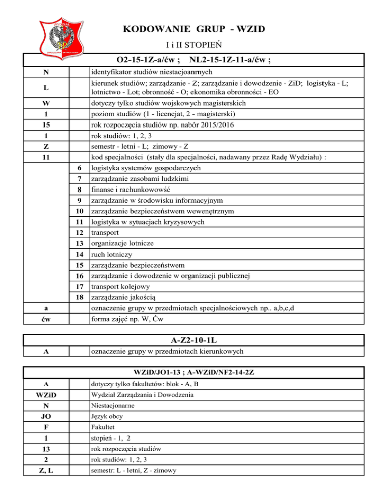 KODOWANIE GRUP - WZID I i II STOPIEŃ O2-15-1Z-a/ćw ; NL2-15-1Z-11-a/ćw ; N identyfikator studiów niestacjoanrnych L kierunek studiów; zarządzanie - Z; zarządzanie i dowodzenie - ZiD; logistyka - L; lotnictwo - Lot; obronność - O; ekonomika obronności - EO W dotyczy tylko studiów wojskowych magisterskich 1 poziom studiów (1 - licencjat, 2 - magisterski) 15 rok rozpoczęcia studiów np. nabór 2015/2016 1 rok studiów: 1, 2, 3 Z semestr - letni - L; zimowy - Z 11 kod specjalności (stały dla specjalności, nadawany przez Radę Wydziału) : a ćw 6 logistyka systemów gospodarczych 7 zarządzanie zasobami ludzkimi 8 finanse i rachunkowowść 9 zarządzanie w środowisku informacyjnym 10 zarządzanie bezpieczeństwem wewenętrznym 11 logistyka w sytuacjach kryzysowych 12 transport 13 organizacje lotnicze 14 ruch lotniczy 15 zarządzanie bezpieczeństwem 16 zarządzanie i dowodzenie w organizacji publicznej 17 transport kolejowy 18 zarządzanie jakością oznaczenie grupy w przedmiotach specjalnościowych np.. a,b,c,d forma zajęć np. W, Ćw A-Z2-10-1L A oznaczenie grupy w przedmiotach kierunkowych WZiD/JO1-13 ; A-WZiD/NF2-14-2Z A WZiD N JO dotyczy tylko fakultetów: blok - A, B Wydział Zarządzania i Dowodzenia Niestacjonarne Język obcy F Fakultet 1 stopień - 1, 2 13 rok rozpoczęcia studiów 2 rok studiów: 1, 2, 3 Z, L semestr: L - letni, Z - zimowy OFICEROWIE P/PSziDD-09-Z PSOS Podyplomowe Studia Operacyjno-Strategiczne PSDSz Podyplomowe Studia Dowódczo-Sztabowe WKTO Wyższy Kurs Taktyczno-Operacyjny STUDIA PODYPLOMOWE P/PSziDD-15-Z P/ PSziDD oznaczenie studiów podyplomowych skrót nazwy studiów np.. Procedury sztabowe i dokumenty dowodzenia BEP Bezpieczeńtwo ekonomiczne państwa LSG Logistyka systemów gospodarczych DwOW Dowodzenie w organizacjach wielonarodowych WWC Współpraca wojskowo-cywilno P-BPWiP ZBI DwOM ZL ZwOP ZwSzWoj ZZL KomMiędz PZT Polemologia-badania problemów wojny i pokoju Zarządzanie bezpieczeństwem informacyjnym Dowodzenie w organizacjach międzynarodowych Zarządzanie lotnictwem Zarządzanie w organizacjach publicznych Zarządzanie w sztabach wojskowych Zarządzanie zasobami ludzkimi Komunikacja międzykulturowa w dziedzinie bezpieczeństwa międzynarodowego Przeciwdziałanie zagrożeniom terrorystycznym 15 rok rozpoczęcia studiów 2015-2016 Z semestr: Z - zima, L- Lato