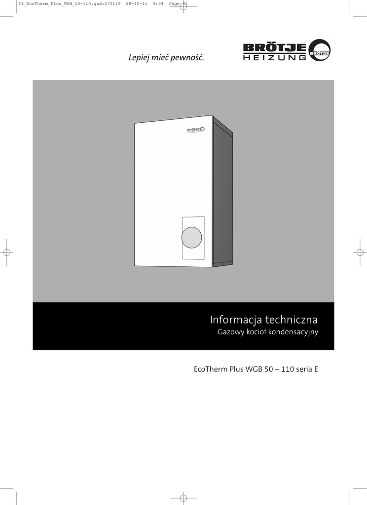 TI_EcoTherm_Plus_WGB_50-110.qxd:270119 28-10-11 9:34 Page 01 Informacja techniczna Gazowy kocioł kondensacyjny EcoTherm Plus WGB 50 – 110 seria E TI_EcoTherm_Plus_WGB_50-110.qxd:270119 28-10-11 9:34 Page 02 Spis treści 1. Ogólne informacje dotyczące techniki kondensacyjnej . . . . . . . . . . . . . . . . . . . . . . . . . . . . . . . . . . . . . . . . . . . . . . . . 3 2. Sposób i zakres dostawy . . . . . . . . . . . . . . . . . . . . . . . . . . . . . . . . . . . . . . . . . . . . . . . . . . . . . . . . . . . . . . . . . . . . . . . . . . 5 3. Informacje o urządzeniu i opis sposobu działania . . . . . . . . . . . . . . . . . . . . . . . . . . . . . . . . . . . . . . . . . . . . . . . . . . . . 6 4. Dane techniczne . . . . . . . . . . . . . . . . . . . . . . . . . . . . . . . . . . . . . . . . . . . . . . . . . . . . . . . . . . . . . . . . . . . . . . . . . . . . . . . . . . 15 5. Wymiary i przyłącza . . . . . . . . . . . . . . . . . . . . . . . . . . . . . . . . . . . . . . . . . . . . . . . . . . . . . . . . . . . . . . . . . . . . . . . . . . . . . . 17 6. Technika regulacji . . . . . . . . . . . . . . . . . . . . . . . . . . . . . . . . . . . . . . . . . . . . . . . . . . . . . . . . . . . . . . . . . . . . . . . . . . . . . . . . 19 7. Regulacja pracy kotła i obiegów grzewczych . . . . . . . . . . . . . . . . . . . . . . . . . . . . . . . . . . . . . . . . . . . . . . . . . . . . . . . . . 20 8. Podłączenie hydrauliczne . . . . . . . . . . . . . . . . . . . . . . . . . . . . . . . . . . . . . . . . . . . . . . . . . . . . . . . . . . . . . . . . . . . . . . . . . . 30 9. System odprowadzania spalin . . . . . . . . . . . . . . . . . . . . . . . . . . . . . . . . . . . . . . . . . . . . . . . . . . . . . . . . . . . . . . . . . . . . . . 36 10. Podgrzewacze wody użytkowej . . . . . . . . . . . . . . . . . . . . . . . . . . . . . . . . . . . . . . . . . . . . . . . . . . . . . . . . . . . . . . . . . . . . 45 11. Wskazówki projektowe . . . . . . . . . . . . . . . . . . . . . . . . . . . . . . . . . . . . . . . . . . . . . . . . . . . . . . . . . . . . . . . . . . . . . . . . . . . 51 12. Wymagania dotyczące wody grzewczej . . . . . . . . . . . . . . . . . . . . . . . . . . . . . . . . . . . . . . . . . . . . . . . . . . . . . . . . . . . . . 59 13. Przykłady zastosowania . . . . . . . . . . . . . . . . . . . . . . . . . . . . . . . . . . . . . . . . . . . . . . . . . . . . . . . . . . . . . . . . . . . . . . . . . . . 65 14. Schemat połączeń elektrycznych . . . . . . . . . . . . . . . . . . . . . . . . . . . . . . . . . . . . . . . . . . . . . . . . . . . . . . . . . . . . . . . . . . . 71 15. Deklaracja zgodności . . . . . . . . . . . . . . . . . . . . . . . . . . . . . . . . . . . . . . . . . . . . . . . . . . . . . . . . . . . . . . . . . . . . . . . . . . . . . 73 16. Wskazówki dotyczące oszczędzania energii / ochrony środowiska . . . . . . . . . . . . . . . . . . . . . . . . . . . . . . . . . . . . . . 74 Jakość urządzeń Urządzenia firmy BRÖTJE są kontrolowane zgodnie z surową normą zakładową i zgodnie z surowymi wymaganiami jakościowymi, znacznie wykraczającymi poza powszechnie obowiązujące normy. Już na etapie projektowania urządzeń stawia się na najwyższą jakość poszczególnych elementów składowych, którą się stale nadzoruje podczas ich powstawania i w procesie produkcyjnym, aż po kontrolę produktu finalnego. TI_EcoTherm_Plus_WGB_50-110.qxd:270119 28-10-11 9:34 Page 03 Ogólne informacje dotyczące techniki kondensacyjnej 1. Ogólne informacje dotyczące techniki kondensacyjnej W przypadku gazu ziemnego wartość ciepła spalania jest wyższa od wartości opałowej o ok. 11% i dzięki dużej zawartości pary wodnej w spalinach stwarza warunki do uzyskania dodatkowego ciepła. Wykorzystanie ciepła kondensacji Inną przesłanką do optymalnego wykorzystania ciepła spalania jest duża i utrzymująca się na stałym poziomie w całym zakresie obciążenia kotła stała zawartość CO2 w spalinach. Duża zawartość CO2 gwarantuje odpowiednio wysoki poziom punktu rosy i dzięki temu zwiększa zakres temperatury, w którym spaliny mogą ulegać kondensacji. Osiąganie tego stanu umożliwiają nowoczesne palniki modulujące ze wstępnym zmieszaniem. ilość energii w KWh/m2 Rys.1: Stosunek ciepła spalania H0 do wartości opałowej HU dla różnych rodzajów gazu ziemnego 100% ciepło utajone kondensacji 100% LL(GZ35) ciepło użyteczne bez kondensacji E(GZ350) Podstawowym warunkiem uzasadniającym stosowanie kotłów kondensacyjnych jest możliwie najniższa temperatura na powrocie do kotła. Im zimniejsza jest woda powracająca do kotła, tym wyższa jest efektywność odzyskiwania ciepła i tym większe są korzyści z zastosowania techniki kondensacyjnej. Rys. 2 pokazuje zależność pomiędzy temperaturą na powrocie, wykorzystaniem energii i ilością skroplin. Rys.2: Wersja 01.10 EcoTherm Plus WGB 50 – 110 Seria E 03 TI_EcoTherm_Plus_WGB_50-110.qxd:270119 28-10-11 9:34 Page 04 Ogólne informacje dotyczące techniki kondensacyjnej Temperatura na powrocie W praktyce ważne jest to, aby instalacja ogrzewania mogła pracować w sposób pozwalający uzyskiwać niską temperaturę wody na powrocie. Idealne warunki stwarzają systemy niskotemperaturowe, w których układ temperatur na zasilaniu/na powrocie wynosi 40/300C. W takich warunkach, w całym sezonie grzewczym podczas pracy kotła zachodzi proces kondensacji. Ale także przy układzie temperatur wody grzewczej 70/500C uzyskuje się 100% roczną efektywność grzewczą w wyniku występowania zjawiska kondensacji przez cały czas pracy instalacji, patrz rys. 3. Rys. 3: Nawet w przypadku zastosowania kotła kondensacyjnego w instalacji z układem temperatur 80/60°C osiąga się znacznie wyższą sprawność w stosunku do kotłów konwencjonalnych. Ze względu na niższe wartości temperatur systemowych w okresie przejściowym kocioł kondensacyjny może się jeszcze 