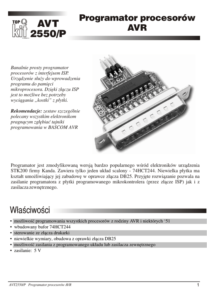 AVT 2550/P Programator procesorów AVR Banalnie prosty programator procesorów z interfejsem ISP. Urz¹dzenie s³u¿y do wprowadzenia programu do pamiêci mikroprocesora. Dziêki z³¹czu ISP jest to mo¿liwe bez potrzeby wyci¹gania „kostki” z p³ytki. Rekomendacje: zestaw szczególnie polecany wszystkim elektronikom pragn¹cym zg³êbiaæ tajniki programowania w BASCOM AVR Programator jest zmodyfikowan¹ wersj¹ bardzo popularnego wœród elektroników urz¹dzenia STK200 firmy Kanda. Zawiera tylko jeden uk³ad scalony - 74HCT244. Niewielka p³ytka ma kszta³t umo¿liwiaj¹cy jej zabudowê w oprawce z³¹cza DB25. Przyjête rozwi¹zanie pozwala na zasilanie programatora z p³ytki programowanego mikrokontrolera (przez z³¹cze ISP) jak i z zasilacza zewnêtrznego. W³aœciwoœci • • • • • • mo¿liwoœæ programowania wszystkich procesorów z rodziny AVR i niektórych ‘51 wbudowany bufor 74HCT244 sterowanie ze z³¹cza drukarki niewielkie wymiary, obudowa z oprawki z³¹cza DB25 mo¿liwoœæ zasilania z programowanego uk³adu lub zasilacza zewnêtrznego zasilanie: 5 V AVT2550/P Programator procesorów AVR 1 Opis uk³adu Schemat elektryczny uk³adu programatora AVR zosta³ pokazany na rysunku 1. Jak ³atwo zauwa¿yæ, poniewa¿ ca³a inteligencja programatora skupiona zosta³a w jego czêœci software’owej, uk³ad zosta³ maksymalnie uproszczony i zawiera jedynie jeden aktywny element: IC1 74HCT244. Za jego pomoc¹ mo¿emy zaprogramowaæ ka¿dy procesor AVR i niektóre procesory z rodziny ’51 (np. AT89S8252). Procesory mo¿na programowaæ zarówno w podstawkach wyposa¿onych w niezbêdny rezonator kwarcowy, jak i w systemie, za pomoc¹ specjalnego z³¹cza ISP. VCC C1 100nF C2 100uF IC1 74LS244 2 4 6 8 11 13 15 17 1 19 1A1 1A2 1A3 1A4 1Y1 1Y2 1Y3 1Y4 2A1 2A2 2A3 2A4 2Y1 2Y2 2Y3 2Y4 1G 2G 18 16 14 12 9 7 5 3 6 5 4 R1 100k CON2 ISP UCC MOSI GND 1 14 2 15 3 16 4 17 5 18 6 19 7 20 8 21 9 22 10 23 11 24 12 25 13 MISO SCK RES Do portu drukarkowego komputera CON1 Do z³¹cza mikrokontrolera 1 2 3 Rys. 1 Schemat elektryczny regulatora Monta¿ i uruchomienie Na rys.2 zosta³a pokazana mozaika œcie¿ek p³ytki obwodu drukowanego. P³ytka programatorka zosta³a tak zwymiarowana, ¿e po zmontowaniu i przylutowaniu do z³¹cza DB25M mieœci siê “lekko na wcisk” w typowej obudowie DB25. P³ytkê montujemy doœæ nietypowo, poniewa¿ ze wzglêdu na drastyczne ograniczenie jej wymiarów musimy montowaæ elementy po obydwóch jej stronach. Monta¿ rozpoczynamy od po³¹czenia p³ytki ze z³¹czem DB-25. Na d³u¿szej krawêdzi p³ytki programatora, po obydwóch jej stronach zosta³ umieszczony szereg punktów lutowniczych, rozmieszczonych identycznie do wyprowadzeñ z³¹cza DB-25. P³ytkê wsuwamy “na wcisk” pomiêdzy koñcówki lutownicze z³¹cza tak, aby wyprowadzenia konektora DB25 pokry³y siê dok³adnie z punktami lutowniczymi. Podczas dopasowywania p³ytki do z³¹cza w³aœciwie nie mo¿na siê pomyliæ, poniewa¿ na jednej stronie p³ytki mamy 12, a na drugiej 13 punktów lutowniczych. Po dok³adnym dopasowaniu obydwóch elementów do siebie lutujemy wyprowadzenia z³¹cza, u¿ywaj¹c lutownicy o cienkim grocie. Kolejn¹ czynnoœci¹ bêdzie wlutowanie w p³ytkê kondensatorów. Obydwa te elementy lutujemy od strony druku, oczywiœcie 2 AVT2550/P Programator procesorów AVR w przypadku p³ytki dwustronnej jest to strona umowna. Kondensatory montujemy na p³ask, równolegle do powierzchni p³ytki, a po przylutowaniu obcinamy jak najkrócej ich koñcówki. Uk³ad IC1 montujemy na stronie elementów p³ytki drukowanej. Odstêpstwem od regu³ jest rezygnacja ze stosowania podstawki, której u¿ycie uniemo¿liwi³oby umieszczenie p³ytki w maleñkiej obudowie. Monta¿ elektryczny koñczymy na przylutowaniu do p³ytki jedynego rezystora i z³¹cza CON2. Podwójny szereg k¹towych goldpinów lutujemy tak, aby jego wolne koñcówki znalaz³y siê jak najbli¿ej p³aszczyzny powierzchni p³ytki. Programator pozostaje tylko wyposa¿yæ w kabel ³¹cz¹cy go z programowanym procesorem. Kabel ten wykonujemy z odcinka dziesiêcio¿y³owego przewodu taœmowego o d³ugoœci ok. 50 cm, zaciskaj¹c na jego koñcach dwa wtyki 10 pinowe. Niestety, nie s¹ produkowane takie wtyki o szeœciu koñcówkach i w naszym kablu cztery przewody pozostan¹ niewykorzystane. Na zakoñczenie umieszczamy p³ytkê programatora wraz z do³¹czonym do niej kablem w przeznaczonej dla niej obudowie od wtyku DB-25 i skrêcamy ca³oœæ œrubkami. Rys. 2 Rozmieszczenie elementów na p³ytce drukowanej Wykaz elementów W kolejnoœci lutowania: 1 2 3 4 5 6 7 8 9 wtyk DB25M C1 100nF C2 100mF/16V R1 100kW (br¹z.-czar.-¿ó³ty-z³oty) IC1 74LS244 listwa k¹towa goldpin 3x2 szpilki obudowa wtyku DB25 odcinek ok. 50 cm dziesiêcio¿y³owego przewodu taœmowego 2 wtyki zaciskane na taœmê typu Z-FC10 (10-pin) AVT2550/P Programator procesorów AVR 3 Zestaw powsta³ na podstawie projektu o tym samym tytule opublikowanego w Elektronice dla Wszystkich 10/01 www.elportal.pl Oferta zestawów do samodzielnego monta¿u dostêpna jest na stronie internetowej www.sklep.avt.com.pl Producent: AVT-Korporacja sp. z o.o. tel.: (22) 257-84-50 ul. Leszczynowa 11 fax: (22) 257-84-55 03-197 Warszawa 4 Dzia³ pomocy technicznej: tel.:(22) 257-84-58 [email protected] AVT2550/P Programator procesorów AVR