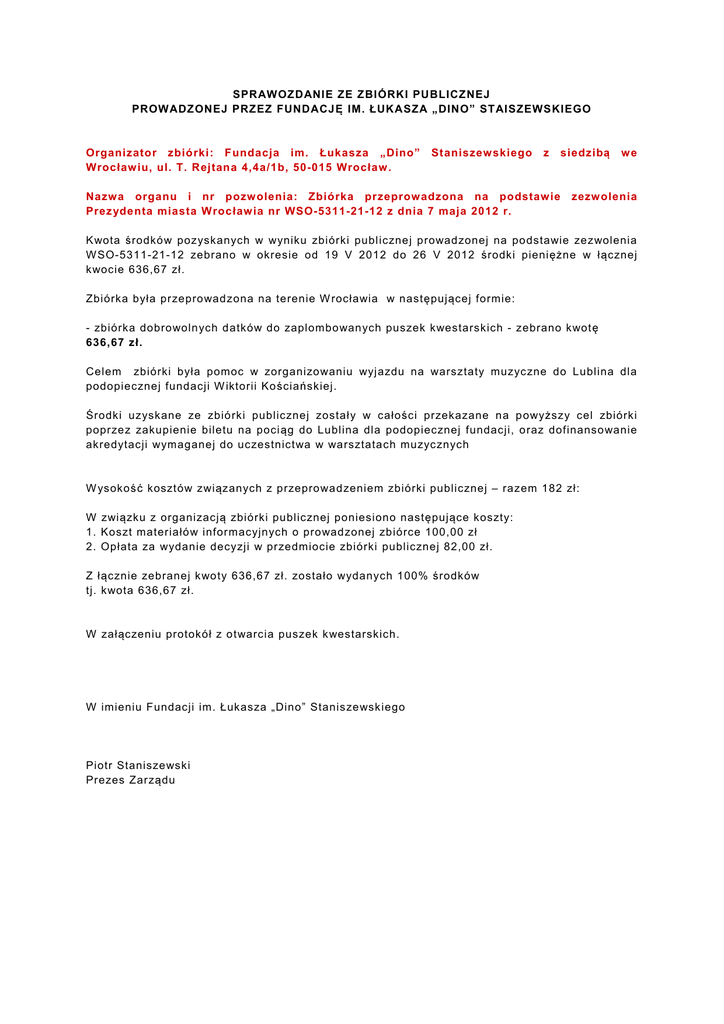 SPRAWOZDANIE ZE ZBIÓRKI PUBLICZNEJ PROWADZONEJ PRZEZ FUNDACJĘ IM. ŁUKASZA „DINO” STAISZEWSKIEGO Organizator zbiórki: Fundacja im. Łukasza „Dino” Wrocław iu, ul. T. Rejtana 4,4a/1b, 50-015 Wrocław . Staniszew skiego z siedzibą Nazw a organu i nr pozw olenia: Zbiórka przeprow adzona na podstaw ie Prez ydenta miasta Wrocław ia nr WSO-5311-21-12 z dnia 7 maja 2012 r. we zezw olenia Kwota środków pozyskanych w wyniku zbiórki publicznej prowadzonej na podstawie zezwolenia W SO-5311-21-12 zebrano w okresie od 19 V 2012 do 26 V 2012 środki pieniężne w łącznej kwocie 636,67 zł. Zbiórka była przeprowadzona na terenie W rocławia w następującej formie: - zbiórka dobrowolnych datków do zaplombowanych puszek kwestarskich - zebrano kwotę 636,67 zł. Celem zbiórki była pomoc w zorganizowaniu wyjazdu na warsztaty muzyc zne do Lublina dla podopiecznej fundacji W iktorii Kościańskiej. Środki uzyskane ze zbiórki publicznej zostały w całości przekazane na powyższy cel zbiórki poprzez zakupienie biletu na pociąg do Lublina dla podopiecznej fundacji, oraz dofinansowanie akredytacji wymaganej do uczestnictwa w warsztatach muzyc znych W ysokość kosztów związanych z przeprowadzeniem zbiórki publicznej – razem 182 zł: W związku z organizacją zbiórki publicznej poniesiono następujące koszty: 1. Koszt materiałów informacyjnych o prowadzonej zbiórce 100,00 zł 2. Opłata za wydanie decyzji w przedmiocie zbiórki publicznej 82,00 zł. Z łącznie zebranej k woty 636,67 zł. zostało wydanych 100% środków tj. kwota 636,67 zł. W załączeniu protokół z otwarcia puszek k westarskich. W imieniu Fundacji im. Łukasza „Dino” Stanis zewsk iego Piotr Staniszewski Prezes Zarządu