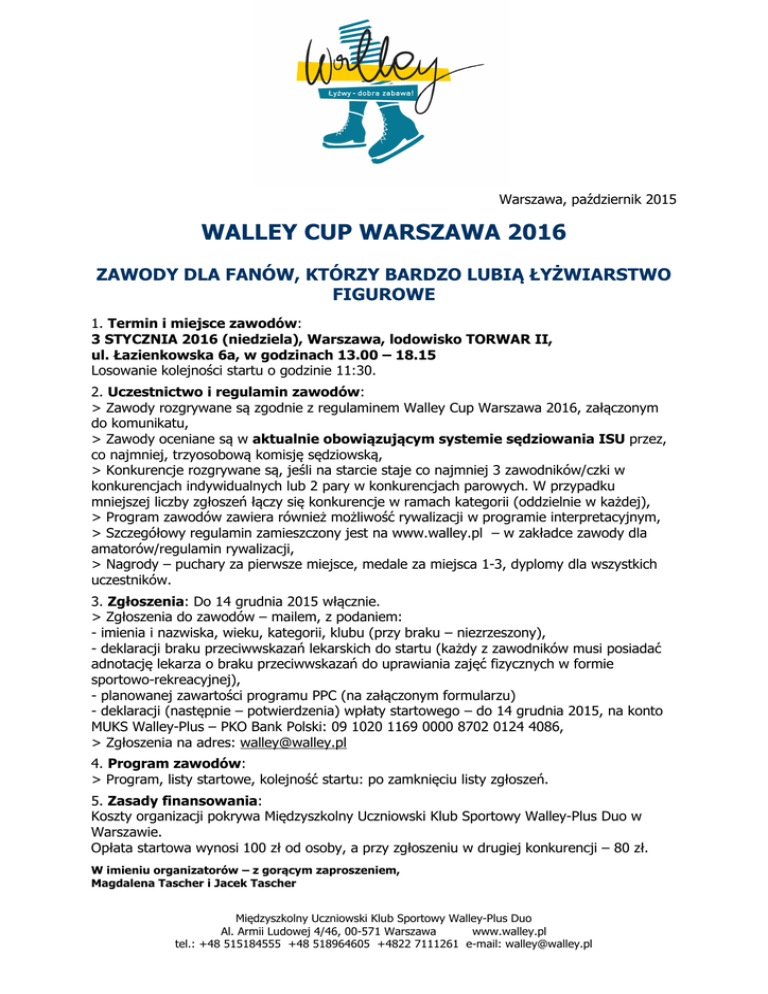 Warszawa, październik 2015 WALLEY CUP WARSZAWA 2016 ZAWODY DLA FANÓW, KTÓRZY BARDZO LUBIĄ ŁYŻWIARSTWO FIGUROWE 1. Termin i miejsce zawodów: 3 STYCZNIA 2016 (niedziela), Warszawa, lodowisko TORWAR II, ul. Łazienkowska 6a, w godzinach 13.00 – 18.15 Losowanie kolejności startu o godzinie 11:30. 2. Uczestnictwo i regulamin zawodów: > Zawody rozgrywane są zgodnie z regulaminem Walley Cup Warszawa 2016, załączonym do komunikatu, > Zawody oceniane są w aktualnie obowiązującym systemie sędziowania ISU przez, co najmniej, trzyosobową komisję sędziowską, > Konkurencje rozgrywane są, jeśli na starcie staje co najmniej 3 zawodników/czki w konkurencjach indywidualnych lub 2 pary w konkurencjach parowych. W przypadku mniejszej liczby zgłoszeń łączy się konkurencje w ramach kategorii (oddzielnie w każdej), > Program zawodów zawiera również możliwość rywalizacji w programie interpretacyjnym, > Szczegółowy regulamin zamieszczony jest na www.walley.pl – w zakładce zawody dla amatorów/regulamin rywalizacji, > Nagrody – puchary za pierwsze miejsce, medale za miejsca 1-3, dyplomy dla wszystkich uczestników. 3. Zgłoszenia: Do 14 grudnia 2015 włącznie. > Zgłoszenia do zawodów – mailem, z podaniem: - imienia i nazwiska, wieku, kategorii, klubu (przy braku – niezrzeszony), - deklaracji braku przeciwwskazań lekarskich do startu (każdy z zawodników musi posiadać adnotację lekarza o braku przeciwwskazań do uprawiania zajęć fizycznych w formie sportowo-rekreacyjnej), - planowanej zawartości programu PPC (na załączonym formularzu) - deklaracji (następnie – potwierdzenia) wpłaty startowego – do 14 grudnia 2015, na konto MUKS Walley-Plus – PKO Bank Polski: 09 1020 1169 0000 8702 0124 4086, > Zgłoszenia na adres: [email protected] 4. Program zawodów: > Program, listy startowe, kolejność startu: po zamknięciu listy zgłoszeń. 5. Zasady finansowania: Koszty organizacji pokrywa Międzyszkolny Uczniowski Klub Sportowy Walley-Plus Duo w Warszawie. Opłata startowa wynosi 100 zł od osoby, a przy zgłoszeniu w drugiej konkurencji – 80 zł. W imieniu organizatorów – z gorącym zaproszeniem, Magdalena Tascher i Jacek Tascher Międzyszkolny Uczniowski Klub Sportowy Walley-Plus Duo Al. Armii Ludowej 4/46, 00-571 Warszawa www.walley.pl tel.: +48 515184555 +48 518964605 +4822 7111261 e-mail: [email protected]