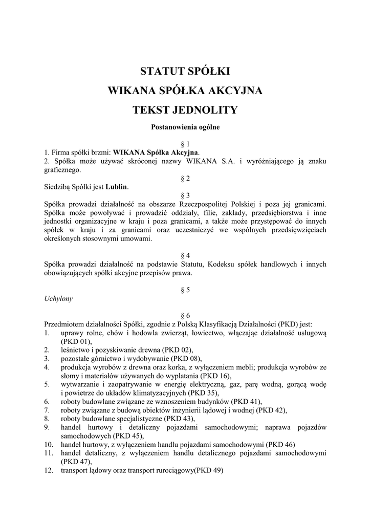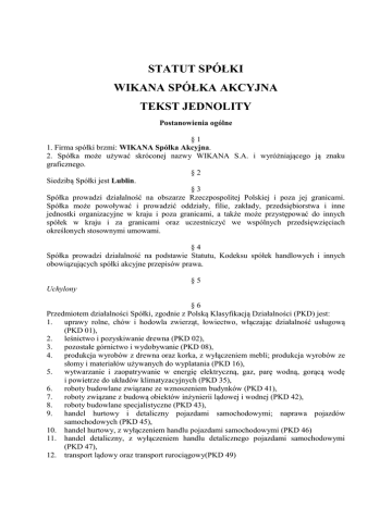 STATUT SPÓŁKI WIKANA SPÓŁKA AKCYJNA TEKST JEDNOLITY Postanowienia ogólne §1 1. Firma spółki brzmi: WIKANA Spółka Akcyjna. 2. Spółka może używać skróconej nazwy WIKANA S.A. i wyróżniającego ją znaku graficznego. §2 Siedzibą Spółki jest Lublin. §3 Spółka prowadzi działalność na obszarze Rzeczpospolitej Polskiej i poza jej granicami. Spółka może powoływać i prowadzić oddziały, filie, zakłady, przedsiębiorstwa i inne jednostki organizacyjne w kraju i poza granicami, a także może przystępować do innych spółek w kraju i za granicami oraz uczestniczyć we wspólnych przedsięwzięciach określonych stosownymi umowami. §4 Spółka prowadzi działalność na podstawie Statutu, Kodeksu spółek handlowych i innych obowiązujących spółki akcyjne przepisów prawa. §5 Uchylony §6 Przedmiotem działalności Spółki, zgodnie z Polską Klasyfikacją Działalności (PKD) jest: 1. uprawy rolne, chów i hodowla zwierząt, łowiectwo, włączając działalność usługową (PKD 01), 2. leśnictwo i pozyskiwanie drewna (PKD 02), 3. pozostałe górnictwo i wydobywanie (PKD 08), 4. produkcja wyrobów z drewna oraz korka, z wyłączeniem mebli; produkcja wyrobów ze słomy i materiałów używanych do wyplatania (PKD 16), 5. wytwarzanie i zaopatrywanie w energię elektryczną, gaz, parę wodną, gorącą wodę i powietrze do układów klimatyzacyjnych (PKD 35), 6. roboty budowlane związane ze wznoszeniem budynków (PKD 41), 7. roboty związane z budową obiektów inżynierii lądowej i wodnej (PKD 42), 8. roboty budowlane specjalistyczne (PKD 43), 9. handel hurtowy i detaliczny pojazdami samochodowymi; naprawa pojazdów samochodowych (PKD 45), 10. handel hurtowy, z wyłączeniem handlu pojazdami samochodowymi (PKD 46) 11. handel detaliczny, z wyłączeniem handlu detalicznego pojazdami samochodowymi (PKD 47), 12. transport lądowy oraz transport rurociągowy(PKD 49) 13. 14. 15. 16. 17. 18. 19. 20. 21. 22. 23. 24. 25. magazynowanie i działalność usługowa wspomagająca transport (PKD 52) zakwaterowanie (PKD 55) działalność usługowa związana z wyżywieniem (PKD 56) finansowa działalność usługowa, z wyłączeniem ubezpieczeń i funduszów emerytalnych (PKD 64) działalność wspomagająca usługi finansowe oraz ubezpieczenia i fundusze emerytalne (PKD 66) działalność związana z obsługą rynku nieruchomości (PKD 68) działalność prawnicza, rachunkowo-księgowa i doradztwo podatkowe (PKD 69) działalność firm centralnych (head offices); doradztwo związane z zarządzaniem (PKD 70); działalność w zakresie architektury i inżynierii; badania i analizy techniczne (PKD 71) reklama, badanie rynku i opinii publicznej (PKD 73), wynajem i dzierżawa (PKD 77), działalność usługowa związana z utrzymaniem porządku w budynkach i zagospodarowaniem terenów zieleni (PKD 81), działalność związana z administracyjną obsługą biura i pozostała działalność wspomagająca prowadzenie działalności gospodarczej (PKD 82). §7 Czas trwania Spółki jest nieograniczony. §8 Wymagane przepisami prawa ogłoszenia Spółki zamieszczane będą w Monitorze Sądowym i Gospodarczym, chyba, że odpowiednie przepisy stanowią inaczej. Akcje i akcjonariusze §9 Założycielami Spółki są pracownicy likwidowanych Zakładów Przemysłu Odzieżowego „ELPO” w Legnicy, wymienieni w Akcie Zawiązania Spółki Akcyjnej. § 10 1. Kapitał zakładowy Spółki wynosi 40.029.594,00 zł (słownie: czterdzieści milionów dwadzieścia dziewięć tysięcy pięćset dziewięćdziesiąt cztery złote i 00/100) i dzieli się na: - 16.766.559 (słownie: szesnaście milionów siedemset sześćdziesiąt sześć tysięcy pięćset pięćdziesiąt dziewięć) sztuk akcji serii G, na okaziciela, o wartości nominalnej po 2,00 zł (słownie: dwa złote) każda akcja, - oraz 3.248.238 (słownie: trzy miliony dwieście czterdzieści osiem tysięcy dwieście trzydzieści osiem) sztuk akcji serii H, na okaziciela, o wartości nominalnej po 2,00 zł (słownie: dwa złote) każda akcja. 2. Spółka może emitować papiery dłużne, w tym obligacje zamienne na akcje, a także obligacje z prawem pierwszeństwa do objęcia akcji Spółki. § 11 1. Akcje Spółki są akcjami zwykłymi na okaziciela. 2. Od chwili zarejestrowania akcji danej serii w depozycie papierów wartościowych, prowadzonym przez Krajowy Depozyt Papierów Wartościowych, wyłącza się prawo żądania akcjonariusza wymiany akcji na okaziciela na akcje imienne. 3. Wszelkie koszty związane z zamianą akcji ponosi akcjonariusz. § 12 1. Akcje mogą być umarzane za zgodą akcjonariusza w drodze ich nabycia przez Spółkę (umorzenie dobrowolne). 2. Umorzenie akcji wymaga uchwały Walnego Zgromadzenia. Uchwała powinna określać w szczególności podstawę prawną umorzenia, wysokość wynagrodzenia przysługującego akcjonariuszowi akcji umorzonych bądź uzasadnienie umorzenia akcji bez wynagrodzenia oraz sposób obniżenia kapitału zakładowego. 3. Uchwała o umorzeniu akcji podlega ogłoszeniu. 4. Umorzenie akcji wymaga obniżenia kapitału zakładowego. Uchwała o obniżeniu kapitału zakładowego powinna być powzięta na Walnym Zgromadzeniu, na którym powzięto uchwałę o umorzeniu akcji. 5. Uchwała o zmianie Statutu w sprawie umorzenia akcji powinna być umotywowana. 6. Spółka może tworzyć fundusze celowe z przeznaczeniem na zakup akcji w celu ich umorzenia. § 13 Uchylony Kapitały i fundusze § 14 Kapitał zakładowy Spółki może być podwyższony w drodze emisji nowych akcji na podstawie uchwały Walnego Zgromadzenia Akcjonariuszy. § 15 1. Kapitał zakładowy Spółki może być obniżony na podstawie uchwały Walnego Zgromadzenia Akcjonariuszy. 2. Obniżenie kapitału zakładowego Spółki może nastąpić poprzez zmniejszenie wartości nominalnej akcji lub przez umorzenie części akcji. 3. Obniżenie kapitału zakładowego w drodze umorzenia akcji następuje według ich wartości nominalnej.