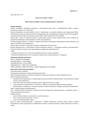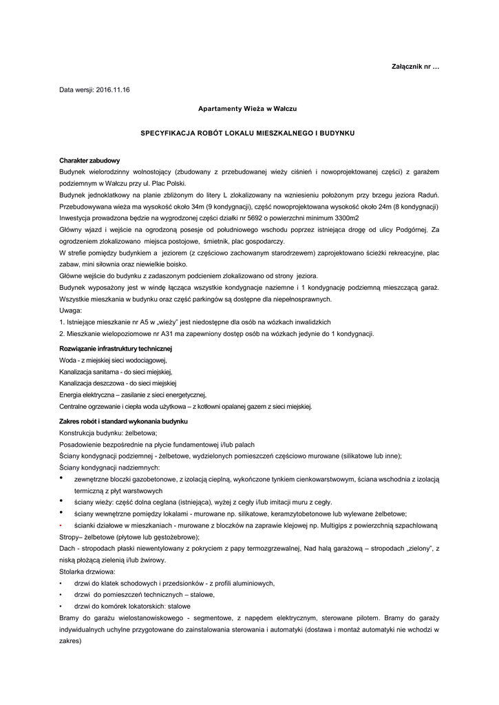 Załącznik nr … Data wersji: 2016.11.16 Apartamenty Wieża w Wałczu SPECYFIKACJA ROBÓT LOKALU MIESZKALNEGO I BUDYNKU Charakter zabudowy Budynek wielorodzinny wolnostojący (zbudowany z przebudowanej wieży ciśnień i nowoprojektowanej części) z garażem podziemnym w Wałczu przy ul. Plac Polski. Budynek jednoklatkowy na planie zbliżonym do litery L zlokalizowany na wzniesieniu położonym przy brzegu jeziora Raduń. Przebudowywana wieża ma wysokość około 34m (9 kondygnacji), część nowoprojektowana wysokość około 24m (8 kondygnacji) Inwestycja prowadzona będzie na wygrodzonej części działki nr 5692 o powierzchni minimum 3300m2 Główny wjazd i wejście na ogrodzoną posesje od południowego wschodu poprzez istniejąca drogę od ulicy Podgórnej. Za ogrodzeniem zlokalizowano miejsca postojowe, śmietnik, plac gospodarczy. W strefie pomiędzy budynkiem a jeziorem (z częściowo zachowanym starodrzewem) zaprojektowano ścieżki rekreacyjne, plac zabaw, mini siłownia oraz niewielkie boisko. Główne wejście do budynku z zadaszonym podcieniem zlokalizowano od strony jeziora. Budynek wyposażony jest w windę łącząca wszystkie kondygnacje naziemne i 1 kondygnację podziemną mieszczącą garaż. Wszystkie mieszkania w budynku oraz część parkingów są dostępne dla niepełnosprawnych. Uwaga: 1. Istniejące mieszkanie nr A5 w „wieży” jest niedostępne dla osób na wózkach inwalidzkich 2. Mieszkanie wielopoziomowe nr A31 ma zapewniony dostęp osób na wózkach jedynie do 1 kondygnacji. Rozwiązanie infrastruktury technicznej Woda - z miejskiej sieci wodociągowej, Kanalizacja sanitarna - do sieci miejskiej, Kanalizacja deszczowa - do sieci miejskiej Energia elektryczna – zasilanie z sieci energetycznej, Centralne ogrzewanie i ciepła woda użytkowa – z kotłowni opalanej gazem z sieci miejskiej. Zakres robót i standard wykonania budynku Konstrukcja budynku: żelbetowa; Posadowienie bezpośrednie na płycie fundamentowej i/lub palach Ściany kondygnacji podziemnej - żelbetowe, wydzielonych pomieszczeń częściowo murowane (silikatowe lub inne); Ściany kondygnacji nadziemnych: • zewnętrzne bloczki gazobetonowe, z izolacją cieplną, wykończone tynkiem cienkowarstwowym, ściana wschodnia z izolacją termiczną z płyt warstwowych • • • ściany wieży: część dolna ceglana (istniejąca), wyżej z cegły i/lub imitacji muru z cegły. ściany wewnętrzne pomiędzy lokalami - murowane np. silikatowe, keramzytobetonowe lub wylewane żelbetowe; ścianki działowe w mieszkaniach - murowane z bloczków na zaprawie klejowej np. Multigips z powierzchnią szpachlowaną Stropy– żelbetowe (płytowe lub gęstożebrowe); Dach - stropodach płaski niewentylowany z pokryciem z papy termozgrzewalnej, Nad halą garażową – stropodach „zielony”, z niską płożącą zielenią i/lub żwirowy. Stolarka drzwiowa: • drzwi do klatek schodowych i przedsionków - z profili aluminiowych, • drzwi do pomieszczeń technicznych – stalowe, • drzwi do komórek lokatorskich: stalowe Bramy do garażu wielostanowiskowego - segmentowe, z napędem elektrycznym, sterowane pilotem. Bramy do garaży indywidualnych uchylne przygotowane do zainstalowania sterowania i automatyki (dostawa i montaż automatyki nie wchodzi w zakres) Stolarka okienna: • klatki schodowe, garaże – okna PCV; • kotłowni – stalowe lub aluminiowe Wykończenie posadzek: • posadzka hali garażowej – betonowa lub płyta fundamentowa powierzchniowo wykończona. • posadzka pomieszczeniach technicznych – betonowa lub płyta fundamentowa powierzchniowo wykończona i/lub z płytek gresowych, • posadzka komórek lokatorskich/schowków/boksów - betonowa i/lub płyta fundamentowa powierzchniowo wykończona • posadzki korytarzy oraz klatek schodowych - z odpornych na ścieranie płytek gresowych i/lub wykładzin ; Wykończenie ścian: • ściany korytarzy, klatek schodowych, pomieszczeń technicznych: kondygnacje podziemne – tynk cementowo-wapienny III kat lub surowy beton; kondygnacje nadziemne: tynk gipsowy lub cementowo-wapienny z gipsowanie i malowaniem. • ściany komórek lokatorskich w poziomie garażu – murowane pełne i/lub ażurowe i/lub żelbetowe bez wykończenia, • ściany garaży wielostanowiskowych i indywidulanych: żelbetowe lub murowane – bez wykończenia Balustrady schodowe - stalowe, malowane, Winda oddylatowana – w klatce budynku; Instalacje elektryczne z osprzętem elektrycznym i z oprawami oświetleniowymi w częściach wspólnych. Wentylacja garaży grawitacyjna lub mechaniczna Garaże nieogrzewane Hol wejściowy z możliwością wydzielenia części na portiernie i/lub pomieszczenie ochrony. Przygotowane do zainstalowania obsługi monitoringu. Zakres robót i standard wykończenia lokali mieszkalnych Wykończenie ścian i sufitów: • tynki lub gładzie gipsowe lub cementowo-wapienne, nie malowane, ościeża drzwi nie tynkowane; Miejscowo surowy lub architektoniczny beton. • lokalnie zabudowy z płyt gipsowo – kartonowych; lub beton architektoniczny, ściany wieży ceglane nietynkowane • wysokość pomieszczeń minimum 2,58 m • lokalnie zabudowa instalacji wentylacji, instalacji sanitarnych z płyt gipsowo – kartonowych, w niektórych mieszkaniach mogą wystąpić lokalne obniżenia wysokości pomieszczenia lokalizacja wg. projektu, • w łazienkach i WC ściany nie tynkowane (przygotowane do położenia izolacji i płytek) • wymagane wykonanie przez Kupującego izolacji podpłytowej; Wykończenie posadzek: • w mieszkaniach – posadzka cementowa zatarta maszynowo; • w pomieszczeniach sanitarnych (łazienkach i wc) - posadzka cementowa zatarta maszynowo, wymagane wykonanie przez Kupującego izolacji podpłytkowej; • na balkonach/loggiach – płytka gresowa; Stolarka drzwiowa: • drzwi wejściowe do mieszkań - o podwyższonej odporność na włamanie klasa 2, zamki klasa C, z wizjerem, klamką, w okleinie imitującej drewno, kl