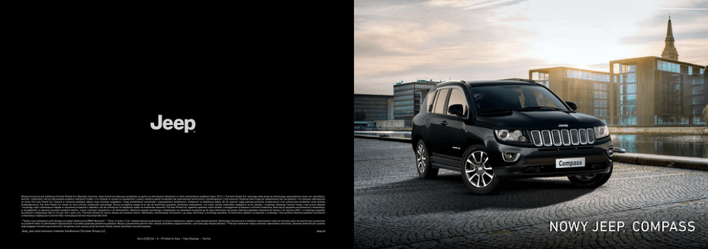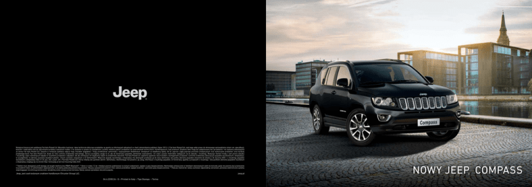 Niniejsza broszura jest publikacją Fiat Auto Poland S.A. Wszystkie ilustracje i dane techniczne dotyczące produktów są oparte na informacjach aktualnych w chwili zatwierdzenia publikacji (lipiec 2013 r.). Fiat Auto Poland S.A. zastrzega sobie prawo do okresowego wprowadzania zmian cen, specyfikacji, kolorów i materiałów oraz do zaprzestania produkcji wybranych modeli, o ile zostanie to uznane za uzasadnione z punktu widzenia jakości produktów lub uwarunkowań technicznych, marketingowych i/lub prawnych. Działania takie mogą być podejmowane bez uprzedzenia i nie stanowią zobowiązania ze strony Fiat Auto Poland S.A. Zawarte w niniejszej publikacji zdjęcia mają charakter poglądowy i mogą przedstawiać samochody z wyposażeniem dodatkowym, dostępnym za dodatkową opłatą. Od lat, poprzez ciągłą poprawę procesów produkcyjnych oraz wytwarzanie produktów coraz bardziej proekologicznych, Fiat Auto Poland S.A. działa na rzecz ochrony środowiska naturalnego. Zwraca szczególną uwagę na to, aby do konstrukcji pojazdów, elementów wyposażenia i ich części używać materiałów nadających się do odzysku i recyklingu. Wykazuje również troskę o sam proces odzysku i recyklingu części stanowiących odpady w rozumieniu przepisów o odpadach, tak aby zmniejszyć ich negatywny wpływ na środowisko naturalne. Fiat Auto Poland S.A. zapewnia zgodność swych działań z wymaganiami przepisów o ochronie środowiska, dotyczących pojazdów wycofywanych z eksploatacji, w szczególności w zakresie usuwania wszelkich płynów i innych czynności związanych z ich demontażem. Właściciel pojazdu wycofanego z eksploatacji ma obowiązek przekazać go do stacji demontażu lub punktu zbierania pojazdów stosownie do Ustawy z 25 stycznia 2005 r. o recyklingu pojazdów wycofanych z eksploatacji (DzU nr 25, poz. 202, z poźn. zm.). Fiat Auto Poland S.A. tworzy własną sieć punktów zbiórki i demontażu, rekomendując korzystanie z jej usług. Informacje o recyklingu pojazdów, ich konstrukcji zgodnej z przepisami o recyklingu i lista punktów zbierania pojazdów wycofanych z eksploatacji znajdują się na stronie http://www.jeep.pl/service/recycling/index.html (1) Telefon musi obsługiwać profil dostępu do książki telefonicznej (PBAP) Bluetooth®. (2) Dzieci w wieku 12 lat i młodsze powinny podróżować na tylnych siedzeniach, zapięte w pasy bezpieczeństwa. Niemowlęta umieszczone w fotelikach skierowanych tyłem do kierunku jazdy nie powinny być przewożone na przednim fotelu w samochodach wyposażonych w przednią poduszkę powietrzną pasażera. Wszyscy pasażerowie powinni mieć zawsze prawidłowo zapięte biodrowe i piersiowe pasy bezpieczeństwa. (3) Podczas manewrów należy zachować odpowiednią ostrożność, ponieważ elektroniczne systemy wspomagające nie eliminują konieczności świadomej oceny sytuacji przez kierowcę. Należy zawsze sprawdzać otoczenie pojazdu. Jeep® jest zastrzeżonym znakiem handlowym Chrysler Group LLC. jeep.pl 04.4.2200.26 - S – Printed in Italy – Tipo Stampa – Torino NOWY JEEP COMPASS ® NOWY JEEP® COMPASS. ZASMAKUJ WOLNOŚCI. Wolność to stan ducha: to, jak żyjesz, definiuje, kim jesteś i dokąd zmierzasz. Jeep® Compass uwalnia się od wszystkich stereotypów, aby stać się SUV-em, który w doskonały sposób łączy unikalne możliwości marki Jeep® ze stylem i zaletami samochodu kompaktowego. Odkryj więc nowe horyzonty, zagłębiając się w każdy detal. NOWY JEEP® COMPASS. ZASMAKUJ PIĘKNA. Daj się ponieść fascynacji naturalnością i elegancją nowego Jeepa Compassa, które przejawiają się w wyrafinowanym, ale jednocześnie surowym stylu. Nowe linie nadwozia i unikalne detale, takie jak symbol kraty wlotu powietrza Jeep® na reflektorach, nowe dwufunkcyjne halogenowe reflektory projekcyjne z nowymi czarnymi oprawami czy chromowana krata wlotu powietrza z nowym lśniącym obramowaniem, odzwierciedlają oryginalny charakter marki Jeep®, dodając mu stylu. Efektem jest zachwycający wygląd, wzbogacony o efektowne detale, które podkreślają poważne i eleganckie oblicze Jeepa Compassa. Jednak Compass nie tylko wspaniale wygląda – nowa przednia szyba o podwyższonej izolacji akustycznej zapewnia doskonałe wyciszenie kabiny, a nowe tylne światła z przyciemnianymi wewnętrznymi oprawami wyglądają bardziej intrygująco. SZCZEGÓLNIE CENNY . Niezależnie od tego, czy w światłach dużego miasta, czy na dzikich bezdrożach – wewnętrzna siła, pewność siebie i solidny wygląd mówią jednoznacznie, że to samochód marki Jeep®. Znajdziesz w nim starannie dopracowane detale, które zawsze przyciągają pełne podziwu spojrzenia: nowe wykończenie siedmioszczelinowego grilla przedniego, lusterka boczne w kolorze nadwozia, nowe reflektory oraz nowe 18-calowe obręcze kół. NOWY JEEP® COMPASS. ZASMAKUJ ELEGANCJI. C zuj się komfortowo niezależnie od tego, czy wybierasz się w długą podróż przez dzikie bezdroża czy wieczorem do eleganckiego klubu. Odświeżone, stylowe wnętrze Compassa oferuje taki poziom komfortu i przestronności, jakiego oczekujesz od samochodu. Miękkie w dotyku powierzchnie, wysokiej jakości materiały, standardowa w wersji Limited tapicerka z perforowanej skóry oraz nowy panel wskaźników nadają wnętrzu doskonały wygląd, godny samochodu wyższej klasy. BLIŻEJ STYLOWEGO KOMFORTU. Nowe oprawy przełączników w przednich i tylnych drzwiach oraz elementy drzwi są wykończone w kolorze Satin Silver. Nowa oprawa dźwigni zmiany biegów jest pokryta miękką w dotyku powłoką z chromowanym wykończeniem, zaś nową deskę rozdzielczą zdobi emblemat z nazwą Compass. Wersja Limited oferuje najwyższy poziom komfortu nowych foteli, pokrytych skórzaną tapicerką w kolorze Saddle Brown. Z myślą o komforcie i wygodzie pasażerów większość funkcjonalnych elementów wyposażenia wnętrza jest podświetlana. Wszystko to zwraca uwagę na wyjątkową stylistykę 