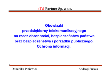 4Tel Partner Sp. z o.o. Obowiązki przedsiębiorcy telekomunikacyjnego na rzecz obronności, bezpieczeństwa państwa oraz bezpieczeństwa i porządku publicznego. Ochrona informacji. Dominika Piniewicz Andrzej Fudala Plan Prezentacji 1. Odpowiedzialność dyscyplinarna, finansowa, karna i cywilna za niedopełnienie obowiązków ustawowych. 2. Integralność sieci, usług i zbiorów. 3. Obowiązki na rzecz obronności, bezpieczeństwa państwa, bezpieczeństwa i porządku publicznego. 4. Bezpieczeństwo informacji podlegającej ustawowej ochronie. 1. Odpowiedzialność dyscyplinarna, finansowa, karna i cywilna za niedopełnienie obowiązków ustawowych. 1.1. Prezes UKE: Kara pieniężna: do 3% - przedsiębiorstwo, do 300% - kierownik przedsiębiorstwa. Zakaz prowadzenie działalności gospodarczej w zakresie telekomunikacji. Art. 201 Pt 1. Odpowiedzialność dyscyplinarna, finansowa, karna i cywilna za niedopełnienie obowiązków ustawowych. 1.2. Generalny Inspektor Ochrony Danych Osobowych – jako organ egzekucyjny może stosować środek egzekucyjny – grzywnę - w celu przymuszenia do wykonania jego decyzji administracyjnej. Wysokość takiej grzywny wynosi maksymalnie w stosunku do: osoby fizycznej - 10 000 zł, (50 000 zł )*, osoby prawnej – 50 000 zł, (200 000 zł)* * łączna wysokość grzywny w przypadku wielokrotnego nakładania grzywien w jednym postępowaniu egzekucyjnym. 1. Odpowiedzialność dyscyplinarna, finansowa, karna i cywilna za niedopełnienie obowiązków ustawowych. 1.3. Odpowiedzialność karna. KODEKS KARNY Przestępstwa popełnione przeciwko informacji zagrożone są karą grzywny, ograniczenia wolności albo pozbawienia wolności od 3 miesięcy do lat 5. USTAWA O OCHRONIE DANYCH OSOBOWYCH Przetwarzanie danych osobowych niezgodnie z przepisami prawa zagrożone jest kara grzywny, ograniczeniem lub pozbawieniem wolności do lat 2 (3). 1. Odpowiedzialność dyscyplinarna, finansowa, karna i cywilna za niedopełnienie obowiązków ustawowych. 1.4. Odpowiedzialność cywilna. Przedsiębiorca telekomunikacyjny może w postępowaniu cywilnym ponieść konsekwencje niewłaściwego przetwarzania danych telekomunikacyjnych i danych osobowych. 2. Integralność sieci i usług. W celu zapewnienia bezpieczeństwa i integralności sieci i usług telekomunikacyjnych przedsiębiorca telekomunikacyjny jest obowiązany: zachować należytą staranność przy zabezpieczaniu urządzeń telekomunikacyjnych, sieci telekomunikacyjnych oraz zbiorów danych przed ujawnieniem tajemnicy telekomunikacyjnej. podjąć środki techniczne i organizacyjne w celu zapewnienia bezpieczeństwa i integralności sieci, usług oraz przekazu komunikatów. informować użytkowników o wystąpieniu szczególnego ryzyka naruszenia bezpieczeństwa sieci, o istniejących możliwościach zapewnienia bezpieczeństwa i związanych z tym kosztach. niezwłocznie informować Prezesa UKE o naruszeniu bezpieczeństwa lub integralności sieci lub usług, wzór formularza w rozporządzeniu i na stronie UKE. 2. Integralność sieci i usług. Przedsiębiorca telekomunikacyjny podejmuje środki mające na celu zapewnienie bezpieczeństwa i integralności sieci, usług oraz przekazu komunikatów, w tym: 1) eliminuje przekaz komunikatu, który zagraża bezpieczeństwu sieci lub usług; 2) przerywa lub ogranicza świadczenia usługi telekomunikacyjnej na zakończeniu sieci, z którego następuje wysyłanie komunikatów zagrażających bezpieczeństwu sieci lub usług. O podjętych środkach niezwłocznie (nie później niż w ciągu 24 godzin) informuje Prezesa UKE. Prezes UKE może, w drodze decyzji, zakazać stosowania ww. środków. 2. Integralność sieci i usług. Informacje o: o działaniach, jakie dostawca usług jest uprawniony podejmować w związku z przypadkami naruszenia bezpieczeństwa lub integralności sieci i usług powinna zawierać umowa o świadczenie publicznie dostępnych usług telekomunikacyjnych telekomunikacyjnych.. W przypadku podjęcia środków „bezpieczeństwa” przedsiębiorca telekomunikacyjny nie odpowiada za niewykonanie lub nienależyte wykonanie usług telekomunikacyjnych w zakresie wynikającym z podjętych środków. 3. Obowiązki na rzecz obronności, bezpieczeństwa państwa, bezpieczeństwa i porządku publicznego: w tym: • sporządzaniu planów działań w sytuacjach szczególnych zagrożeń. • udostępnianie danych telekomunikacyjnych – art. 180d Pt, • gromadzeniu, przechowywaniu i udostępnianiu danych telekomunikacyjnych – „RETENCJA DANYCH”. • zapewnieniu warunków dostępu do treści korespondencji oraz danych telekomunikacyjnych i ich utrwalania – kontrola operacyjna, kontrola procesowa. 3.1 Plan działań …. Obowiązkowi sporządzenia planu nie podlega przedsiębiorca, który wykonuje działalność telekomunikacyjną: 1) polegającą wyłącznie na dostarczaniu udogodnień towarzyszących; 2) wyłącznie na obszarze nieprzekraczającym granic administracyjnych jednej gminy, z wyłączeniem gmin będących miastami na prawach powiatu, 3) polegającą wyłącznie na dostarczaniu sieci lub łączy telekomunikacyjnych dzierżawionych od innego przedsiębiorcy; 4) polegającą wyłącznie na sprzedaży we własnym imieniu i na własny rachunek usługi telekomunikacyjnej świadczonej przez innego dostawcę usług; 5) polegającą wyłącznie na rozprowadzaniu lub rozpowszechnianiu programów radiofonicznych lub telewizyjnych; 6) polegającą wyłącznie na świadczeniu usług dostępu do sieci Internet za pośrednictwem sieci telekomunikacyjnej obsługującej do 500 zakończeń sieci posiadających własny adres IP; 7) wyłącznie za pośrednictwem sieci telekomunikacyjnej innego przedsiębiorcy telekomunikacyjnego. 3.2. Udostępnianie danych telekomunikacyjnych – art. 180d Pt Przedsiębiorcy telekomunikacyjni są obowiązani do zapewnienia warunków dostępu i utrwalania oraz do udostępniania uprawnionym podmiotom, a także Służbie Celnej, sądo