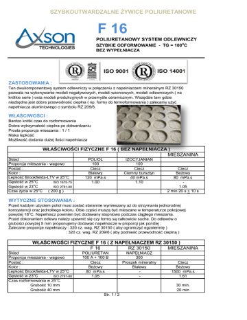 SZYBKOUTWARDZALNE ŻYWICE POLIURETANOWE F 16 POLIURETANOWY SYSTEM ODLEWNICZY o SZYBKIE ODFORMOWANIE - TG = 100 C BEZ WYPEŁNIACZA ZASTOSOWANIA : Ten dwukomponentowy system odlewniczy w połączeniu z napelniaczem mineralnym RZ 30150 pozwala na wykonywanie modeli negatywowych, modeli wzorcowych, modeli odlewniczych ( na krótkie serie ) oraz modeli produkcyjnych w przemyśle ceramicznym. Wszędzie tam gdzie niezbędna jest dobra przewodność cieplna ( np. formy do termoformowania ) zalecamy użyć napełniacza aluminiowego o symbolu RZ 209/6. WŁAŚCIWOŚCI : Bardzo krótki czas do rozformowania Dobra wytrzymałość cieplna po dotwardzaniu Prosta proporcja mieszania : 1 / 1 Niska lepkość Możliwość dodania dużej ilości napełniacza WŁAŚCIWOŚCI FIZYCZNE F 16 ( BEZ NAPEŁNIACZA ) MIESZANINA Skład Proporcja mieszania - wagowo Postać : Kolor : Lepkość Brookfielda-LTV w 25oC Gęstość w 25oC ISO 1675-75 Gęstość w 23oC ISO 2781-88 Czas życia w 25oC ( 200 g ) POLIOL 100 Ciecz Białawy 120 mPa.s 1.00 IZOCYJANIAN 100 Ciecz Ciemny bursztyn 40 mPa.s 1.10 Ciecz Beżowy 80 mPa.s 1.05 2 min 20 s + 10 s WYTYCZNE STOSOWANIA : Przed każdym użyciem poliol musi zostać starannie wymieszany aż do otrzymania jednorodnej konsystencji oraz jednolitego koloru. Obie części muszą być mieszane w temperaturze pokojowej powyżej 18oC. Napełniacz powinien być dodawany stopniowo podczas ciągłego mieszania. Przed dokonaniem odlewu należy upewnić się czy formy są całkowicie suche. Do odlewów o grubości powyżej 5 mm proponujemy dodawać napełniacze w proporcji jak poniżej : Zalecane proporcje napełniaczy : 320 cz. wag. RZ 30150 ( aby ograniczyć egzotermię ) : 320 cz. wag. RZ 209/6 ( aby podnieść przewodność cieplną ) WŁAŚCIWOŚCI FIZYCZNE F 16 ( Z NAPEŁNIACZEM RZ 30150 ) F 16 RZ 30150 MIESZANINA Skład Proporcja mieszania - wagowo Postać : Kolor : Lepkość Brookfielda-LTV w 25oC Gęstość w 23oC ISO 2781-88 Czas rozformowania w 25oC Grubość 10 mm Grubość 40 mm POLIURETAN 100 A + 100 B Ciecz Beżowy 80 mPa.s 1.05 NAPEŁNIACZ 300 Proszek mineralny Białawy - Ciecz Beżowy 1500 mPa.s 1.61 30 min. 20 min Str. 1 / 2 SZYBKOUTWARDZALNE ŻYWICE POLIURETANOWE F 16 POLIURETANOWY SYSTEM ODLEWNICZY o SZYBKIE ODFORMOWANIE - TG = 100 C BEZ WYPEŁNIACZA WŁAŚCIWOŚCI MECHANICZNE I CIEPLNE W 23oC F 16 + RZ 30150 Twardość Moduł elastyczności w zginaniu Wytrzymałość na zginanie Wytrzymałość na ściskanie Udarność wg CHARPY ISO 868-85 ISO 178-93 ISO 178-93 ISO 604-97 ISO 179/D F 16 + RZ 30150 Temperatura zeszklenia T.M.A.-Mettler Skurcz liniowy ( 250x60x50 ) Współczynnik rozszerzalności T.M.A.-Mettler [ + 20, + 90 ]oC cieplnej (1) cz. wag. Shore D1 MPa MPa MPa kJ/m2 0 72 1000 37 33 13 300 82 3600 39 60 - cz. wag. o C % 0 100 - 300 100 0.37 - 84 mm/mmoC - średnie wartości otrzymane na standartowych próbkach utwardzonych przez 14 h. w 60 oC. BEZPIECZEŃSTWO I HIGIENA PRACY : Zwykłe środki bezpieczeństwa powinny być zachowane podczas pracy z tym produktem : - zapewnić dobrą wentylację - nosić rękawice, okulary i ochronne ubranie robocze Bardziej szczegółowe informacje zawarte są w kartach charakterystyki obu składników kompozycji. PRZECHOWYWANIE : Okres składowania wynosi 12 miesięcy w oryginalnych nie otwieranych pojemnikach w temperaturze pomiędzy 15 i 25oC. Po otwarciu pojemnik należy szczelnie zamknąć pod osłoną gazu obojętnego ( suche powietrze, azot itp. ). izocyjanian jest wrażliwy na działanie promieniowania UV dlatego musi być przechowywany w szczelnym opakowaniu ( chronić przed światłem ). OPAKOWANIA : POLIOL IZOCYJANIAN 6 x 0.90 kg, 1 x 5.00 kg, 1 x 20.00 kg, 1 x 50.00 kg 6 x 0.90 kg, 1 x 5.00 kg, 1 x 20.00 kg, 1 x 50.00 kg GWARANCJA : Wszystkie informacje zawarte powyżej są rezultatem badań i testów przeprowadzonych w naszym laboratorium w ściśle określonych warunkach. Użytkownik ponosi pełną odpowiedzialność za określenie przydatności ( w swoich warunkach ) produktu AXSON ( przed dokonaniem zakupu ) do proponowanego zastosowania. AXSON gwarantuje zgodność swojego produktu z jego specyfikacją lecz nie może zagwarantować jego kompatybilności z jakimkolwiek szczególnym zastosowaniem. AXSON odrzuca jakąkolwiek odpowiedzialność za zniszczenia lub wypadki, które spowodowane zostały użyciem jego produktów. Odpowiedzialność AXSON jest ściśle ograniczona do zwrotu pieniędzy lub wymiany produktu nie zgodnego z jego specyfikacją. AMOD - Andrzej Modrzewski Przedstawiciel w Polsce : 01-793 Warszawa ul. Rydygiera 8 tel. / fax. ( 0-22 ) 633-85-06 tel. ( 0-22 ) 669-39-76 tel. komórkowy ( 0-602 ) 26-11-15 INTERNET: www.amod.pl e-mail:[email protected] Strona 2 / 2