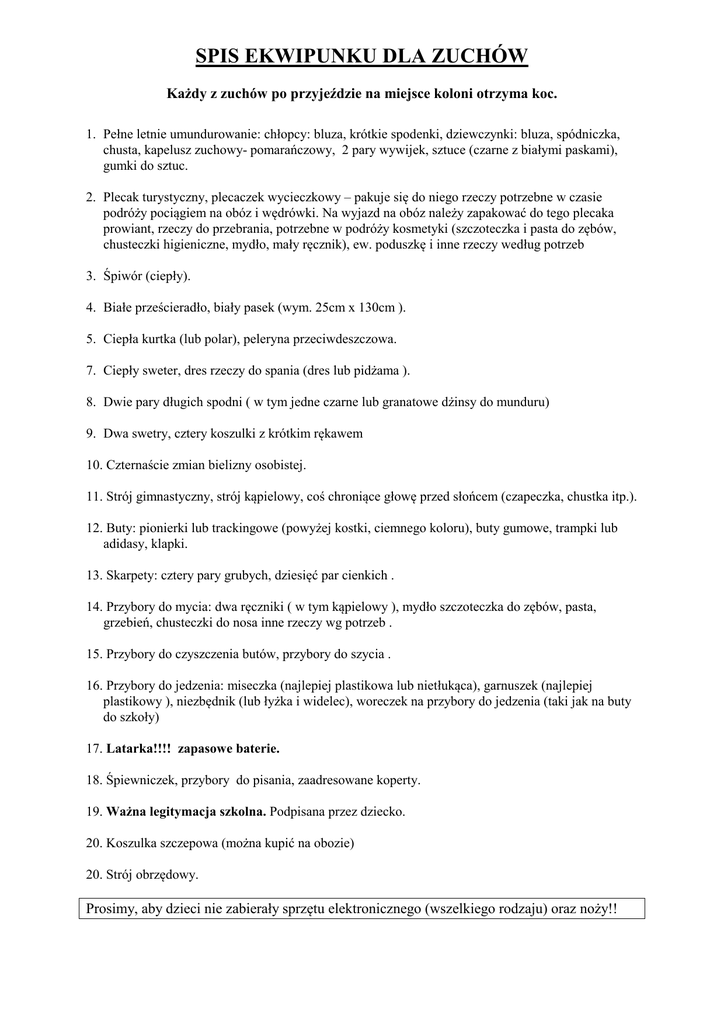 SPIS EKWIPUNKU DLA ZUCHÓW Każdy z zuchów po przyjeździe na miejsce koloni otrzyma koc. 1. Pełne letnie umundurowanie: chłopcy: bluza, krótkie spodenki, dziewczynki: bluza, spódniczka, chusta, kapelusz zuchowy- pomarańczowy, 2 pary wywijek, sztuce (czarne z białymi paskami), gumki do sztuc. 2. Plecak turystyczny, plecaczek wycieczkowy – pakuje się do niego rzeczy potrzebne w czasie podróży pociągiem na obóz i wędrówki. Na wyjazd na obóz należy zapakować do tego plecaka prowiant, rzeczy do przebrania, potrzebne w podróży kosmetyki (szczoteczka i pasta do zębów, chusteczki higieniczne, mydło, mały ręcznik), ew. poduszkę i inne rzeczy według potrzeb 3. Śpiwór (ciepły). 4. Białe prześcieradło, biały pasek (wym. 25cm x 130cm ). 5. Ciepła kurtka (lub polar), peleryna przeciwdeszczowa. 7. Ciepły sweter, dres rzeczy do spania (dres lub pidżama ). 8. Dwie pary długich spodni ( w tym jedne czarne lub granatowe dżinsy do munduru) 9. Dwa swetry, cztery koszulki z krótkim rękawem 10. Czternaście zmian bielizny osobistej. 11. Strój gimnastyczny, strój kąpielowy, coś chroniące głowę przed słońcem (czapeczka, chustka itp.). 12. Buty: pionierki lub trackingowe (powyżej kostki, ciemnego koloru), buty gumowe, trampki lub adidasy, klapki. 13. Skarpety: cztery pary grubych, dziesięć par cienkich . 14. Przybory do mycia: dwa ręczniki ( w tym kąpielowy ), mydło szczoteczka do zębów, pasta, grzebień, chusteczki do nosa inne rzeczy wg potrzeb . 15. Przybory do czyszczenia butów, przybory do szycia . 16. Przybory do jedzenia: miseczka (najlepiej plastikowa lub nietłukąca), garnuszek (najlepiej plastikowy ), niezbędnik (lub łyżka i widelec), woreczek na przybory do jedzenia (taki jak na buty do szkoły) 17. Latarka!!!! zapasowe baterie. 18. Śpiewniczek, przybory do pisania, zaadresowane koperty. 19. Ważna legitymacja szkolna. Podpisana przez dziecko. 20. Koszulka szczepowa (można kupić na obozie) 20. Strój obrzędowy. Prosimy, aby dzieci nie zabierały sprzętu elektronicznego (wszelkiego rodzaju) oraz noży!!