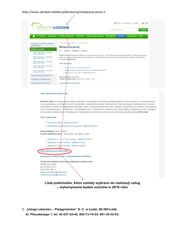 http://www.zdrowie.lodzkie.pl/konkursy/medycyna-pracy-1 Lista podmiotów, które zostały wybrane do realizacji usług – wykonywanie badań uczniów w 2016 roku 1. „Usługi Lekarsko – Pielęgniarskie” S. C. w Łodzi, 90-368 Łódź Al. Piłsudskiego 7, tel. 42 637-24-42, 602-73-74-54, 601-35-32-03, http://www.zdrowie.lodzkie.pl/konkursy/medycyna-pracy-1 2. „ADAMED” Spółka z o. o. w Łodzi, 93-530 Łódź ul. Paderewskiego11, tel. 42 640-37-38, Al. Politechniki 5, tel. 42 636-84-62, 3. Wojewódzki Ośrodek Medycyny Pracy Centrum Profilaktyczno-Lecznicze, 91-205 Łódź ul. Aleksandrowska 61/63, tel. 42 272-18-03 lub 04, ul. Gdańska 117a, tel. 42 636-53-55, ul. Tymienieckiego 18, tel. 42 279-72-79, ul. Piłsudskiego 133b, tel. 42 279-73-25, 4. Niepubliczny Zakład Opieki Zdrowotnej "PROFILAKTYKA I ZDROWIE", 91-002 Łódź ul. Zgierska 2/8, tel. 42 659-59-59, 616-20-20, 509-175-675, ul. Kopernika 67/69, tel. 42 633-02-22, ul. Gorkiego 21a, tel. 42 233-35-25, 733-300-075, 95-015 Głowno, ul. Kopernika 19, tel. 42 719-10-92, 710-71-26, 95-060 Brzeziny, ul. Piłsudskiego 67A, tel. 42 875-27-14, 5. Miejskie Centrum Medyczne "WIDZEW" w Łodzi, 92-332 Łódź Al. Piłsudskiego 157, tel. 42 674-33-99, 6. "Medycyna Grabieniec" Sp. z o.o. NZOZ Medycyna Grabieniec 91-058 Łódź, ul. Zachodnia 12a/12c, tel. 42 612-40-09 7. Centrum Medyczne Szpital Św. Rodziny Sp. z o.o. w Łodzi, 90-302 Łódź, ul. Wigury 19, tel. 42 254-96-00, 254-96-22, 254-96-39, 8. AKADEMIA ZDROWIA Sp. z o. o. Sp. K. w Łodzi, 90-205- Łódź, ul. Kilińskiego 21, tel. 42 630-27-59, 9. REMEDIUM Tułaczyńska, Matusiak Sp. j. w Łodzi, 93-177 Łódź, ul. Dąbrowskiego 12/21, tel. 42 230-91-28, 666-841-656, 10. Gabinet Lekarski - Grażyna Podlasek, 95-100 Zgierz, ul.1 Maja 28a, tel. 601-93-50-05, 11. Miejska Przychodnia Zdrowia w Ozorkowie, 95-035 Ozorków, ul. Wigury 1, tel. 42 710-31-50, 12. Samodzielny Publiczny Zakład Opieki Zdrowotnej "PABIAN - MED" w Pabianicach, 95-200 Pabianice, ul. Kilińskiego 10/12, tel. 42 212-19-50, http://www.zdrowie.lodzkie.pl/konkursy/medycyna-pracy-1 13. PL "Centrum Badań Profilaktycznych" - Andrzej Marcinkiewicz, 95-200 Pabianice, ul. Św. Jana 15, tel. 600-43-80-80, 14. Samodzielny Publiczny Zakład Opieki Zdrowotnej w Konstantynowie Łódzkim, 95-050 Konstantynów Łódzki ul. Sadowa 10, tel. 42 211-11-14, 15. Powiatowy Zespół Opieki Zdrowotnej w Piotrkowie Trybunalskim, 97-300 Piotrków Trybunalski ul. Dmowskiego 47, tel. 44 645-11-02, 16. Szpital Wojewódzki im. Prymasa Kardynała Stefana Wyszyńskiego w Sieradzu, 98-200 Sieradz ul. Armii Krajowej 7, tel. 43 827-82-25, 17. "ZDROWIE" Sp z o.o. Zespół Poradni "ZDROWIE" N ZOZ w Sieradzu, 98-200 Sieradz, Al. Pokoju 7, tel. 43 822-19-99, 18. "TRES - MED" Spółka z o. o. w Sieradzu, 98-200 Sieradz, ul. Krakowskie Przemieście 10, tel. 43 827-14-41, 826-31-89, 19. Zduńskowolski Szpital Powiatowy Sp. z o. o. w Zduńskiej Woli, 98-220 Zduńska Wola ul. Osmolińska 6, tel. 43 823-43-61, 20. PPHU "TOMKAR" S.C. Halina Styśko, Piotr Styśko PPL Zespół Poradni "ZDROWIE" w Poddębicach, 99-200 Poddębice, ul. Zielona 2 a, tel. 43 678-95-00, ul. Krasickiego 11a, tel. 43 678-88-00, 99-210 Uniejów, ul. Orzechowa 6, tel. 43 650-50-26, 21. Wojewódzki Szpital Zespolony w Skierniewicach, 96-100 Skierniewice, ul. Wita Stwosza 1, tel. 46 833-33-40, 22. Tomaszowskie Centrum Zdrowia Sp. z o. o. w Tomaszowie Mazowieckim, 97-200 Tomaszów Mazowiecki ul. Graniczna 63, tel. 44 725-72-19, 23. Szpital Powiatowy w Radomsku, 97-500 Radomsko, ul. Jagiellońska 36, tel. 44 685-47-68, 24. Niepubliczny Zakład Opieki Zdrowotnej ''MEDYK" w Radomsku, 97-500 Radomsko, ul. Batorego 3, tel. 44 685-02-70, 25. Niepubliczny Zakład Opieki Zdrowotnej „PROMED” w Radomsku, 97-500 Radomsko, ul. Miła 5, tel. 44 682-17-70, 682-17-71, 26. Samodzielny Publiczny Zakład Opieki Zdrowotnej PRO Familia w Radomsku, 97-500 Radomsko ul. Przedborskiej 39/41, tel. 44 683-15-50, ul. Armii Krajowej 34, tel. 44 683-15-51, http://www.zdrowie.lodzkie.pl/konkursy/medycyna-pracy-1 27. Niepubliczny Zakład Opieki Zdrowotnej VITA -MED s.c. w Opocznie, 26-300 Opoczno ul. Partyzantów 1A, tel. 44 755-01-37, 754-20-46, 28. Niepubliczny Zakład Opieki Zdrowotnej "VADEMECUM" w Wieluniu, 98-300 Wieluń Oś. Wyszyńskiego 41, tel. 43 843-54-44, 29. Samodzielny Publiczny Zakład Opieki Zdrowotnej w Rawie Mazowieckiej, 96-200 Rawa Mazowiecka, ul. Niepodległości 8, tel. 46 814-20-65, 30. Gabinet Lekarski Ryszard Kądziela w Rawie Mazowieckiej, 96-200 Rawa Mazowiecka ul. Jana III Sobieskiego 97, tel. 46 815-18-59, 600-153-955, 31. Niepubliczny Zakład Opieki Zdrowotnej "RAW - MEDICA" w Rawie Mazowieckiej, 96-200 Rawa Maz. ul. Słowackiego 68, tel. 46 814-40-12, 32. Niepubliczny Zakład Opieki Zdrowotnej "ISOX" w Kutnie, 99-300 Kutno, ul. Oporowska 4, tel. 24 254-83-00, 691-11-05-02, 33. Prywatny Gabinet Lekarski - Małgorzata Sembrat w Żychlinie, 99-320 Żychlin, ul. Marchlewskiego 1, tel. 24 285-10-90, 99-300 Kutno, ul. Zamkowa 6, tel. 24-254-39-76, 34. Zespół Opieki Zdrowotnej w Łowiczu, 99-400 Łowicz, ul. Ułańska 28, tel. 46 837-56-11 wew. 266, 35. Iberys Sp. z o.o. MediCentrum w Łowiczu, 99-400 Łowicz, ul. Maja 15, tel. 46 837-85-46, 36. Zakład Opieki Zdrowotnej w Łęczycy, 99-100 Łęczyca, ul. Zachodnia 6, tel. 24 388-26-01 wew. 219, 37. Twoja Klinika Sp. z o.o. w Brzezinach, 95-060 Brzeziny, ul. Sienkiewicza 87, tel. 46 874-10-87, 38. Centrum Medyczne "MEDINEA" Anna Włodarczyk w Kraszewie, 95-020 Andrespol, ul. Rokicińska 3, tel. 42 235-23-24.