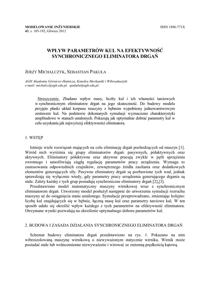 MODELOWANIE INŻYNIERSKIE 43, s. 185-192, Gliwice 2012 ISSN 1896-771X WPŁYW PARAMETRÓW KUL NA EFEKTYWNOŚĆ SYNCHRONICZNEGO ELIMINATORA DRGAŃ JERZY MICHALCZYK, SEBASTIAN PAKUŁA AGH Akademia Górniczo-Hutnicza, Katedra Mechaniki i Wibroakustyki e-mail: [email protected], [email protected]. Streszczenie. Zbadano wpływ masy, liczby kul i ich własności tarciowych w synchronicznym eliminatorze drgań na jego skuteczność. Do budowy modelu przyjęto płaski układ korpusu maszyny z bębnem wypełniony jednowarstwowym zestawem kul. Na podstawie dokonanych symulacji wyznaczono charakterystyki amplitudowe w stanach ustalonych. Pokazują jak optymalnie dobrać parametry kul w celu uzyskania jak najwyższej efektywności eliminatora. 1. WSTĘP Istnieje wiele rozwiązań mających na celu eliminację drgań pochodzących od maszyn [1]. Wśród nich wyróżnia się grupy eliminatorów drgań: pasywnych, półaktywnych oraz aktywnych. Eliminatory półaktywne oraz aktywne pracują zwykle w pętli sprzężenia zwrotnego i umożliwiają ciągłą regulację parametrów pracy urządzenia. Wymaga to zastosowania odpowiednich czujników, zewnętrznego źródła zasilania oraz dodatkowych elementów generujących siły. Pasywne eliminatory drgań są pozbawione tych wad, jednak sprawdzają się wyłącznie wtedy, gdy parametry pracy urządzenia generującego drgania są stałe. Zalety każdej z tych grup posiadają synchroniczne eliminatory drgań [2],[3]. Przedstawiono model matematyczny maszyny wirnikowej wraz z synchronicznym eliminatorem drgań. Utworzony model posłużył następnie do utworzenia symulacji rozruchu maszyny aż do osiągnięcia stanu ustalonego. Symulacje przeprowadzano, zmieniając kolejno: liczbę kul znajdujących się w bębnie, łączną masę kul oraz parametry tarciowe kul. W ten sposób udało się określić wpływ każdego z tych parametrów na efektywność eliminatora. Otrzymane wyniki pozwalają na określenie optymalnego doboru parametrów kul. 2. BUDOWA I ZASADA DZIAŁANIA SYNCHRONICZNEGO ELIMINATORA DRGAŃ Schemat budowy eliminatora drgań przedstawiono na rys. 1. Pokazano na nim wibroizolowaną maszynę wirnikową o niewyważonym statycznie wirniku. Wirnik może posiadać stałe lub wolnozmienne niewyważenie i wirować ze zmienną prędkością kątową. 186 J. MICHALCZYK, S. PAKUŁA y Bęben mb , J b e Środek masy niewyważonego wirnika Elementy sprężysto-tłumiące Korpus maszyny i ( xi , yi ) x H h O k y by k x bx 2 2 2 2 mk , J k Środek masy korpusu a a Rys.1. Schemat budowy i zastosowania synchronicznego eliminatora drgań Korpus maszyny jest podparty elementami sprężysto-tłumiącymi. W korpusie znajduje się silnik napędowy wirnika np. typu asynchronicznego. W celu redukcji drgań maszyny i efektywniejszego zmniejszenia sił przekazywanych na podłoże do wirnika zamocowano bęben eliminatora zawierający jednowarstwowy zestaw swobodnych kul. Na skutek ruchu wirującego niewyważonego wirnika układ korpus maszyny - bęben wprawiany jest w drgania. Podczas rozruchu maszyny kule w bębnie zaczynają się przemieszczać. Po przekroczeniu częstości rezonansowej układu maszyna – układ podparcia sprężystego kule układają się samoczynnie w taki sposób, aby ich siły bezwładności redukowały siłę bezwładności wirnika zgodnie z równaniem (1), gdzie n oznacza liczbę kul znajdujących się w bębnie, a F0i, siłęoddziaływania i-tej kuli na bęben. n Fb F0i 0 (1) i 1 W tym stanie drgania układu zmierzają do zera. Zasadę działania synchronicznego eliminatora drgań dla dwóch kul przedstawiono na rys. 2. W praktyce opory związane z tarciem uniemożliwiają precyzyjne ustawienie się kul. Wówczas siły bezwładności nie są całkowicie redukowane do zera. Efektem tego jest tylko częściowe wyważenie maszyny. Jako miarę skuteczności wyrównoważenia przyjęto amplitudę drgań korpusu w stanie ustalonym na kierunku poziomym. Założono, że wszystkie kule znajdujące się w bębnie maszyny są jednakowe i wykonane ze stali o gęstości γ = 7800 [kg / m3]. Fb F01 F02 Rys.2. Zasada pracy synchronicznego eliminatora drgań WPŁYW PARAMETRÓW KUL NA EFEKTYWNOŚĆ SYNCHRONICZNEGO ELIMINATORA … 187 3. MODEL MATEMATYCZNY Przyjęto płaski układu korpusu maszyny - bębna. W tabeli 1 zamieszczono opis współrzędnych układu, a w tabeli 2 przedstawiono parametry modelu i przyjęte wartości. Niektóre parametry kuli, takie jak: masa, promień oraz moment bezwładności, przyjmują wartości zależne od łącznej masy kul oraz liczby kul. Zależność ta wyrażona jest we wzorach (2). Wszystkie współrzędne określone są względem nieruchomego układu współrzędnych (x,y). Początek tego układu przyjęto w środku geometrycznym bębna w stanie równowagi statycznej przed umieszczeniem kul. Kąty obrotu mierzone są względem poziomej osi x. mi mi ri 3 (3 / 4) mi / J i 2 / 5 mi ri 2 Symbol φ α x0, y0 xi, yi,φi Symbol mk mb Jk Jb kx ky bx by R Rk N nzn f R0 mi ri Ji Jednostka [rad] [rad] [m] [m] Wartość 100 20 50 3 32500 75000 41 82 0,3 0,54 4500 1400 0,00013 0,2 (0,075 ÷ 3) (0,013 ÷ 0,045) (5e-6 ÷ 2,4e-3) Tabela 3. Wykaz współrzędnych Opis kąt obrotu bębna kąt obrotu korpusu współrzędne środka geometrycznego bębna współrzędne liniowe i kątowe i-tej kuli Tabela 4. Parametry modelu Jednostka Opis [kg] masa korpusu [kg] masa bębna 2 [kg m ] moment bezwładności korpusu 2 [kg m ] moment bezwładności bębna [N/m] stała sprężystości sprężyn na kierunku x [N/m] stała sprężystości sprężyn na kierunku y [Ns/m] stała tłumienia wiskotycznego na kierunku x [Ns/m] stała tłumienia wiskotycznego na kierunku y [-] współczynnik restytucji bęben-kula [-] współczynnik restytucji kula-kula [W] moc znamionowa silnika synchronicznego [obr/min] znamionowa prędkość obrotowa silnika [m] współczynnik oporu toczenia kul [m] promień bębna [kg] masa kuli [m] promień kuli 2 [kg m ] moment bezwładności