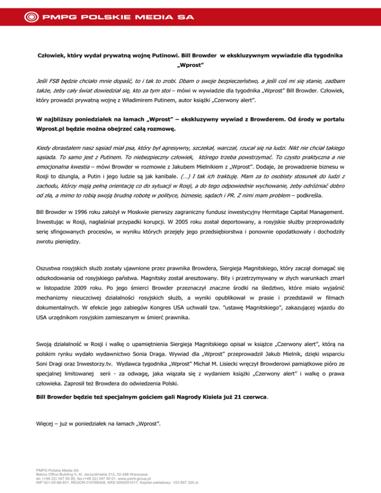 Człowiek, który wydał prywatną wojnę Putinowi. Bill Browder w ekskluzywnym wywiadzie dla tygodnika „Wprost” Jeśli FSB będzie chciało mnie dopaść, to i tak to zrobi. Dbam o swoje bezpieczeństwo, a jeśli coś mi się stanie, zadbam także, żeby cały świat dowiedział się, kto za tym stoi – mówi w wywiadzie dla tygodnika „Wprost” Bill Browder. Człowiek, który prowadzi prywatną wojnę z Władimirem Putinem, autor książki „Czerwony alert”. W najbliższy poniedziałek na łamach „Wprost” – ekskluzywny wywiad z Browderem. Od środy w portalu Wprost.pl będzie można obejrzeć całą rozmowę. Kiedy dorastałem nasz sąsiad miał psa, który był agresywny, szczekał, warczał, rzucał się na ludzi. Nikt nie chciał takiego sąsiada. To samo jest z Putinem. To niebezpieczny człowiek, którego trzeba powstrzymać. To czysto praktyczna a nie emocjonalna kwestia – mówi Browder w rozmowie z Jakubem Mielnikiem z „Wprost”. Dodaje, że prowadzenie biznesu w Rosji to dżungla, a Putin i jego ludzie są jak kanibale. (…) I tak ich traktuję. Mam za to osobisty stosunek do ludzi z zachodu, którzy mają pełną orientację co do sytuacji w Rosji, a do tego odpowiednie wychowanie, żeby odróżniać dobro od zła, a mimo to robią swoją brudną robotę w polityce, biznesie, sądach i PR. Z nimi mam problem – podkreśla. Bill Browder w 1996 roku założył w Moskwie pierwszy zagraniczny fundusz inwestycyjny Hermitage Capital Management. Inwestując w Rosji, nagłaśniał przypadki korupcji. W 2005 roku został deportowany, a rosyjskie służby przeprowadziły serię sfingowanych procesów, w wyniku których przejęły jego przedsiębiorstwa i ponownie opodatkowały i dochodziły zwrotu pieniędzy. Oszustwa rosyjskich służb zostały ujawnione przez prawnika Browdera, Siergieja Magnitskiego, który zaczął domagać się odszkodowania od rosyjskiego państwa. Magnitsky został aresztowany. Bity i przetrzymywany w złych warunkach zmarł w listopadzie 2009 roku. Po jego śmierci Browder przeznaczył znaczne środki na śledztwo, które miało wyjaśnić mechanizmy nieuczciwej działalności rosyjskich służb, a wyniki opublikował w prasie i przedstawił w filmach dokumentalnych. W efekcie jego zabiegów Kongres USA uchwalił tzw. ”ustawę Magnitskiego”, zakazującej wjazdu do USA urzędnikom rosyjskim zamieszanym w śmierć prawnika. Swoją działalność w Rosji i walkę o upamiętnienia Siergieja Magnitskiego opisał w książce „Czerwony alert”, którą na polskim rynku wydało wydawnictwo Sonia Draga. Wywiad dla „Wprost” przeprowadził Jakub Mielnik, dzięki wsparciu Soni Dragi oraz Inwestorzy.tv. Wydawca tygodnika „Wprost” Michał M. Lisiecki wręczył Browderowi pamiątkowe pióro ze specjalnej limitowanej serii - za odwagę, jaka wiązała się z wydaniem książki „Czerwony alert” i walkę o prawa człowieka. Zaprosił też Browdera do odwiedzenia Polski. Bill Browder będzie też specjalnym gościem gali Nagrody Kisiela już 21 czerwca. Więcej – już w poniedziałek na łamach „Wprost”. PMPG Polskie Media SA Batory Office Building II, Al. Jerozolimskie 212, 02-486 Warszawa tel. (+48 22) 347 50 00, fax (+48 22) 347 50 01, www.point-group.pl NIP 521-00-88-831, REGON 010768408, KRS 0000051017, Kapitał zakładowy: 103 897 320 zł