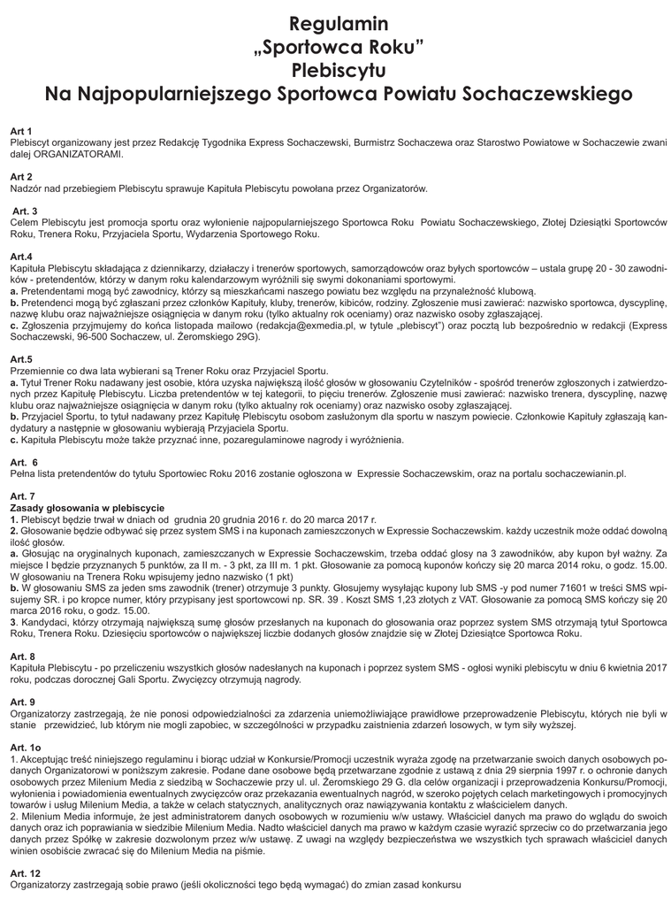 Regulamin „Sportowca Roku” Plebiscytu Na Najpopularniejszego Sportowca Powiatu Sochaczewskiego Art 1 Plebiscyt organizowany jest przez Redakcję Tygodnika Express Sochaczewski, Burmistrz Sochaczewa oraz Starostwo Powiatowe w Sochaczewie zwani dalej ORGANIZATORAMI. Art 2 Nadzór nad przebiegiem Plebiscytu sprawuje Kapituła Plebiscytu powołana przez Organizatorów. Art. 3 Celem Plebiscytu jest promocja sportu oraz wyłonienie najpopularniejszego Sportowca Roku Powiatu Sochaczewskiego, Złotej Dziesiątki Sportowców Roku, Trenera Roku, Przyjaciela Sportu, Wydarzenia Sportowego Roku. Art.4 Kapituła Plebiscytu składająca z dziennikarzy, działaczy i trenerów sportowych, samorządowców oraz byłych sportowców – ustala grupę 20 - 30 zawodników - pretendentów, którzy w danym roku kalendarzowym wyróżnili się swymi dokonaniami sportowymi. a. Pretendentami mogą być zawodnicy, którzy są mieszkańcami naszego powiatu bez względu na przynależność klubową. b. Pretendenci mogą być zgłaszani przez członków Kapituły, kluby, trenerów, kibiców, rodziny. Zgłoszenie musi zawierać: nazwisko sportowca, dyscyplinę, nazwę klubu oraz najważniejsze osiągnięcia w danym roku (tylko aktualny rok oceniamy) oraz nazwisko osoby zgłaszającej. c. Zgłoszenia przyjmujemy do końca listopada mailowo ([email protected], w tytule „plebiscyt”) oraz pocztą lub bezpośrednio w redakcji (Express Sochaczewski, 96-500 Sochaczew, ul. Żeromskiego 29G). Art.5 Przemiennie co dwa lata wybierani są Trener Roku oraz Przyjaciel Sportu. a. Tytuł Trener Roku nadawany jest osobie, która uzyska największą ilość głosów w głosowaniu Czytelników - spośród trenerów zgłoszonych i zatwierdzonych przez Kapitułę Plebiscytu. Liczba pretendentów w tej kategorii, to pięciu trenerów. Zgłoszenie musi zawierać: nazwisko trenera, dyscyplinę, nazwę klubu oraz najważniejsze osiągnięcia w danym roku (tylko aktualny rok oceniamy) oraz nazwisko osoby zgłaszającej. b. Przyjaciel Sportu, to tytuł nadawany przez Kapitułę Plebiscytu osobom zasłużonym dla sportu w naszym powiecie. Członkowie Kapituły zgłaszają kandydatury a następnie w głosowaniu wybierają Przyjaciela Sportu. c. Kapituła Plebiscytu może także przyznać inne, pozaregulaminowe nagrody i wyróżnienia. Art. 6 Pełna lista pretendentów do tytułu Sportowiec Roku 2016 zostanie ogłoszona w Expressie Sochaczewskim, oraz na portalu sochaczewianin.pl. Art. 7 Zasady głosowania w plebiscycie 1. Plebiscyt będzie trwał w dniach od grudnia 20 grudnia 2016 r. do 20 marca 2017 r. 2. Głosowanie będzie odbywać się przez system SMS i na kuponach zamieszczonych w Expressie Sochaczewskim. każdy uczestnik może oddać dowolną ilość głosów. a. Głosując na oryginalnych kuponach, zamieszczanych w Expressie Sochaczewskim, trzeba oddać glosy na 3 zawodników, aby kupon był ważny. Za miejsce I będzie przyznanych 5 punktów, za II m. - 3 pkt, za III m. 1 pkt. Głosowanie za pomocą kuponów kończy się 20 marca 2014 roku, o godz. 15.00. W głosowaniu na Trenera Roku wpisujemy jedno nazwisko (1 pkt) b. W głosowaniu SMS za jeden sms zawodnik (trener) otrzymuje 3 punkty. Głosujemy wysyłając kupony lub SMS -y pod numer 71601 w treści SMS wpisujemy SR. i po kropce numer, który przypisany jest sportowcowi np. SR. 39 . Koszt SMS 1,23 złotych z VAT. Głosowanie za pomocą SMS kończy się 20 marca 2016 roku, o godz. 15.00. 3. Kandydaci, którzy otrzymają największą sumę głosów przesłanych na kuponach do głosowania oraz poprzez system SMS otrzymają tytuł Sportowca Roku, Trenera Roku. Dziesięciu sportowców o największej liczbie dodanych głosów znajdzie się w Złotej Dziesiątce Sportowca Roku. Art. 8 Kapituła Plebiscytu - po przeliczeniu wszystkich głosów nadesłanych na kuponach i poprzez system SMS - ogłosi wyniki plebiscytu w dniu 6 kwietnia 2017 roku, podczas dorocznej Gali Sportu. Zwycięzcy otrzymują nagrody. Art. 9 Organizatorzy zastrzegają, że nie ponosi odpowiedzialności za zdarzenia uniemożliwiające prawidłowe przeprowadzenie Plebiscytu, których nie byli w stanie przewidzieć, lub którym nie mogli zapobiec, w szczególności w przypadku zaistnienia zdarzeń losowych, w tym siły wyższej. Art. 1o 1. Akceptując treść niniejszego regulaminu i biorąc udział w Konkursie/Promocji uczestnik wyraża zgodę na przetwarzanie swoich danych osobowych podanych Organizatorowi w poniższym zakresie. Podane dane osobowe będą przetwarzane zgodnie z ustawą z dnia 29 sierpnia 1997 r. o ochronie danych osobowych przez Milenium Media z siedzibą w Sochaczewie przy ul. ul. Żeromskiego 29 G. dla celów organizacji i przeprowadzenia Konkursu/Promocji, wyłonienia i powiadomienia ewentualnych zwycięzców oraz przekazania ewentualnych nagród, w szeroko pojętych celach marketingowych i promocyjnych towarów i usług Milenium Media, a także w celach statycznych, analitycznych oraz nawiązywania kontaktu z właścicielem danych. 2. Milenium Media informuje, że jest administratorem danych osobowych w rozumieniu w/w ustawy. Właściciel danych ma prawo do wglądu do swoich danych oraz ich poprawiania w siedzibie Milenium Media. Nadto właściciel danych ma prawo w każdym czasie wyrazić sprzeciw co do przetwarzania jego danych przez Spółkę w zakresie dozwolonym przez w/w ustawę. Z uwagi na względy bezpieczeństwa we wszystkich tych sprawach właściciel danych winien osobiście zwracać się do Milenium Media na piśmie. Art. 12 Organizatorzy zastrzegają sobie prawo (jeśli okoliczności tego będą wymagać) do zmian zasad konkursu