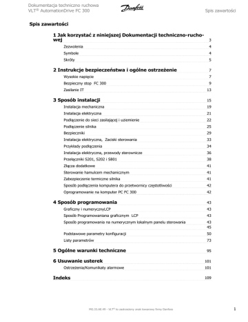 Dokumentacja techniczno ruchowa VLT® AutomationDrive FC 300 Spis zawartości Spis zawartości 1 Jak korzystać z niniejszej Dokumentacji techniczno-ruchowej 3 Zezwolenia 4 Symbole 4 Skróty 5 2 Instrukcje bezpieczeństwa i ogólne ostrzeżenie 7 Wysokie napięcie 7 Bezpieczny stop FC 300 9 Zasilanie IT 13 3 Sposób instalacji 15 Instalacja mechaniczna 19 Instalacja elektryczna 21 Podłączenie do sieci zasilającej i uziemienie 22 Podłączenie silnika 25 Bezpieczniki 29 Instalacja elektryczna, Zaciski sterowania 33 Przykłady podłączenia 34 Instalacja elektryczna, przewody sterownicze 36 Przełączniki S201, S202 i S801 38 Złącza dodatkowe 41 Sterowanie hamulcem mechanicznym 41 Zabezpieczenie termiczne silnika 41 Sposób podłączenia komputera do przetwornicy częstotliwości 42 Oprogramowanie na komputer PC FC 300 42 4 Sposób programowania 43 Graficzny i numerycznyLCP 43 Sposób Programowaniana graficznym LCP 43 Sposób programowania na numerycznym lokalnym panelu sterowania 43 45 Podstawowe parametry konfiguracji 50 Listy parametrów 73 5 Ogólne warunki techniczne 6 Usuwanie usterek Ostrzeżenia/Komunikaty alarmowe Indeks 95 101 101 109 MG.33.AE.49 - VLT® to zastrzeżony znak towarowy firmy Danfoss 1 1 Jak korzystać z niniejszej Dokumentacji techniczno-ruchowej Dokumentacja techniczno ruchowa VLT® AutomationDrive FC 300 1 2 MG.33.AE.49 - VLT® to zastrzeżony znak towarowy firmy Danfoss Dokumentacja techniczno ruchowa VLT® AutomationDrive FC 300 1 Jak korzystać z niniejszej Dokumentacji techniczno-ruchowej 1 Jak korzystać z niniejszej Dokumentacji techniczno-ruchowej 1 VLT AutomationDrive Dokumentacja Techniczno-Ruchowa Wersja oprogramowania: 5.8x Ta dokumentacja techniczno-ruchowa może być używana w przypadku wszystkich przetwornic częstotliwości VLT AutomationDrive z oprogramowaniem w wersji 5.8x. Numer wersji oprogramowania można odczytać z parametr 15-43 Wersja oprogramowania. 1.1.1 Jak korzystać z niniejszej Dokumentacji Techniczno-Ruchowej VLT AutomationDrive jest zaprojektowana tak, aby zapewniać wysokowydajne działanie wału w silnikach elektrycznych. Należy dokładnie przeczytać tę instrukcję, aby prawidłowo korzystać z urządzenia. Nieprawidłowe obchodzenie się z przetwornicą częstotliwości może spowodować jej niewłaściwą pracę lub związanych z nią innych urządzeń, skrócić okres jej trwałości mechanicznej lub spowodować inne problemy. Niniejsze instrukcje pomogą w pierwszych krokach oraz podczas instalowania, programowania i rozwiązywania problemów związanych z VLT AutomationDrive. VLT AutomationDrive dostarczany jest w dwóch wersjach poziomu wydajności wału. FC 301 obejmuje zakresy od skalarnych (U/f) do VVC+ i obsługuje tylko silniki asynchroniczne. FC 302 jest wysokiej wydajności przetwornicą częstotliwości dla silników asynchronicznych, a także stałych, obsługuje też różnego rodzaju zasady sterowania silnikiem, takie jak skalarne (U/f), VVC+ i wektorowe sterowanie strumienia. Niniejsze instrukcje dotyczą zarówno FC 301, jak i FC 302. Jeśli w tekście używana jest nazwa FC 300, oznacza to że informacje dotyczą obu wykonań. W pozostałych przypadkach dla FC 301 lub FC 302 opis dotyczy konkretnych urządzeń. Rozdział 1, Jak korzystać z niniejszej Dokumentacji Techniczno-Ruchowej, wprowadza w instrukcję i informuje o stosowanych zatwierdzeniach, symbolach i skrótach. Rozdział 2, Instrukcje bezpieczeństwa i ogólne ostrzeżenia, oznacza instrukcje prawidłowej obsługi FC 300. Rozdział 3, Sposób instalacji, zapoznaje użytkownika z instalacją mechaniczną i techniczną. Rozdział 4, Sposób programowania, zawiera opis obsługi i programowania FC 300 za pomocą LCP. Rozdział 5, Ogólne warunki techniczne, zawiera dane techniczne FC 300. Rozdział 6, Usuwanie usterek, pomaga użytkownikowi w rozwiązywaniu problemów, które mogą wystąpić podczas pracyFC 300. MG.33.AE.49 - VLT® to zastrzeżony znak towarowy firmy Danfoss 3 1 Jak korzystać z niniejszej Dokumentacji techniczno-ruchowej Dokumentacja techniczno ruchowa VLT® AutomationDrive FC 300 Dostępna literatura dlaFC 300 1 - Dokumentacja Techniczno-Ruchowa VLT AutomationDrive zawiera informacje niezbędne do konfiguracji i obsługi przetwornicy częstotliwości. Zalecenia Projektowe VLT AutomationDrive zawierają wszystkie informacje techniczne o przetwornicy częstotliwości oraz o zastosowaniach, takich jak enkoder, przelicznik i opcje przekaźnika. - Dokumentacja techniczno - ruchowa Profibus VLT AutomationDrive zawiera informacje wymagane do sterowania , monitoringu i programowania przetwornicy za pomocą Profibus magistrali komunikacyjnej. - Dokumentacja techniczno - ruchowa VLT AutomationDrive DeviceNet zawiera informacje potrzebne do sterowania, monitorowania i programo- - Dokumentacja techniczno - ruchowa VLT AutomationDrive MCT 10 zawiera informacje dotyczące instalacji i obsługi tego oprogramowania na wania przetwornicy częstotliwości za pomocą DeviceNet magistrali komunikacyjnej. komputerze PC. - Dokumentacja techniczno-Ruchowa VLT AutomationDrive IP21 / Typ 1 zawiera informacje wymagane do instalacji opcji IP21 / Typ 1. - VLT AutomationDrivezasilania rezerwowego 24V DC zawiera informacje dotyczące instalacji opcji zasilania rezerwowego 24 V DC. Literatura techniczna Danfoss jest również dostępna online, na stronie internetowejwww.danfoss.com/drives. 1.1.2 Zezwolenia 1.1.3 Symbole Symbole użyte w niniejszej Dokumentacji Techniczno-Ruchowej. Uwaga Wskazuje fragment, na który czytający powinien zwrócić uwagę. Oznacza ogólne ostrzeżenia. Wskazuje ostrzeżenie o wysokim napięciu. ∗ 4 Wskazuje nastawę fabryczną, domyślną MG.33.AE.49 - VLT® to zastrzeżony znak towarowy firmy Danfoss Dokumentacja techniczno ruchowa VLT® AutomationDrive FC 300 1 Jak korzystać z niniejszej Dokumentacji techniczno-ruchowej 1.1.4 Skróty Prąd przemienny Amerykańska miara grubości kabla Amper/AMP Automatyczne dopasowanie 