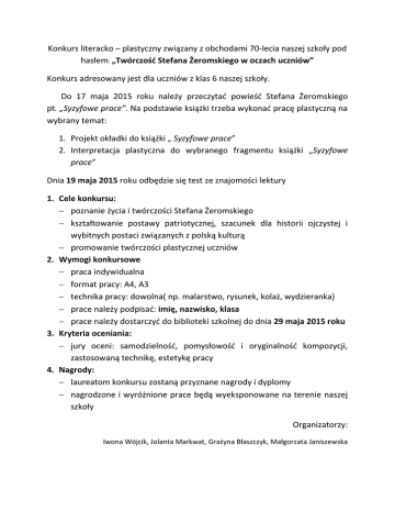 Konkurs literacko – plastyczny związany z obchodami 70-lecia naszej szkoły pod hasłem: „Twórczość Stefana Żeromskiego w oczach uczniów” Konkurs adresowany jest dla uczniów z klas 6 naszej szkoły. Do 17 maja 2015 roku należy przeczytać powieść Stefana Żeromskiego pt. „Syzyfowe prace”. Na podstawie książki trzeba wykonać pracę plastyczną na wybrany temat: 1. Projekt okładki do książki „ Syzyfowe prace” 2. Interpretacja plastyczna do wybranego fragmentu książki „Syzyfowe prace” Dnia 19 maja 2015 roku odbędzie się test ze znajomości lektury 1. Cele konkursu: poznanie życia i twórczości Stefana Żeromskiego kształtowanie postawy patriotycznej, szacunek dla historii ojczystej i wybitnych postaci związanych z polską kulturą promowanie twórczości plastycznej uczniów 2. Wymogi konkursowe praca indywidualna format pracy: A4, A3 technika pracy: dowolna( np. malarstwo, rysunek, kolaż, wydzieranka) prace należy podpisać: imię, nazwisko, klasa prace należy dostarczyć do biblioteki szkolnej do dnia 29 maja 2015 roku 3. Kryteria oceniania: jury oceni: samodzielność, pomysłowość i oryginalność kompozycji, zastosowaną technikę, estetykę pracy 4. Nagrody: laureatom konkursu zostaną przyznane nagrody i dyplomy nagrodzone i wyróżnione prace będą wyeksponowane na terenie naszej szkoły Organizatorzy: Iwona Wójcik, Jolanta Markwat, Grażyna Błaszczyk, Małgorzata Janiszewska