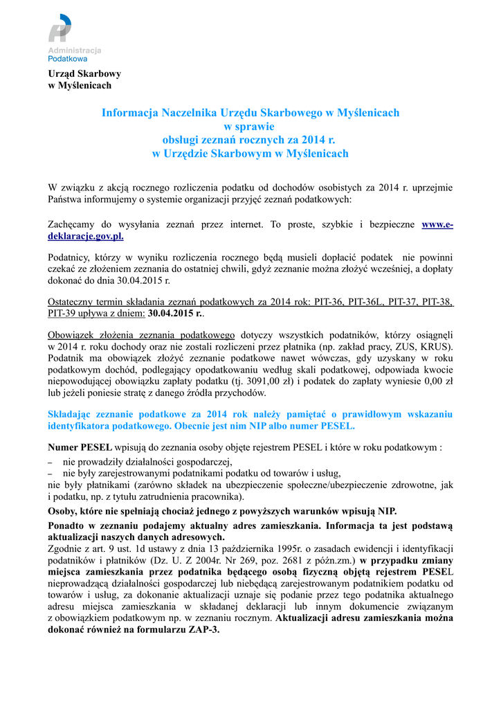 Urząd Skarbowy w Myślenicach Informacja Naczelnika Urzędu Skarbowego w Myślenicach w sprawie obsługi zeznań rocznych za 2014 r. w Urzędzie Skarbowym w Myślenicach W związku z akcją rocznego rozliczenia podatku od dochodów osobistych za 2014 r. uprzejmie Państwa informujemy o systemie organizacji przyjęć zeznań podatkowych: Zachęcamy do wysyłania zeznań przez internet. To proste, szybkie i bezpieczne www.edeklaracje.gov.pl. Podatnicy, którzy w wyniku rozliczenia rocznego będą musieli dopłacić podatek nie powinni czekać ze złożeniem zeznania do ostatniej chwili, gdyż zeznanie można złożyć wcześniej, a dopłaty dokonać do dnia 30.04.2015 r. Ostateczny termin składania zeznań podatkowych za 2014 rok: PIT-36, PIT-36L, PIT-37, PIT-38, PIT-39 upływa z dniem: 30.04.2015 r.. Obowiązek złożenia zeznania podatkowego dotyczy wszystkich podatników, którzy osiągnęli w 2014 r. roku dochody oraz nie zostali rozliczeni przez płatnika (np. zakład pracy, ZUS, KRUS). Podatnik ma obowiązek złożyć zeznanie podatkowe nawet wówczas, gdy uzyskany w roku podatkowym dochód, podlegający opodatkowaniu według skali podatkowej, odpowiada kwocie niepowodującej obowiązku zapłaty podatku (tj. 3091,00 zł) i podatek do zapłaty wyniesie 0,00 zł lub jeżeli poniesie stratę z danego źródła przychodów. Składając zeznanie podatkowe za 2014 rok należy pamiętać o prawidłowym wskazaniu identyfikatora podatkowego. Obecnie jest nim NIP albo numer PESEL. Numer PESEL wpisują do zeznania osoby objęte rejestrem PESEL i które w roku podatkowym : – nie prowadziły działalności gospodarczej, – nie były zarejestrowanymi podatnikami podatku od towarów i usług, nie były płatnikami (zarówno składek na ubezpieczenie społeczne/ubezpieczenie zdrowotne, jak i podatku, np. z tytułu zatrudnienia pracownika). Osoby, które nie spełniają chociaż jednego z powyższych warunków wpisują NIP. Ponadto w zeznaniu podajemy aktualny adres zamieszkania. Informacja ta jest podstawą aktualizacji naszych danych adresowych. Zgodnie z art. 9 ust. 1d ustawy z dnia 13 października 1995r. o zasadach ewidencji i identyfikacji podatników i płatników (Dz. U. Z 2004r. Nr 269, poz. 2681 z późn.zm.) w przypadku zmiany miejsca zamieszkania przez podatnika będącego osobą fizyczną objętą rejestrem PESEL nieprowadzącą działalności gospodarczej lub niebędącą zarejestrowanym podatnikiem podatku od towarów i usług, za dokonanie aktualizacji uznaje się podanie przez tego podatnika aktualnego adresu miejsca zamieszkania w składanej deklaracji lub innym dokumencie związanym z obowiązkiem podatkowym np. w zeznaniu rocznym. Aktualizacji adresu zamieszkania można dokonać również na formularzu ZAP-3. Druki zeznań rocznych można otrzymać w siedzibie tut. Urzędu lub pobrać ze strony internetowej Ministerstwa Finansów pod adresem www.finanse.mf.gov.pl,.Zarówno takie formularze jak również formularze kserowane, są honorowane w urzędach skarbowych. Formularze zeznań podatkowych będą również dostępne w Urzędach Miast i Gmin powiatu myślenickiego. W uzasadnionych przypadkach na wniosek podatnika, druki zeznań mogą zostać przesłane pocztą. Należy przy tym pamiętać, aby rozliczyć się na formularzu aktualnym dla danego roku podatkowego. Najlepiej rozliczyć się przez Internet za pomocą aplikacji e-Deklaracje Desktop lub formularzy interaktywnych znajdujących się na stronie www.e-deklaracje.gov.pl. Wszystkie niezbędne informacje na temat rozliczenia podatku dochodowego od osób fizycznych znajdziesz na stronie www.szybkipit.pl Skorzystaj z deklaracji wstępnie wypełnionej (PFR)- urząd skarbowy wypełni za Ciebie Twoje rozliczenie roczne, wszystkie informacje na stronie www.portalpodatkowy.mf.gov.pl OBSŁUGA ZEZNAŃ W URZĘDZIE SKARBOWYM W MYŚLENICACH Zeznania podatkowe: PIT-36, PIT-36L,PIT-37,PIT-38 i PIT-39 oraz korekty przedmiotowych zeznań można złożyć: • drogą elektroniczną z podpisem kwalifikowanym lub bez podpisu kwalifikowanego, • za pośrednictwem poczty (koszt przesyłki zeznania ponosi podatnik) Zeznania można przesłać odpłatnie listem poleconym na adres: Naczelnik Urzędu Skarbowego ul. H. Cegielskiego 2 32-400 Myślenice Na kopercie należy umieścić również imię i nazwisko oraz dokładny adres nadawcy. • w siedzibie urzędu na Sali Obsługi Bezpośredniej , ZACHĘCA SIĘ DO PRZESYŁANIA FORMULARZY ZEZNAŃ PODATKOWYCH DROGĄ ELEKTRONICZNĄ, umożliwi to wcześniejszy zwrot nadpłaty podatku. Interaktywny formularz za pomocą, którego będzie można wypełnić i wysłać zeznanie roczne należy pobrać ze strony www.e-deklaracje.gov.pl - na stronie tej umieszczona została również instrukcja. Wpłaty podatku wynikającego z zeznania za 2014 rok można dokonać: • przelewem bankowym Adres i numer konta Urzędu Skarbowego w Myślenicach: Urząd Skarbowy ul. H. Cegielskiego 2 32-400 Myślenice nr konta:44 1010 1270 0004 7522 2300 0000 NBP Oddział Okręgowy w Krakowie • przekazem pocztowym- wpisując podany wyżej nr konta, z tytułu blankietu należy podać tytuł wpłaty „Rozliczenie podatku dochodowego za 2014 rok np. PIT-36, PIT-37...” • w kasie Urzędu Skarbowego – w przypadku podatników nie prowadzących działalności gospodarczej. W tytule wpłaty oprócz danych podatnika należy wpisać: „Rozliczenie podatku dochodowego za 2014 rok np. PIT-36, PIT-37...” Termin wpłaty: • podatku wynikającego z zeznania podatkowego PIT-28 za 2014 r. upływa dnia 31.01.2015r. • Podatku wynikającego z zeznania podatkowego PIT-36, PIT-37, PIT-38 i PIT-39 upływa dnia 30 kwietnia 2015 r. Formy zwrotu nadpłaty podatku za 2014 r.: Podatnik może wnioskować o dokonanie zwrotu wykazanej w zeznaniu nadpłaty w następującej formie: • przelewem bankowym na rachunek zgłoszony do urzędu UWAGA: Warunkiem zwrotu nadpłaty na rachunek bankowy jest zgłoszenie osobistego rachunku bankowego wyłącznie na