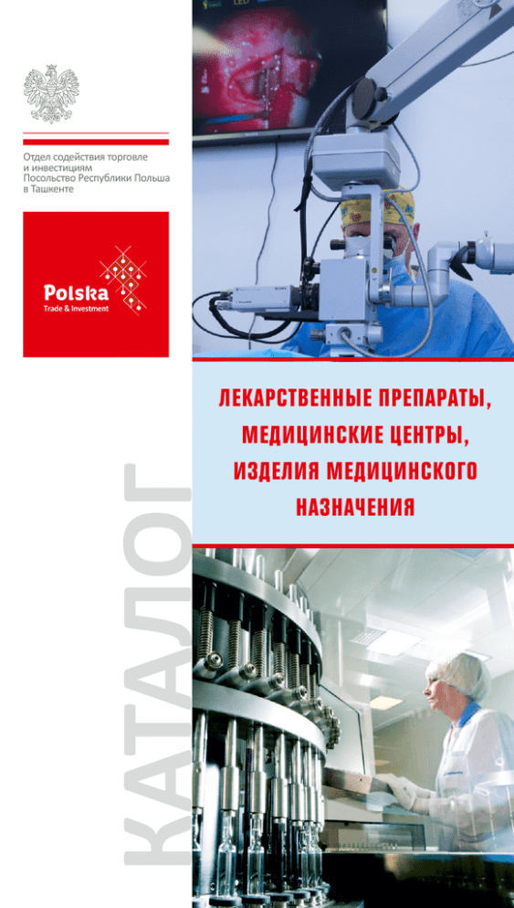 Отдел содействия торговле и инвестициям Посольство Республики Польша в Ташкенте ЛЕКАРСТВЕННЫЕ ПРЕПАРАТЫ, МЕДИЦИНСКИЕ ЦЕНТРЫ, ИЗДЕЛИЯ МЕДИЦИНСКОГО НАЗНАЧЕНИЯ ГОСУДАРСТВЕННЫЕ ОРГАНЫ Ministerstwo Zdrowia (Министерство здравоохранения) ul. Miodowa 15 00-952 Warszawa tel.: +48 22 634 93 26, +48 22 634 96 00 fax:+48 22 634 92 13 e-mail: [email protected] http://www.mz.gov.pl Narodowy Fundusz Zdrowia (Национальный Фонд Здоровья) ul. Grójecka 186 02-390 Warszawa tel.: +48 22 572 60 00 fax: +48 22 572 63 33 http://www.nfz.gov.pl Główny Inspektorat Farmaceutyczny (Главная Фармацевтическая Инспекция) ul.Długa 38/40 00-238 Warszawa tel.: +48 22 831 42 81 fax: +48 22 831 02 44 e-mail: [email protected] Narodowy Instytut Leków (Национальный Институт Лекарственных Препаратов) ul. Chełmska 30/34 00-725 Warszawa tel.:+48 22 851 43 69, +48 22 851 44 96 fax:+48 22 841 06 52 e-mail: [email protected] Urząd Rejestracji Produktów Leczniczych, Wyrobów Medycznych i Produktów Biobójczych (Управление регистрации лекарственных препаратов, медицинских изделий и биологических продуктов) ul. Ząbkowska 41 03-736 Warszawa tel.: +48 22 492 11 00 fax: +48 22 492 11 09 http://www.urpl.gov.pl ОТРАСЛЕВЫЕ ОРГАНЫ САМОУПРАВЛЕНИЯ Naczelna Izba Lekarska (Главная Врачебная Палата) ul. Sobieskiego 110 00-764 Warszawa tel.:+48 22 559 13 00, +48 22 559 13 24 fax:+48 22 559 13 23 http://www.nil.org.pl Naczelna Izba Aptekarska (Главная Аптекарская Палата) ul. Długa 16 00-238 Warszawa tel.: +48 22 635 92 85, +48 22 635 06 70 fax: +48 22 887 50 32 e-mail: [email protected] Naczelna Izba PielĘgniarek i Położnych (Главная Палата медсестер и акушерок) ul. Pory 78, X p. 02-757 Warszawa tel./fax:+48 22 327 61 61, +48 22 327 61 60 e-mail: [email protected] Polskie Towarzystwo Farmaceutyczne (Польское Фармацевтическое Общество) ul. Długa 16 00-238 Warszawa tel.:+48 22 831 15 42, +48 22 831 79 63 faх:+48 22 831 15 42, +48 22 831 79 63 http://www.ptfarm.pl OgólnopolskA IzbA GospodarczA Wyrobów Medycznych “POLMED” (Всепольская Хозяйственная Палата медицинской продукции «POLMED») ul. Dominikańska 14 02-738 Warszawa tel.: +48 22 853 49 92 e-mail: [email protected] http://www.polmed.org.pl Polska Izba Przemysłu Farmaceutycznego i Wyrobów Medycznych POLFARMED (Польская Палата фармацевтической промышленности и медицинских изделий «POLFARMED») ul. Łucka 2/4/6 00-845 Warszawa tel.:+48 22 654 53 52, +48 22 654 53 51 fax:+48 22 654 54 20 e-mail: [email protected] http://www.polfarmed.com.pl IZBA GOSPODARCZA «MEDYCYNA POLSKA» (Хозяйственная Палата «MEDYCYNA POLSKA») ul. Długa 44/50 00-241 Warszawa tel.: +48 22 831 52 21 fax: +48 22 635 86 33 KRAJOWA IZBA GOSPODARCZOREHABILITACYJNA (Польская Палата Реабилитации) ul. Majdańska 24 04-110 Warszawa tel.: +48 22 828 68 04 / 05 fax: +48 22 826 30 38 e-mail: [email protected] http://www.kigr.pl Polskie Towarzystwo Kardiologiczne (Польское кардиологическое общество) ul. Stawki 3a/1 00-193 Warszawa tel.: +48 22 887 18 56 fax: +48.22 887 18 58 http://www.ptkardio.pl http://www.escardio.org POLSKIE TOWARZYSTWO STOMATOLOGICZNE (Польское стоматологическое общество) ul. Montelupich 4 31-155 Kraków tel.: +48 12 424 54 42 fax: +48 12 424 54 94 e-mail: [email protected] http://www.pts.net.pl http://www.pts.home.pl Polskie Stowarzyszenie Implantologiczne (PSI) (Польское имплантологическое объединение) ul. Dyrekcyjna 10/4a 40-013 Katowice tel./fax: + 48 32 203 27 85 e-mail: [email protected] http://www.psi-icoi.pl НАУЧНО-ИССЛЕДОВАТЕЛЬСКИЕ ИНСТИТУТЫ Instytut Fizjologii i Patologii Słuchu (Институт физиологии и патологии слуха) ul. Zgrupowania AK “Kampinos” 1 01-943 Warszawa tel.: +48 22 835 66 70 fax: +48 22 835 52 14 e-mail: [email protected] http://www.ifps.org.pl Instytut Gruźlicy i Chorób Płuc (Институт по борьбе с туберкулезом и болезнями легких) ul. Płocka 26 01-138 Warszawa tel.: +48 22 431 22 13 fax: +48 22 431 24 52 e-mail: [email protected] http://www.igichp.edu.pl Instytut Hematologii i Transfuzjologii (Институт гематологии и переливания крови) ul. Indiry Gandhi 14 02-776 Warszawa tel.: +48 22 349 61 00 fax: +48 22 349 61 78 e-mail: [email protected] http://www.ihit.waw.pl Instytut Kardiologii im. Prymasa Tysiąclecia Stefana Kardynała Wyszyńskiego (Институт кардиологии) ul. Alpejska 42 04-628 Warszawa tel.: +48 22 815 30 11, +48 22 343 46 00 fax: +48 22 343 45 25 e-mail: [email protected] http://www.ikard.pl Instytut Matki i Dziecka (Институт матери и ребенка) ul. Kasprzaka 17a 01-211 Warszawa tel.: +48 22 327 70 00 fax: +48 22 327 73 24 e-mail: [email protected] http://www.imid.med.pl Instytut Medycyny Wsi im. Witolda Chodźki (Институт сельской медицины) ul. Jaczewskiego 2 20-950 Lublin tel.: +48 81 718 44 00 fax: +48 81 747 86 46 e-mail: [email protected] http://www.imw.lublin.pl Instytut Medycyny Pracy im. prof. Jerzego Nofera (Институт медицины труда) ul. Św. Teresy od Dzieciątka Jezus 8 91-348 Łódź tel.: +48 42 631 45 02 fax: +48 42 656 83 31 e-mail: [email protected] http: