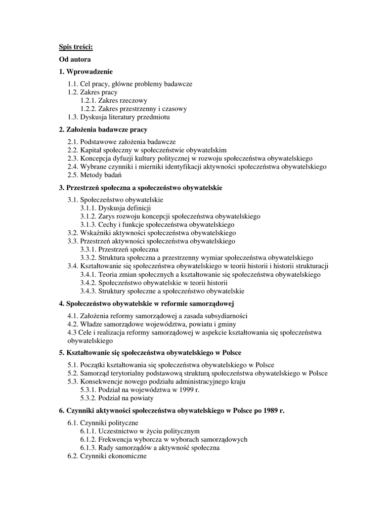 Spis tre ci: Od autora 1. Wprowadzenie 1.1. Cel pracy, główne problemy badawcze 1.2. Zakres pracy 1.2.1. Zakres rzeczowy 1.2.2. Zakres przestrzenny i czasowy 1.3. Dyskusja literatury przedmiotu 2. Zało enia badawcze pracy 2.1. Podstawowe zało enia badawcze 2.2. Kapitał społeczny w społecze stwie obywatelskim 2.3. Koncepcja dyfuzji kultury politycznej w rozwoju społecze stwa obywatelskiego 2.4. Wybrane czynniki i mierniki identyfikacji aktywno ci społecze stwa obywatelskiego 2.5. Metody bada 3. Przestrze społeczna a społecze stwo obywatelskie 3.1. Społecze stwo obywatelskie 3.1.1. Dyskusja definicji 3.1.2. Zarys rozwoju koncepcji społecze stwa obywatelskiego 3.1.3. Cechy i funkcje społecze stwa obywatelskiego 3.2. Wska niki aktywno ci społecze stwa obywatelskiego 3.3. Przestrze aktywno ci społecze stwa obywatelskiego 3.3.1. Przestrze społeczna 3.3.2. Struktura społeczna a przestrzenny wymiar społecze stwa obywatelskiego 3.4. Kształtowanie si społecze stwa obywatelskiego w teorii historii i historii strukturacji 3.4.1. Teoria zmian społecznych a kształtowanie si społecze stwa obywatelskiego 3.4.2. Społecze stwo obywatelskie w teorii historii 3.4.3. Struktury społeczne a społecze stwo obywatelskie 4. Społecze stwo obywatelskie w reformie samorz dowej 4.1. Zało enia reformy samorz dowej a zasada subsydiarno ci 4.2. Władze samorz dowe województwa, powiatu i gminy 4.3 Cele i realizacja reformy samorz dowej w aspekcie kształtowania si społecze stwa obywatelskiego 5. Kształtowanie si społecze stwa obywatelskiego w Polsce 5.1. Pocz tki kształtowania si społecze stwa obywatelskiego w Polsce 5.2. Samorz d terytorialny podstawow struktur społecze stwa obywatelskiego w Polsce 5.3. Konsekwencje nowego podziału administracyjnego kraju 5.3.1. Podział na województwa w 1999 r. 5.3.2. Podział na powiaty 6. Czynniki aktywno ci społecze stwa obywatelskiego w Polsce po 1989 r. 6.1. Czynniki polityczne 6.1.1. Uczestnictwo w yciu politycznym 6.1.2. Frekwencja wyborcza w wyborach samorz dowych 6.1.3. Rady samorz dów a aktywno społeczna 6.2. Czynniki ekonomiczne 6.2.1. Dochody i wydatki w gminach 6.2.2. Indywidualna przedsi biorczo i aktywno ekonomiczna 6.3 Czynniki społeczne 6.3.1. Fundacje i stowarzyszenia 6.3.2. Wolontariat 6.4. Model zmian aktywno ci społecze stwa obywatelskiego 7. Przestrzenne wymiary aktywno ci obywatelskiej w Polsce 7.1. Geograficzne zró nicowanie inicjatyw obywatelskich w Polsce i ich dynamika 7.2. Klasyfikacja wielocechowa aktywno ci obywatelskiej 7.3. Przestrzenne zró nicowanie liczby inicjatyw obywatelskich na poziomie lokalnym 7.3.1. Region aktywnego uczestnictwa 7.3.2. Region pragmatycznego uczestnictwa 7.3.3. Region prostego uczestnictwa 7.3.4. Region silnych, lokalnych relacji społecznych 8. Dyfuzja przestrzenna aktywno ci społecze stwa obywatelskiego 9. Zako czenie Literatura Spatial aspect of the structures and activities od civil society in Poland - Summary