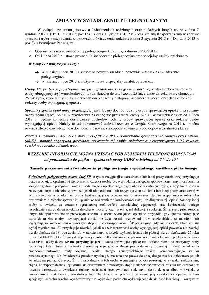 ZMIANY W ŚWIADCZENIU PIELEGNACYJNYM W związku ze zmianą ustawy o świadczeniach rodzinnych oraz niektórych innych ustaw z dnia 7 grudnia 2012 r. (Dz. U. z 2012 r; poz.1548 z dnia 31 grudnia 2012 r. ) oraz zmianą Rozporządzenia w sprawie sposobu i trybu postępowania w sprawach o świadczenia rodzinne z dnia 3 stycznia 2013 r. ( Dz. U. z 2013 r; poz.3) informujemy Pana/ią, że: • • Obecnie przyznane świadczenie pielęgnacyjne kończy się z dniem 30/06/2013 r; Od 1 lipca 2013 r. ustawa przewiduje świadczenie pielęgnacyjne oraz specjalny zasiłek opiekuńczy. W związku z powyższym należy: → W miesiącu lipcu 2013 r. złożyć na nowych zasadach ponownie wniosek na świadczenie pielęgnacyjne; → W miesiącu lipcu 2013 r. złożyć wniosek o specjalny zasiłek opiekuńczy; Osoby, którym będzie przysługiwał specjalny zasiłek opiekuńczy winny dostarczyć :dane członków rodziny osoby ubiegającej się ( wnioskodawcy) w tym dziecka do ukończenia 25 lat, a także dziecka, które ukończyło 25 rok życia, które legitymuje się orzeczeniem o znacznym stopniu niepełnosprawności oraz dane członków rodziny osoby wymagającej opieki . Specjalny zasiłek opiekuńczy przysługuje, jeżeli łączny dochód rodziny osoby sprawującej opiekę oraz rodziny osoby wymagającej opieki w przeliczeniu na osobę nie przekracza kwoty 623 zł. W związku z czym od 1 lipca 2013 r. będzie konieczne dostarczenie dochodów rodziny osoby sprawującej opiekę oraz rodziny osoby wymagającej opieki. Należy to udokumentować zaświadczeniem z Urzędu Skarbowego za 2011 r. można również złożyć oświadczenie o dochodach ( również nieopodatkowanych) pod odpowiedzialnością karną. Zgodnie z uchwałą I OPS 5/12 z dnia 11/12/2012 r. NSA - prowadzenie gospodarstwa rolnego przez rolnika (KRUS) stanowi negatywną przesłankę przyznania tej osobie świadczenia pielęgnacyjnego i jak również specjalnego zasiłku opiekuńczego. WSZELKIE INFORMACJE MOŻNA UZYSKAĆ POD NUMEREM TELEFONU 033/857-76-49 od poniedziałku do piątku w godzinach pracy GOPS w Istebnej od 7 15 do 15 15 Zasady przyznawania świadczenia pielęgnacyjnego i specjalnego zasiłku opiekuńczego Świadczenie pielęgnacyjne zwane dalej ŚP- z tytułu rezygnacji z zatrudnienia lub innej pracy zarobkowej przysługuje matce albo ojcu, opiekunowi faktycznemu dziecka osobie będącej rodziną zastępcza spokrewnioną, innym osobom, na których zgodnie z przepisami kodeksu rodzinnego i opiekuńczego ciąży obowiązek alimentacyjny, z wyjątkiem osób o znacznym stopniu niepełnosprawności-jeżeli nie podejmują lub rezygnują z zatrudnienia lub innej pracy zarobkowej w celu sprawowania opieki nad osoba legitymującą się orzeczeniem o znacznym stopniu niepełnosprawności albo orzeczeniem o niepełnosprawności łącznie ze wskazaniami: konieczności stałej lub długotrwałej opieki pomocy innej osoby w związku ze znacznie ograniczoną możliwością samodzielnej egzystencji oraz konieczności stałego współudziału na co dzień opiekuna dziecka w procesie jego leczenia, rehabilitacji i edukacji. ŚP przysługuje: osobom innym niż spokrewnione w pierwszym stopniu z osoba wymagająca opieki w przypadku gdy spełnia następujące warunki: rodzice osoby wymagającej opieki nie żyją, zostali pozbawieni praw rodzicielskich, są małoletni lub legitymują się orzeczeniem o znacznym stopniu niepełnosprawności. ŚP przysługuje, gdy nie ma osób, które zostały wyżej wymienione. ŚP przysługuje również, jeżeli niepełnosprawność osoby wymagającej opieki powstała nie później niż do ukończenia 18 roku życia lub w trakcie nauki w szkole wyższej, jednak nie później niż do ukończenia 25 roku życia. Od 01/07/2013 r. ŚP przysługuje w wysokości 620 zł miesięcznie jak również za niepełne miesiące kalendarzowe1/30 ŚP za każdy dzień. ŚP nie przysługuje jeżeli: osoba sprawująca opiekę ma ustalone prawo do emerytury, renty rodzinnej z tytułu śmierci małżonka przyznanej w przypadku zbiegu prawa do renty rodzinnej i innego świadczenia emerytalno-rentowego, renty socjalnej, zasiłku stałego, nauczycielskiego zasiłku kompensacyjnego, zasiłku przedemerytalnego lub świadczenia przedemerytalnego, ma ustalone prawo do specjalnego zasiłku opiekuńczego lub świadczenia pielęgnacyjnego. ŚP nie przysługuje jeżeli osoba wymagająca opieki pozostaje w związku małżeńskim, chyba, że współmałżonek legitymuje się orzeczeniem o znacznym stopniu niepełnosprawności, została umieszczona w rodzinie zastępczej, z wyjątkiem rodziny zastępczej spokrewnionej, rodzinnym domu dziecka albo, w związku z koniecznością kształcenia , rewalidacji lub rehabilitacji, w placówce zapewniającej całodobowa opiekę, w tym specjalnym ośrodku szkolno-wychowawczym z wyjątkiem podmiotu wykonującego działalność leczniczą , i korzysta w niej z całodobowej opieki przez więcej niż 5 dni w tygodniu, na osobę wymagającą opieki inna osoba ma ustalone prawo do wcześniejszej emerytury, członek rodziny osoby sprawującej opiekę ma ustalone prawo dom dodatku do zasiłku rodzinnego – urlop wychowawczy, specjalnego zasiłku opiekuńczego lub świadczenia pielęgnacyjnego, na osobę wymagająca opieki jest ustalone prawo do dodatku do zasiłku rodzinnego – wychowawczy, na osobę wymagająca opieki inna osoba jest uprawniona za granicą. Specjalny zasiłek opiekuńczy zwany dalej SZO- przysługuje osobom na których zgodnie z przepisami -Kodeks rodzinny i opiekuńczy ciąży obowiązek alimentacyjny, jeżeli REZYGNUJĄ Z ZATRUDNIENIA lub innej pracy zarobkowej w związku z koniecznością sprawowania stałej opieki nad osoba legitymującą się orzeczeniem o znacznym stopniu niepełnosprawności albo orzeczeniem ze wskazaniami : konieczności stałej lub długotrwałej opieki pomocy innej osoby w związku ze znacznie ograniczoną możliwością samodzielnej egzystencji oraz konieczności stałego wsp