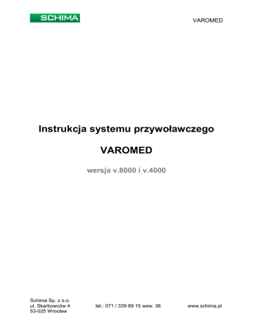 VAROMED Instrukcja systemu przywoławczego VAROMED wersja v.8000 i v.4000 Schima Sp. z o.o. ul. Skarbowców 4 53-025 Wrocław tel.: 071 / 339 89 15 wew. 36 www.schima.pl VAROMED 1. Wersja v.8000 (adresowalne przyciski przywoławczo-odwoławcze) Przykład rozplanowania oddziału ODDZIAŁ SZPITALNY SLS 846461 - Salowa lampka sygnalizacyjna 3 kolory POe 846080 - Przycisk przywoł-odwoł z elektroniką Centrala 846311 - Centrala systemowa ZAS 957452 - Zasilacz 24V DC Wyświetlacz 846821 Przewody: ------ YTKSY 3x2x0,5mm YTKSY3x2x0,8mm - Wyświetlacz ledowy jednostronny System przywoławczy zgodny z normą DIN 0834 2 VAROMED 1.1 Okablowanie korytarza (magistrala oddziałowa) – przewód YTKSY 3x2x0,8mm KaŜdy oddział moŜe składać się maksymalnie z 63 sal/pomieszczeń. Okablowanie oddziału prowadzi się zazwyczaj w tynku w rurkach typu peszel lub w suficie podwieszanym przewodem YTKSY 3x2x0,8mm. Proszę umieścić puszkę instalacyjną nad kaŜdym z pomieszczeń doprowadzić tam przewody z magistrali i wyjść jednym przewodem do Sali. W wersji v.8000 naleŜy magistrale oddziałową wykonać pomiędzy przyciskami przywoławczo-odwoławczymi (art. 846080) a centralą. Przyciski art. 846080 są adresowalne, do nich równieŜ podłącza się pozostałe elementy z sali oraz lampkę umieszczoną przed wejściem do pomieszczenia. Przycisk montować w głębokiej puszce Ø60. 1.2 Okablowanie sali/WC (magistrala salowa) – przewód YTKSY 3x2x0,5mm Połączenie gniazd przywoławczych art. 846235 umieszczonych SALA CHORYCH w panelach nadłóŜkowych lub w ścianach, wykonać równolegle i wyprowadzić jeden wspólny przewód np.: YTKSY 3x2x0,5mm do przycisku przywoławczo-odwoławczego art. 846080 w odpowiednie zaciski ( patrz strona 8). WC NPS Połączenie przycisków sznurkowych w łazience lub w WC NPS wykonać w sposób dowolny tym samym przewodem co w sali. Gdy sala chorych wyposaŜona jest we własną toaletę, naleŜy oprócz przycisków przywoławczych ze sznurkiem zamontować osobny kasownik art. 846191 do kasowania wezwań z WC. Wówczas kasowanie wezwań z toalety będzie niemoŜliwe ogólnym kasownikiem na salę chorych. System przywoławczy zgodny z normą DIN 0834 3 VAROMED 2. Wersja v.4000 (adresowalne lampki trój lub dwu kolorowe) Przykład rozplanowania oddziału ODDZIAŁ SZPITALNY SLS 846040 PO 846181 - Salowa lampka sygnalizacyjna 3 kolory Przewody: - Przycisk przywoł-odwoł Centrala 846311 - Centrala systemowa - - - - - - YTKSY 4x2x0,5mm Zasilacz 957452 _______YTKSY 3x2x0,8mm - Zasilacz 24V DC Wyświetlacz 846821 - Wyświetlacz ledowy jednostronny 846821 System przywoławczy zgodny z normą DIN 0834 4 VAROMED 2.1 Okablowanie korytarza (magistrala oddziałowa) – przewód YTKSY 3x2x0,8mm KaŜdy oddział moŜe składać się maksymalnie z 63 sal/pomieszczeń. Okablowanie oddziału prowadzi się zazwyczaj w tynku w rurkach typu peszel lub w suficie podwieszanym przewodem YTKSY 3x2x0,8mm. W wersji v.4000 naleŜy magistrale oddziałową wykonać pomiędzy lampkami (art. 846040 lub 846050) a centralą. Lampki art. 846040 (3 kolory) i 846050 (2 kolory) są adresowalne, do nich równieŜ podłącza się pozostałe elementy z sali. (patrz strona 10 i 13) 2.2 Okablowanie sali/WC (magistrala salowa) – przewód YTKSY 3x2x0,5mm Połączenie gniazd przywoławczych art. 846235 umieszczonych w panelach nadłóŜkowych lub w ścianach, wykonać najlepiej równolegle i wyjść jednym przewodem YTKSY 3x2x0,5mm do lampki salowej art. 846040 w odpowiednie zaciski (patrz strona 11 i 12). SALA CHORYCH WC NPS Połączenie przycisków sznurkowych w łazience lub w WC NPS wykonać w sposób dowolny tym samym przewodem co w sali. Gdy sala chorych wyposaŜona jest we własną toaletę, naleŜy oprócz przycisków przywoławczych ze sznurkiem zamontować osobny kasownik art. 846191 do kasowania wezwań z WC. Wówczas kasowanie wezwań z toalety będzie niemoŜliwe ogólnym kasownikiem na salę chorych. Ma to słuŜyć zmuszeniu personelu do wejścia do toalety, skąd pochodzi wezwanie, a nie skasowanie go przyciskiem w sali. System przywoławczy zgodny z normą DIN 0834 5 VAROMED 3. MontaŜ elementów systemu - wymagania - przyciski przywoławcze i kasowniki na wysokości od 0,7 do 1,5metra, - przyciski z wyświetlaczem 1,3 –1,5metra, - centralki na wysokości 1,6 – 1,8metra. - lampki sygnalizacyjne oraz wyświetlacze na wysokości od 1,5 do 2,2metra. - w toaletach cięgno przycisku sznurkowego nie moŜe znajdować się wyŜej niŜ 20cm nad podłogą. Zgodnie z dyrektywą niskich napięć instalacja powinna przebiegać w odległości min.30cm od instalacji 230V, na odległościach mniejszych niŜ 10metrów w odległości nie mniejszej niŜ 10cm. W zestawach nadłóŜkowych unikać krzyŜowania przewodów niskoprądowych z zasilającymi. Wymagana odległość od statecznika to min.10cm. 4. Schematy montaŜowe Wersja v.8000 ( adresowalne przyciski przywoławczo-odwoławcze) Do centrali systemowej ← Połączenie magistrali oddziałowej dwóch sąsiednich pomieszczeń Do następnego pomieszczenia → GND +24V SIGNAL DATA Przycisk przywoławczo-odwoławczy 846080 X2 X2 X4 X4 X5 X5 X3 X3 X1 X1 TON IN Dodatkowa Ŝyła przewidziana dla tonu w przycisku. Wówczas magistrala oddziałowa: YTKSY 3x2x0,5mm System przywoławczy zgodny z normą DIN 0834 6 VAROMED Połączenie magistrali oddziałowej dwóch sąsiednich pomieszczeń wyposaŜonych w przyciski przywoławczo-odwoławcze z wyświetlaczem GND +24V SIGNAL DATA Enable GND Wyświetlacz GND salowy GND GND X A B +24V Enable GND Wyświetlacz GND salowy GND GND X A B +24V X2 X4 X2 X4 X5 X5 X3 X1 X3 X1 TON IN Tx + Tx - Gdy występują przyciski przywoł-odwoł z wyświetlaczem to naleŜy uŜyć dodatkowy przewód na wyświetlacz: YTKSY 2x2x0,5mm System przywoławczy zgodny z normą DIN 0834 7 VAROMED Przyłączenie przycisków sznurkowych i gniazd gruszkowych do przycisku przywoławczo - odwoławczego 846080 Podłączenie gniazd gruszkowych do przycisku prz